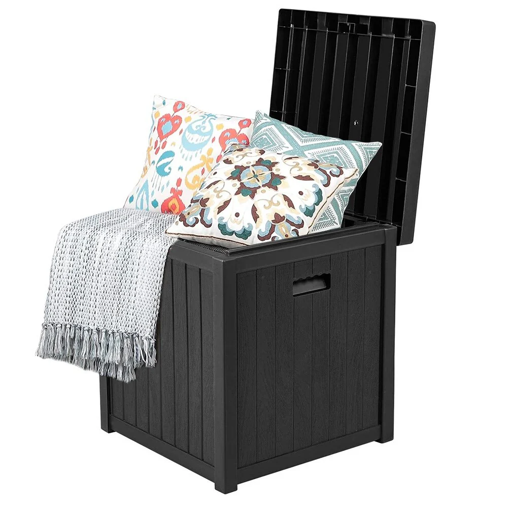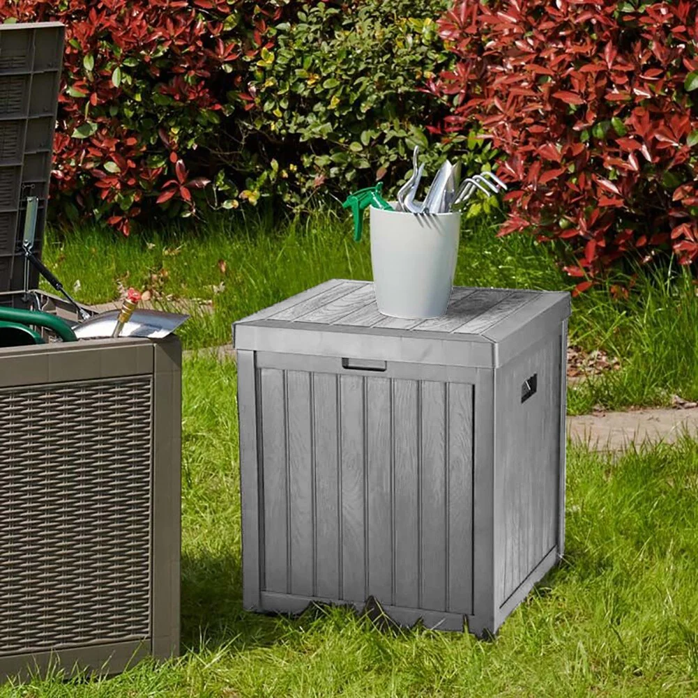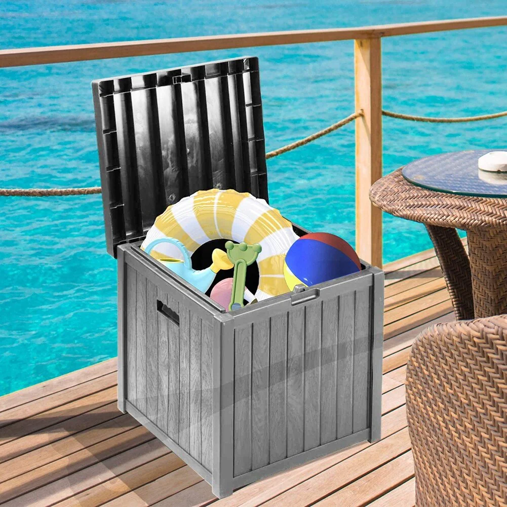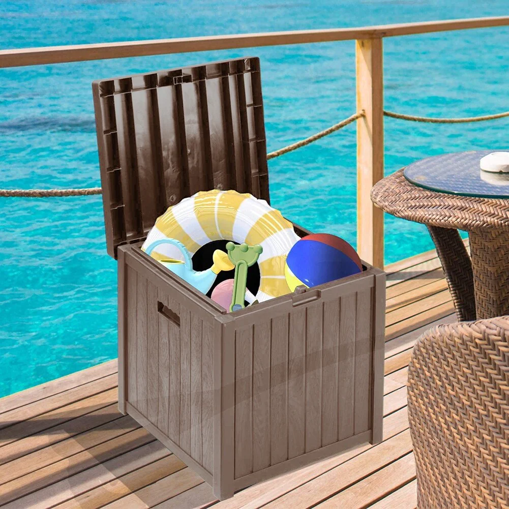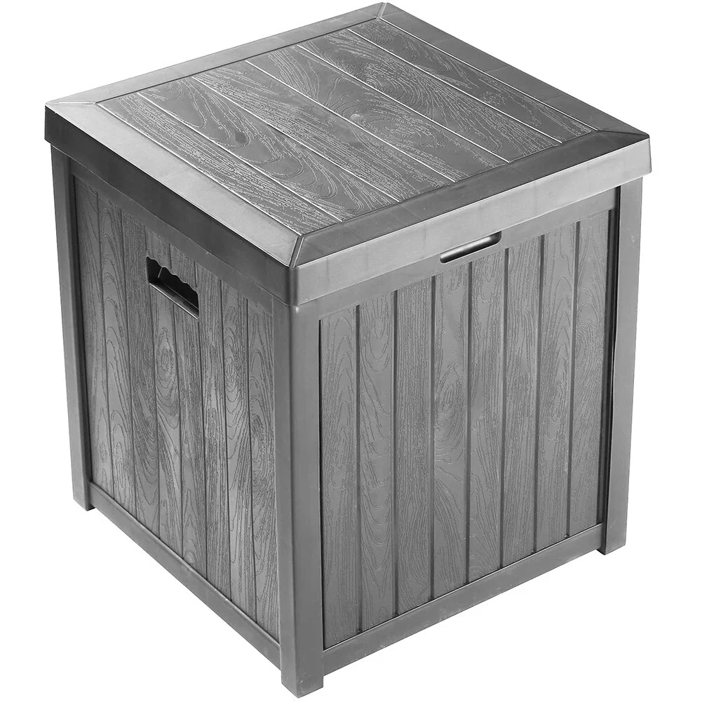The Modern Home La Jolla Weatherproof Outdoor 51 Gallon Storage Deck Box w/Lid provides a generous amount of space to neatly store your outdoor pillow, furniture cushions, garden accessories, pool toys and more. Constructed of durable, weatherproof resin, each deck bin features a hinged lid that keeps the rain out and the contents protected year-round. Our deck box features a wood grain finish that is resistant to fading, and peeling and is durable to last for many years. also serves as a perfect outdoor ottoman as it is easily movable with built-in handles for easy lifting. Use it as a simple storage ottoman anywhere you need it. No tools are required for easy assembly in only a few minutes. Measures 22" x 22" x 24".