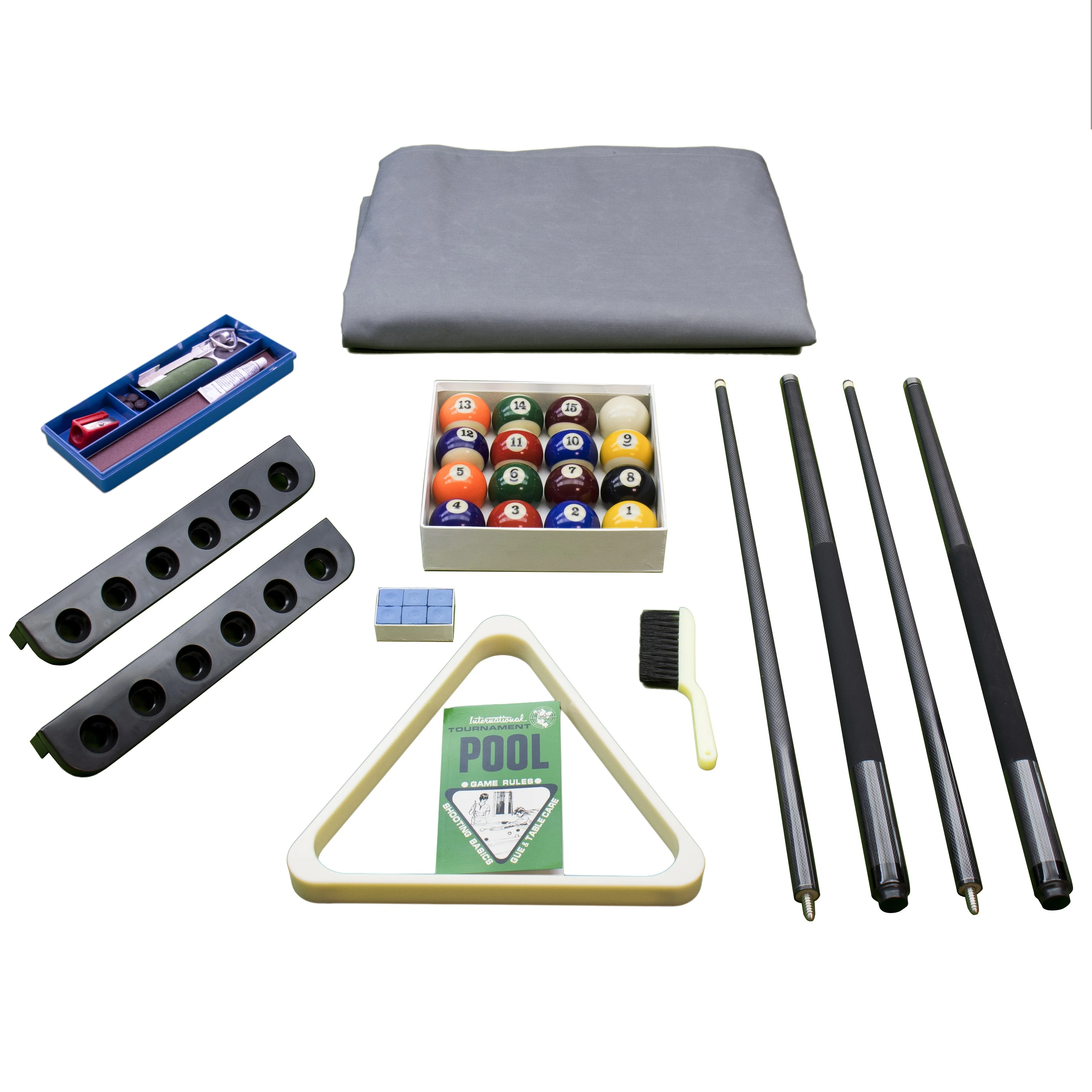 • Includes pool accessories such as two cue sticks, cue rack, set of billiard balls, triangle, table brush, box of cue tip chalk, and cover for table
