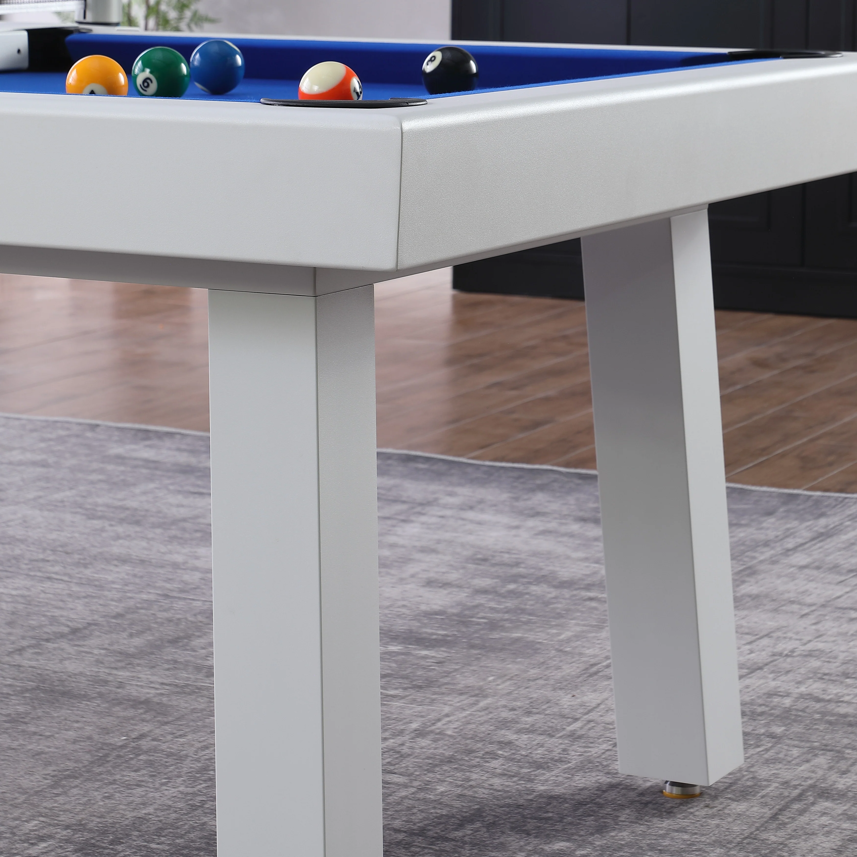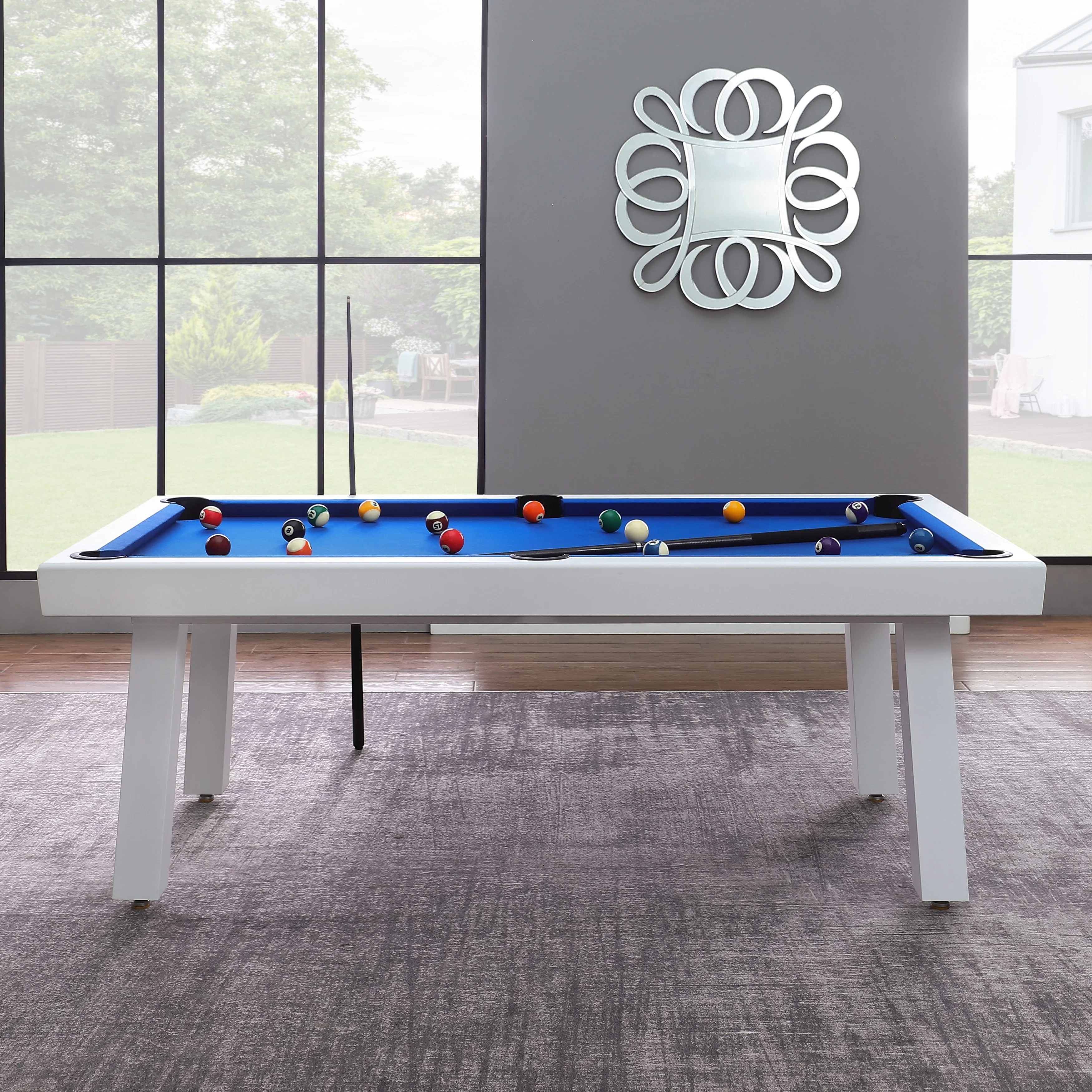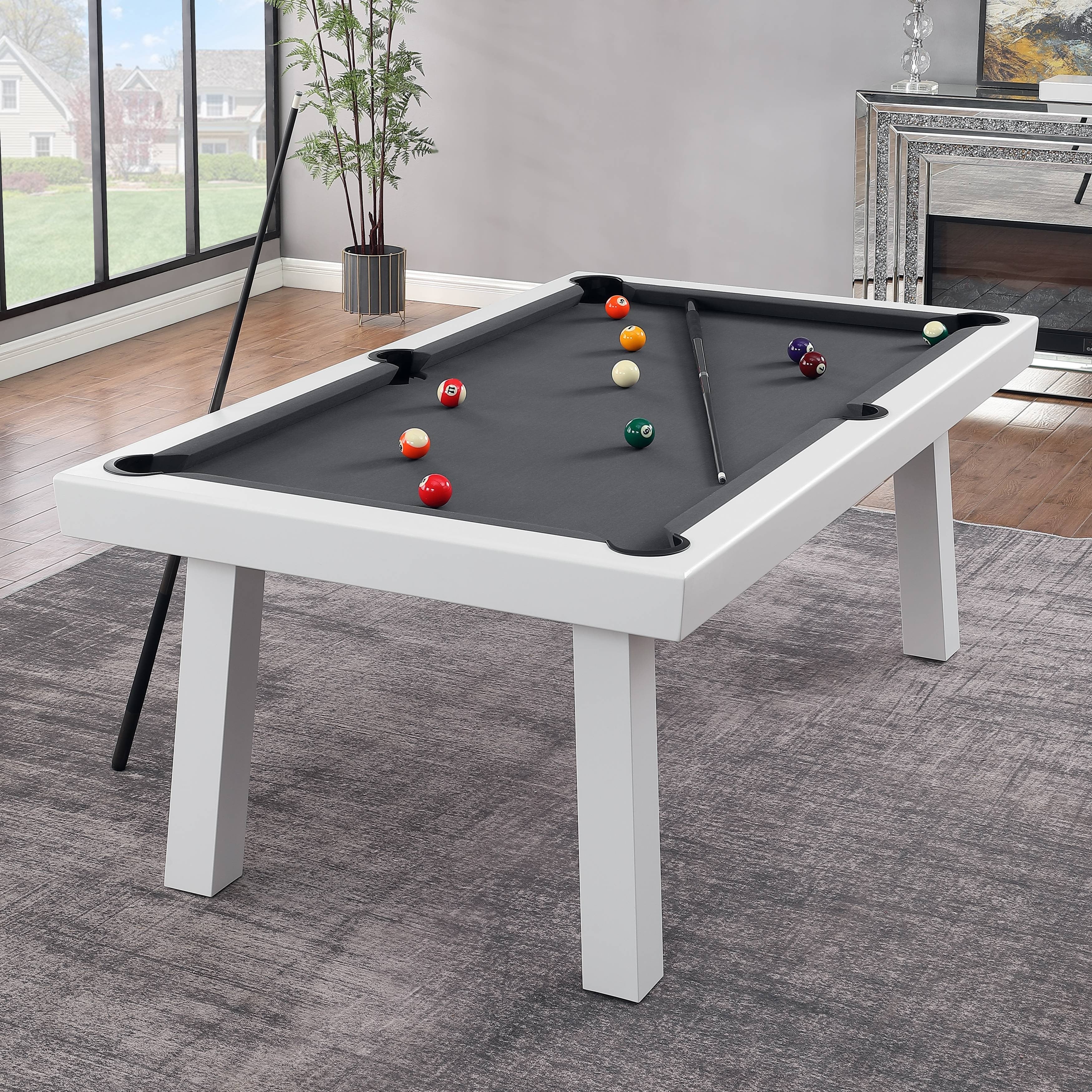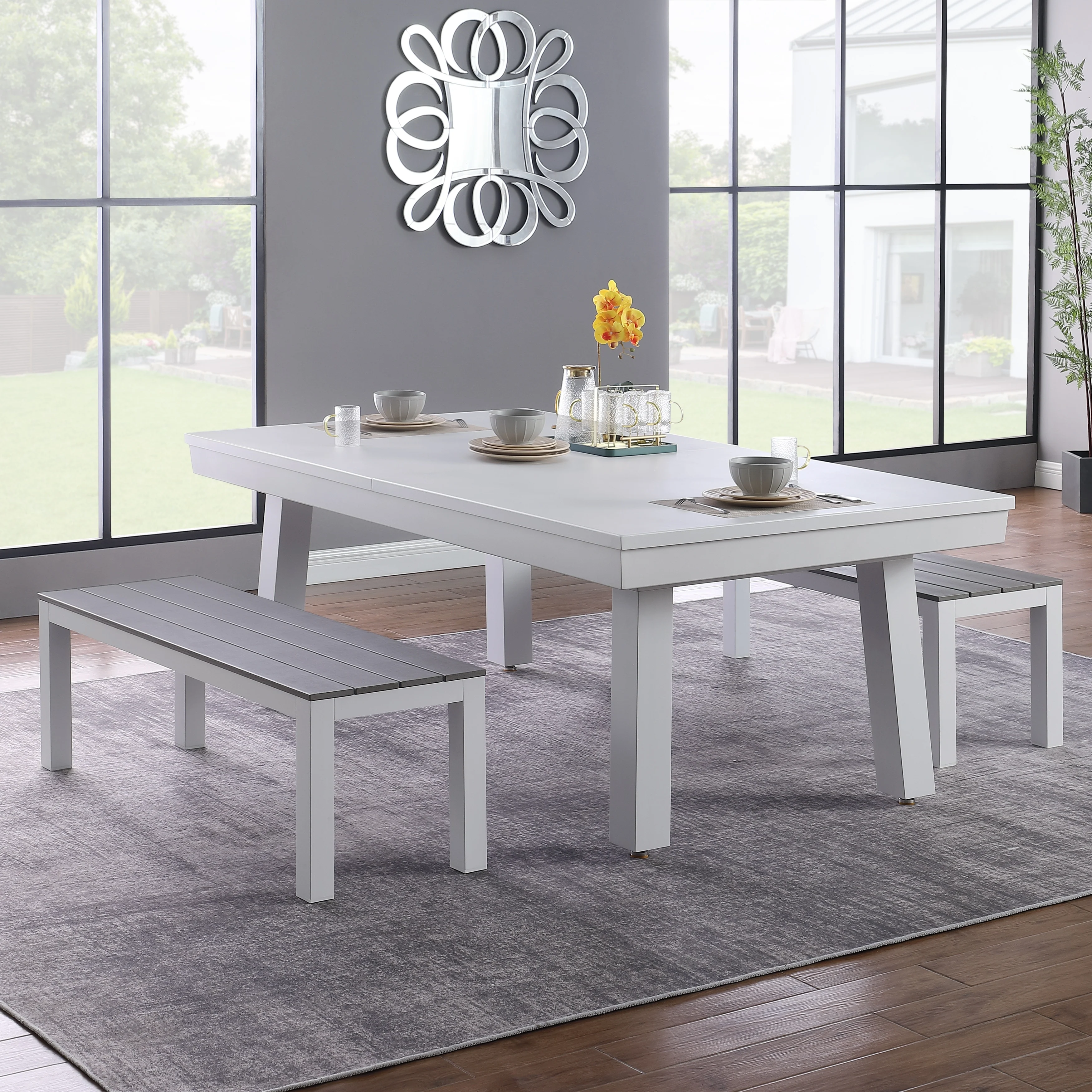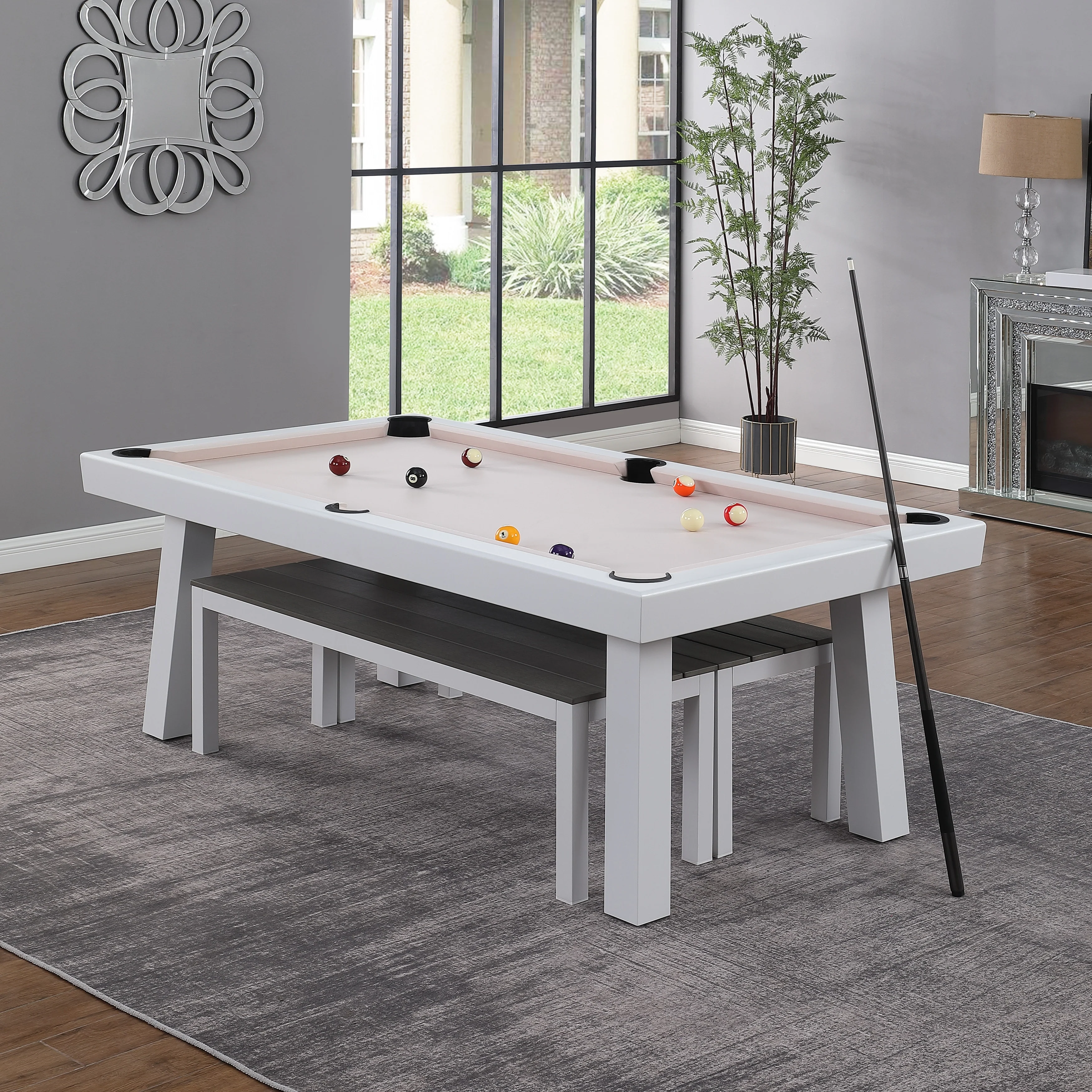 Get ready to add some excitement to your game nights with this modern Laguna Indoor/Outdoor 7ft Billiards Pool Table Dining Set. Built with an aluminum frame and a powder-coated finish, this pool table can withstand any type of weather and makes a stylish statement with its contemporary white finish. This multi-functional table converts to a dining table, and the included slatted gray faux wood bench seats complete the fresh and modern look. You can also double the fun with the included table tennis set. This set includes everything you need for an entertaining night at home, including a pool table cover and a pool accessories kit with two cue sticks.