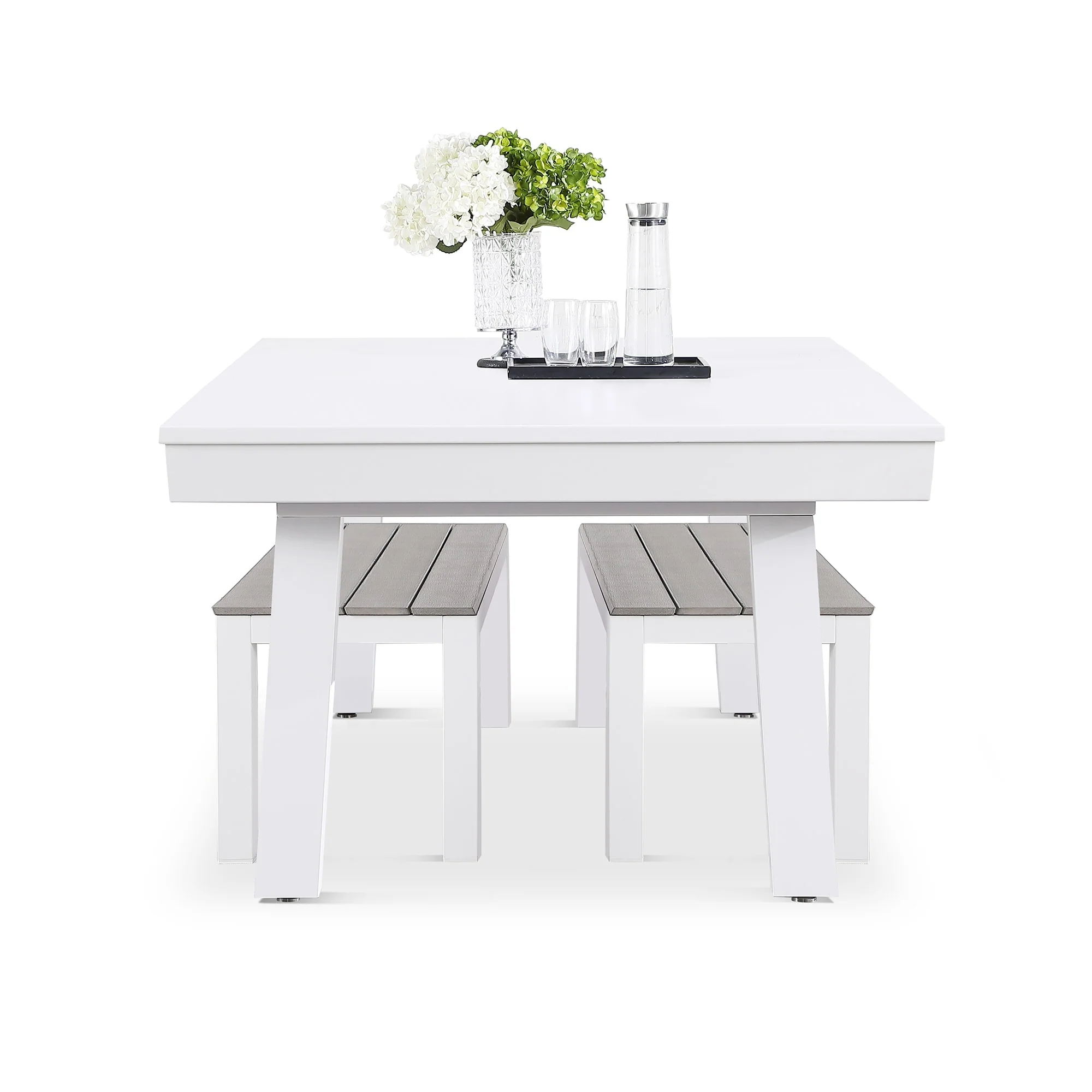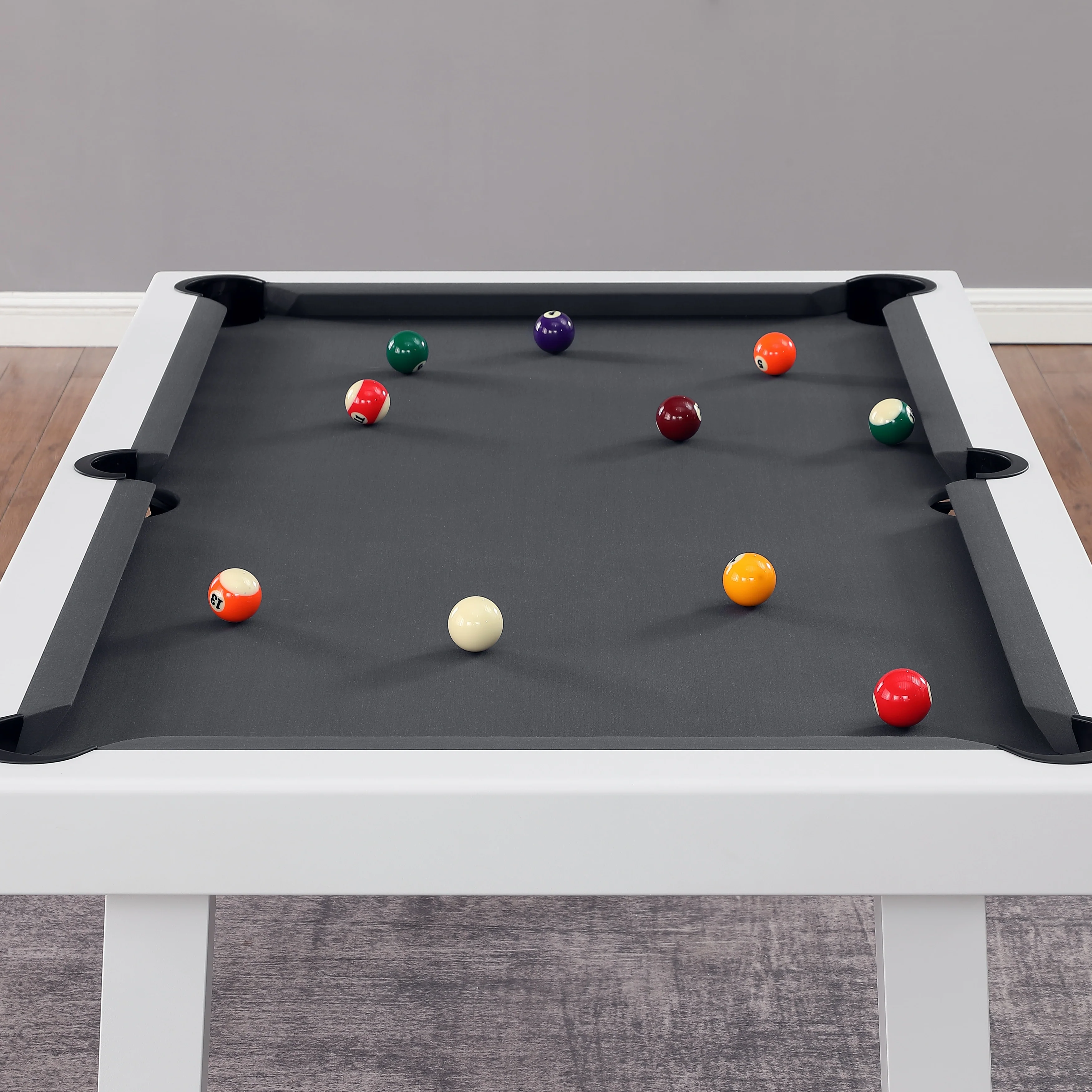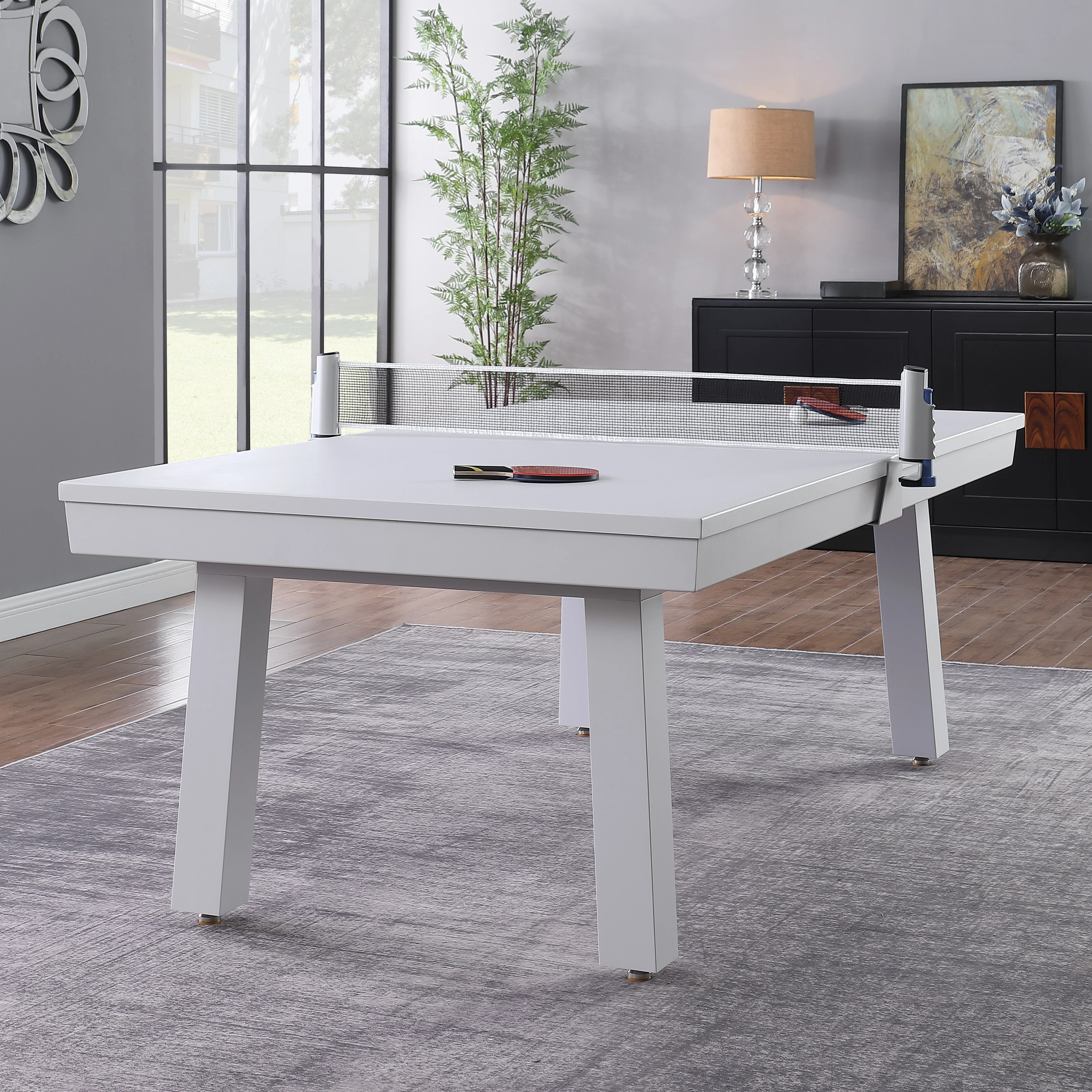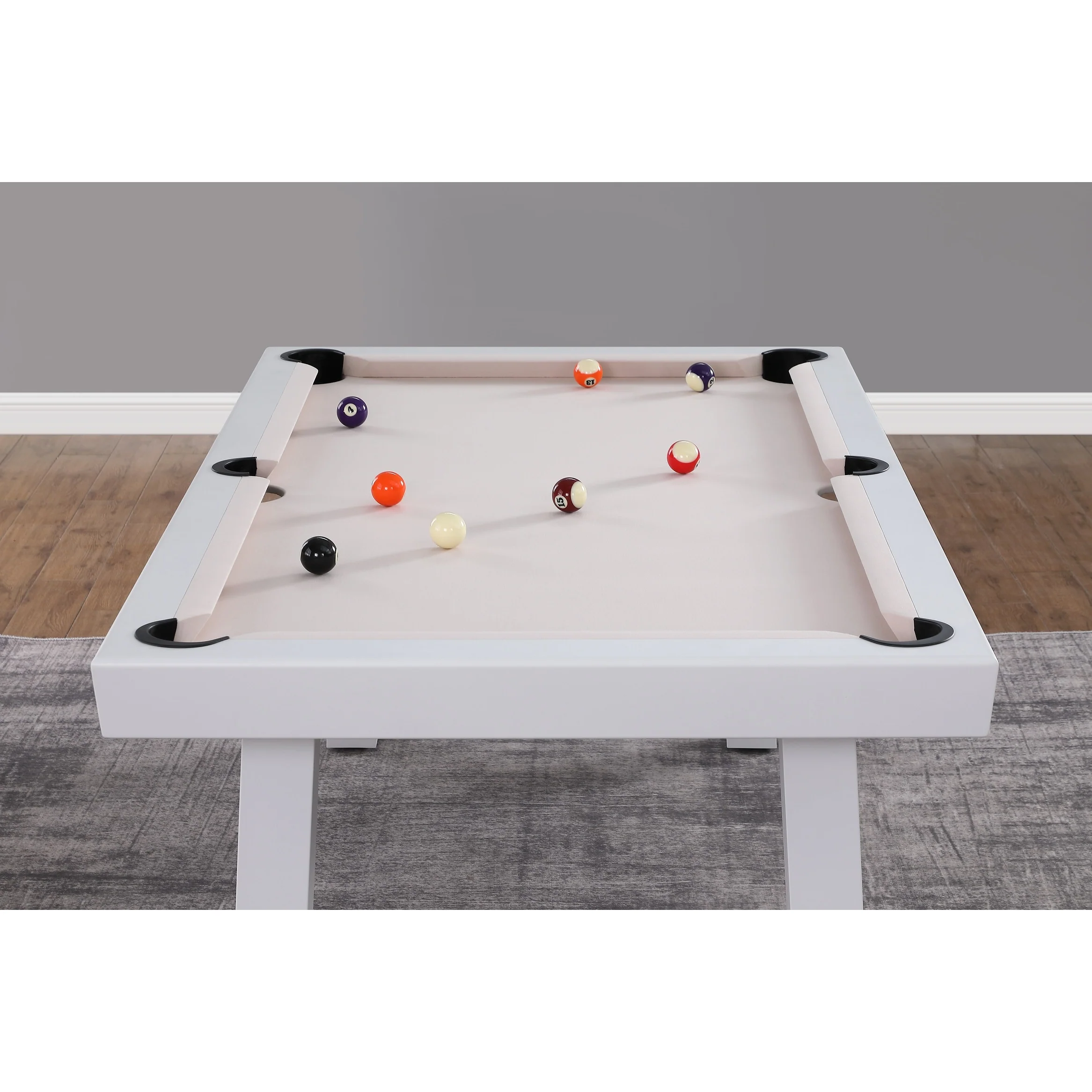 Get ready to add some excitement to your game nights with this modern Laguna Indoor/Outdoor 7ft Billiards Pool Table Dining Set. Built with an aluminum frame and a powder-coated finish, this pool table can withstand any type of weather and makes a stylish statement with its contemporary white finish. This multi-functional table converts to a dining table, and the included slatted gray faux wood bench seats complete the fresh and modern look. You can also double the fun with the included table tennis set. This set includes everything you need for an entertaining night at home, including a pool table cover and a pool accessories kit with two cue sticks.
