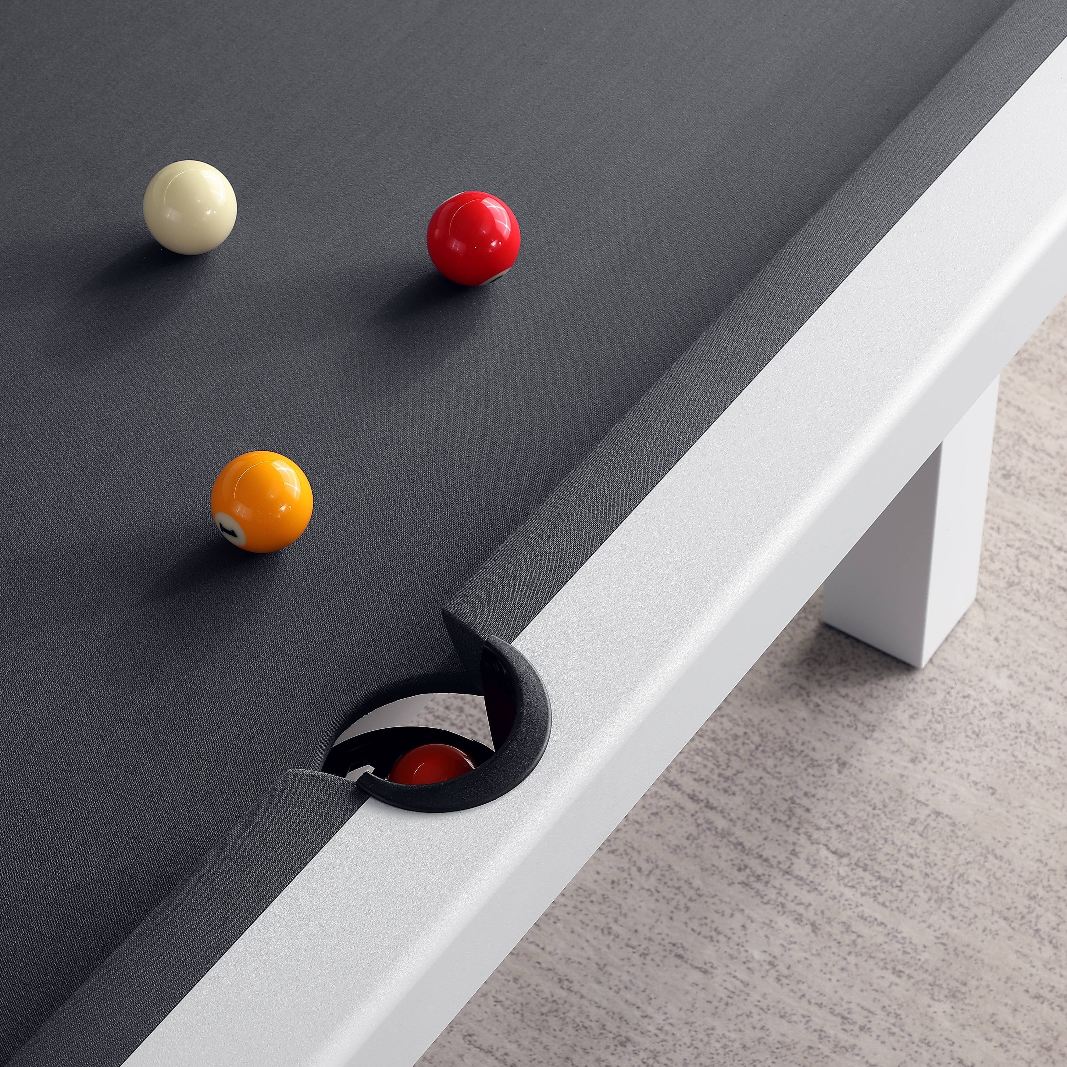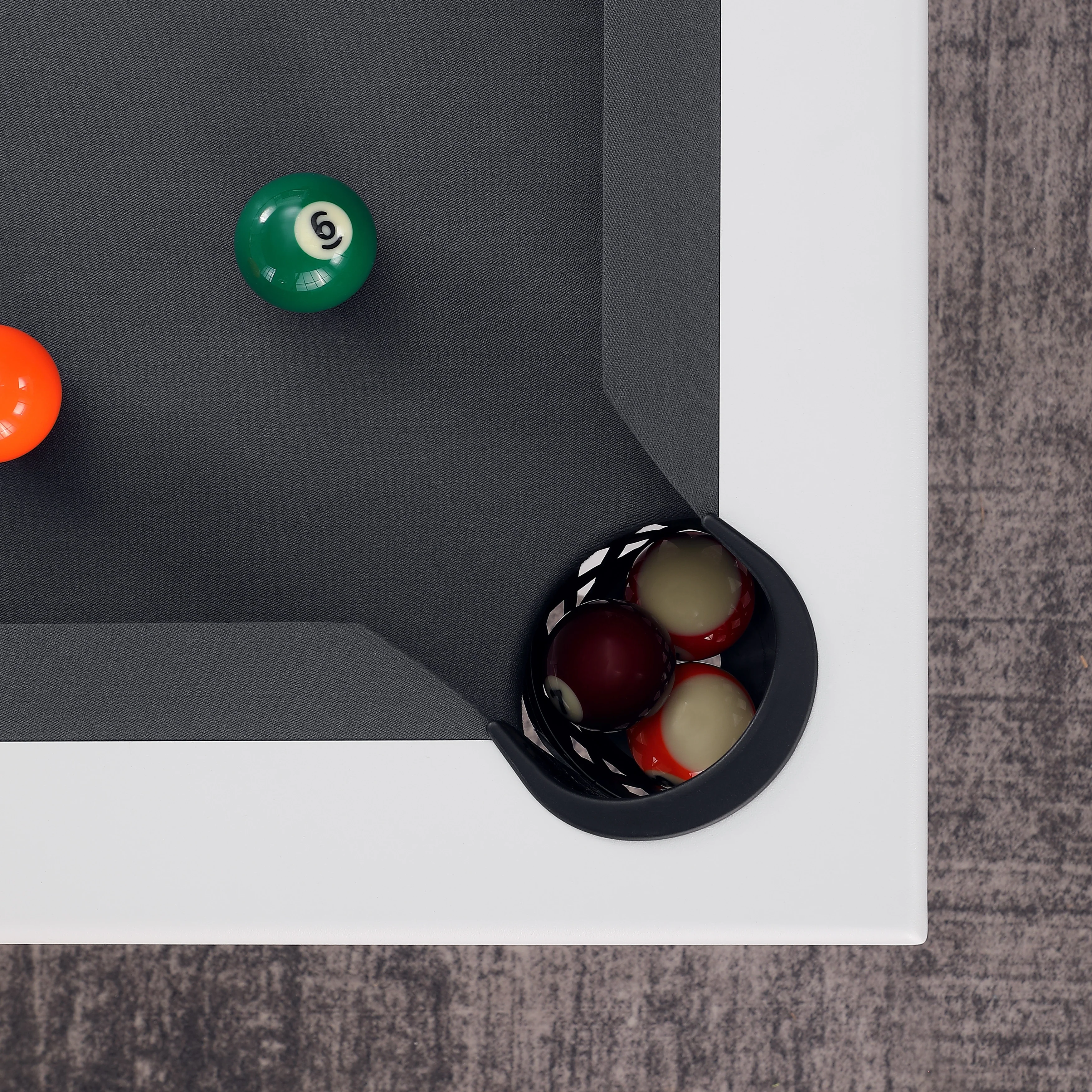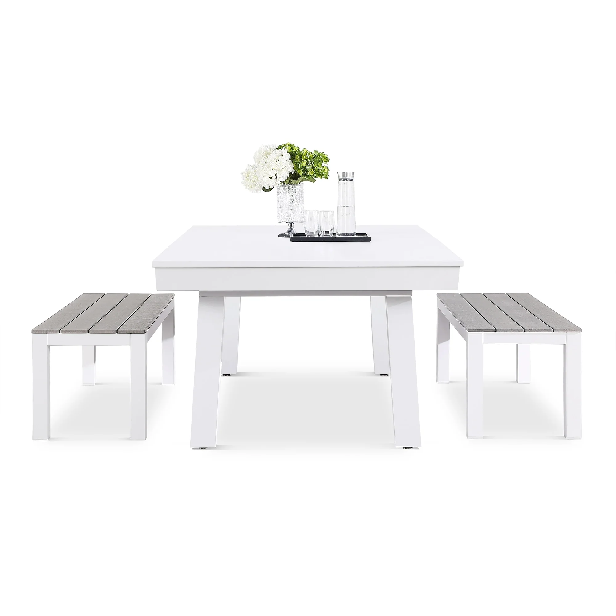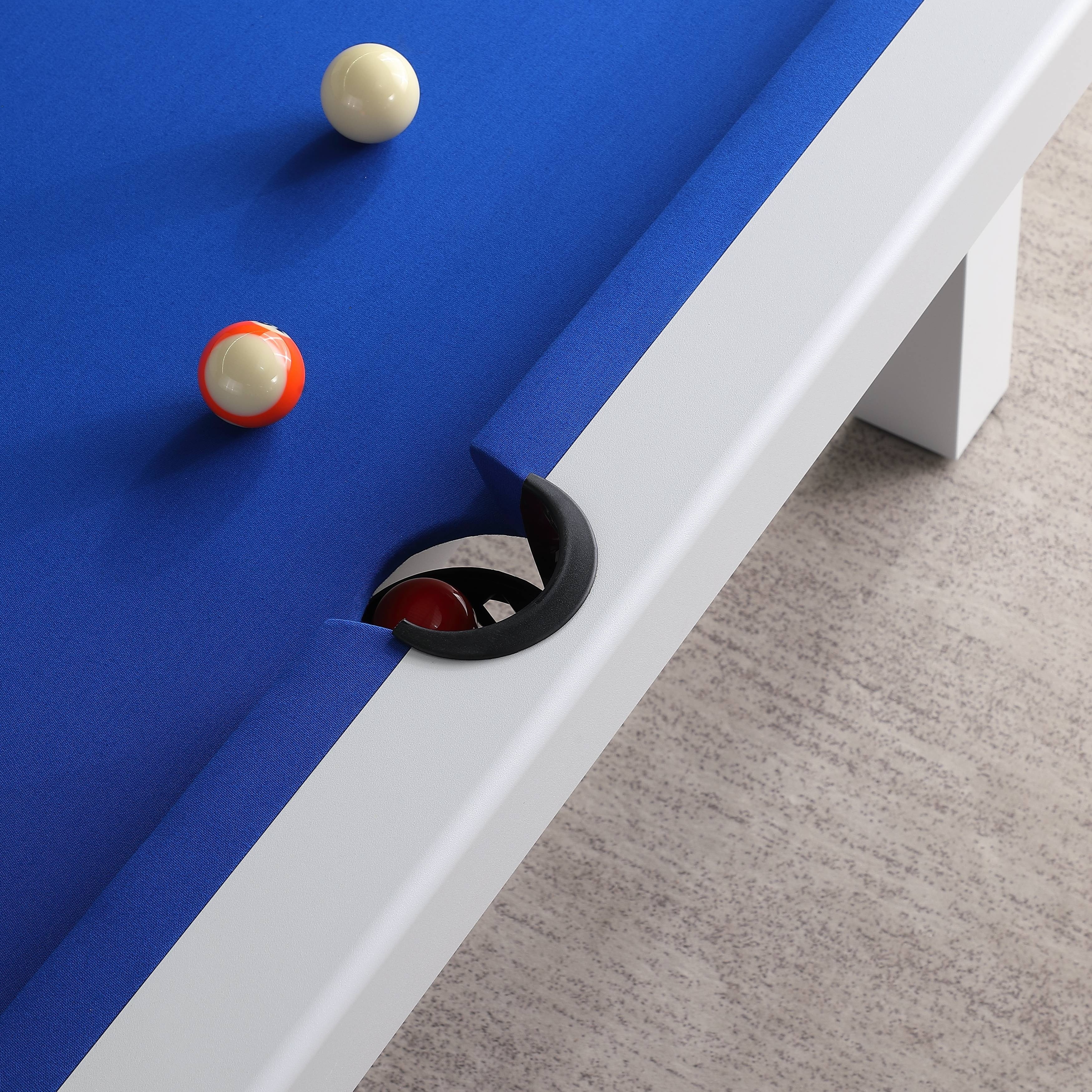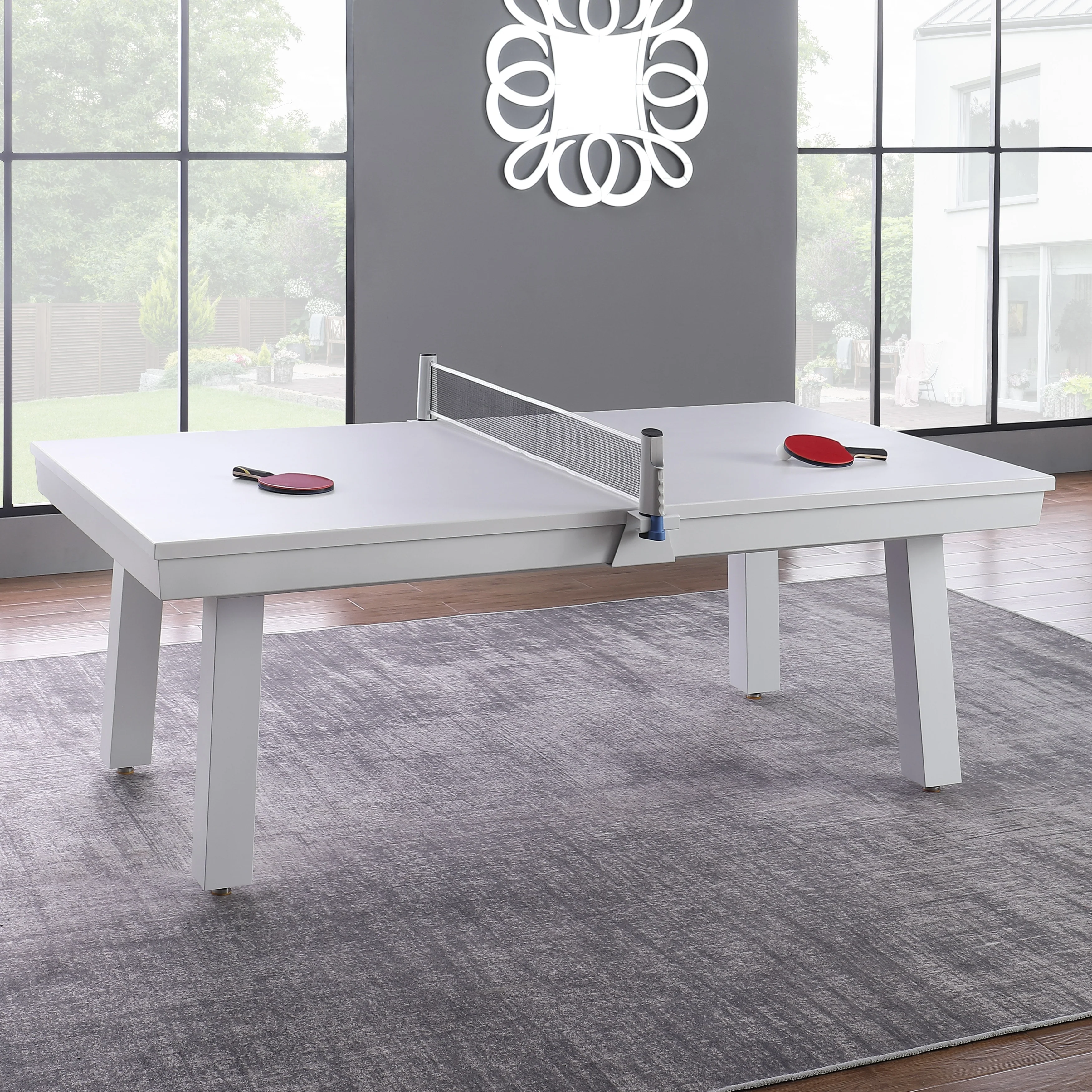 Get ready to add some excitement to your game nights with this modern Laguna Indoor/Outdoor 7ft Billiards Pool Table Dining Set. Built with an aluminum frame and a powder-coated finish, this pool table can withstand any type of weather and makes a stylish statement with its contemporary white finish. This multi-functional table converts to a dining table, and the included slatted gray faux wood bench seats complete the fresh and modern look. You can also double the fun with the included table tennis set. This set includes everything you need for an entertaining night at home, including a pool table cover and a pool accessories kit with two cue sticks.
