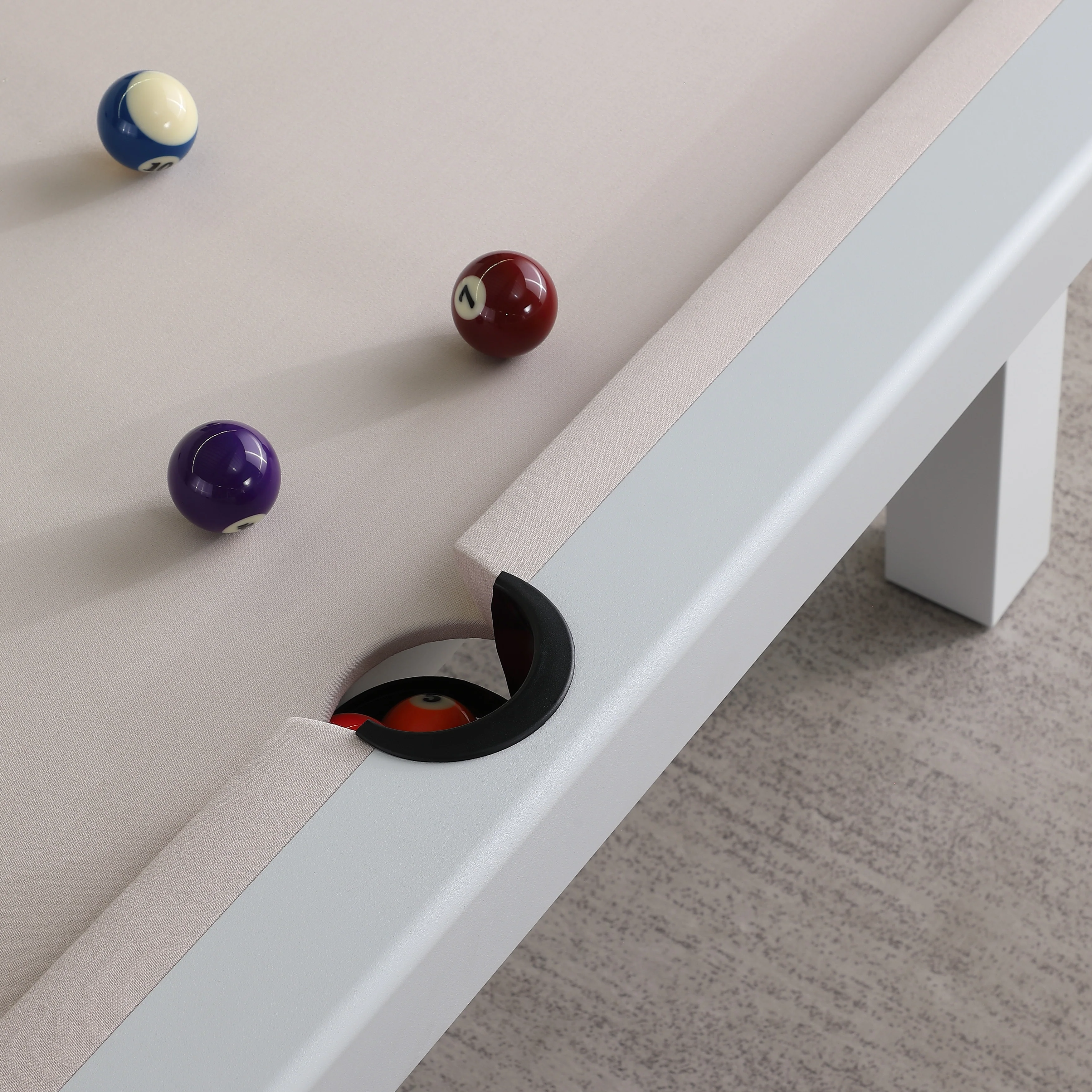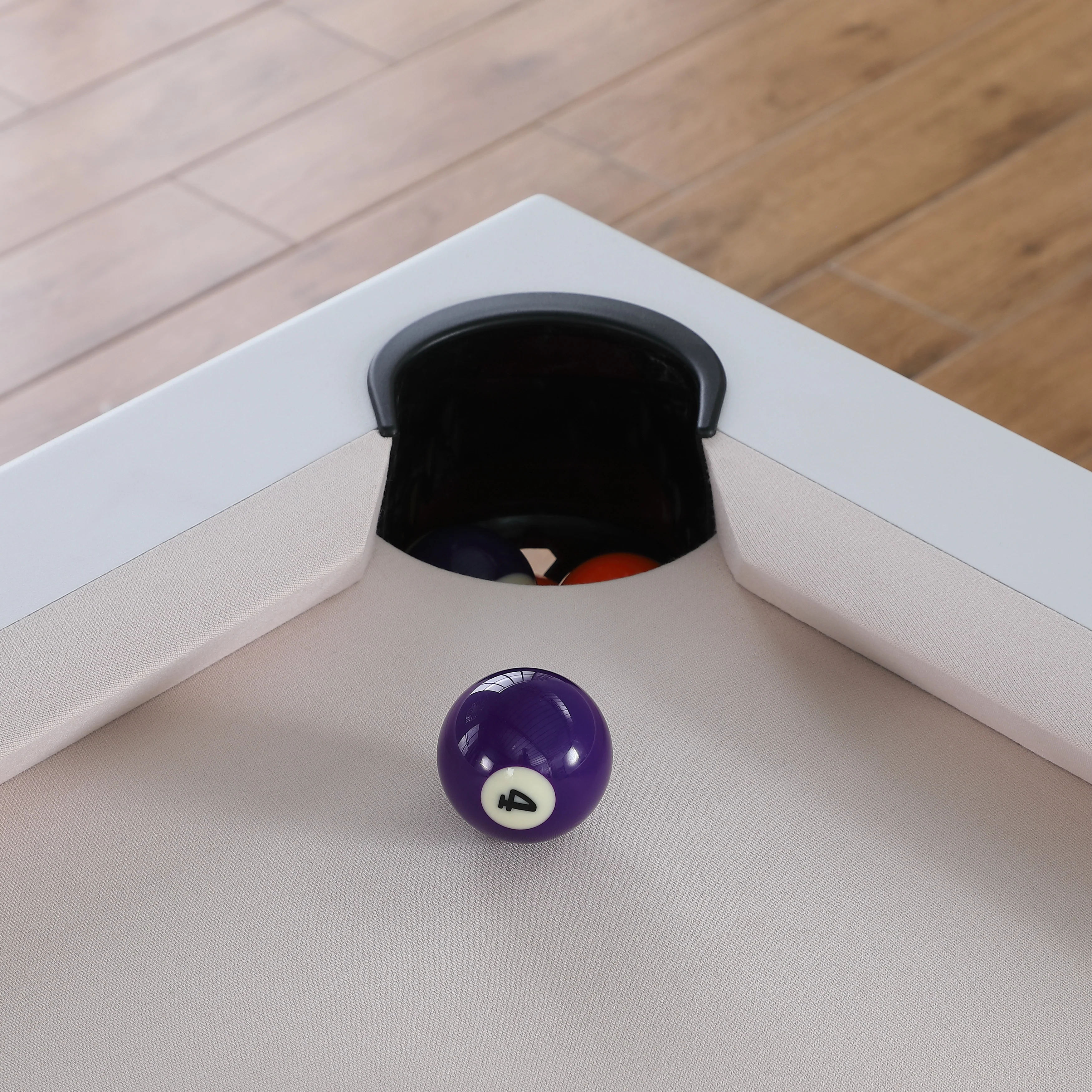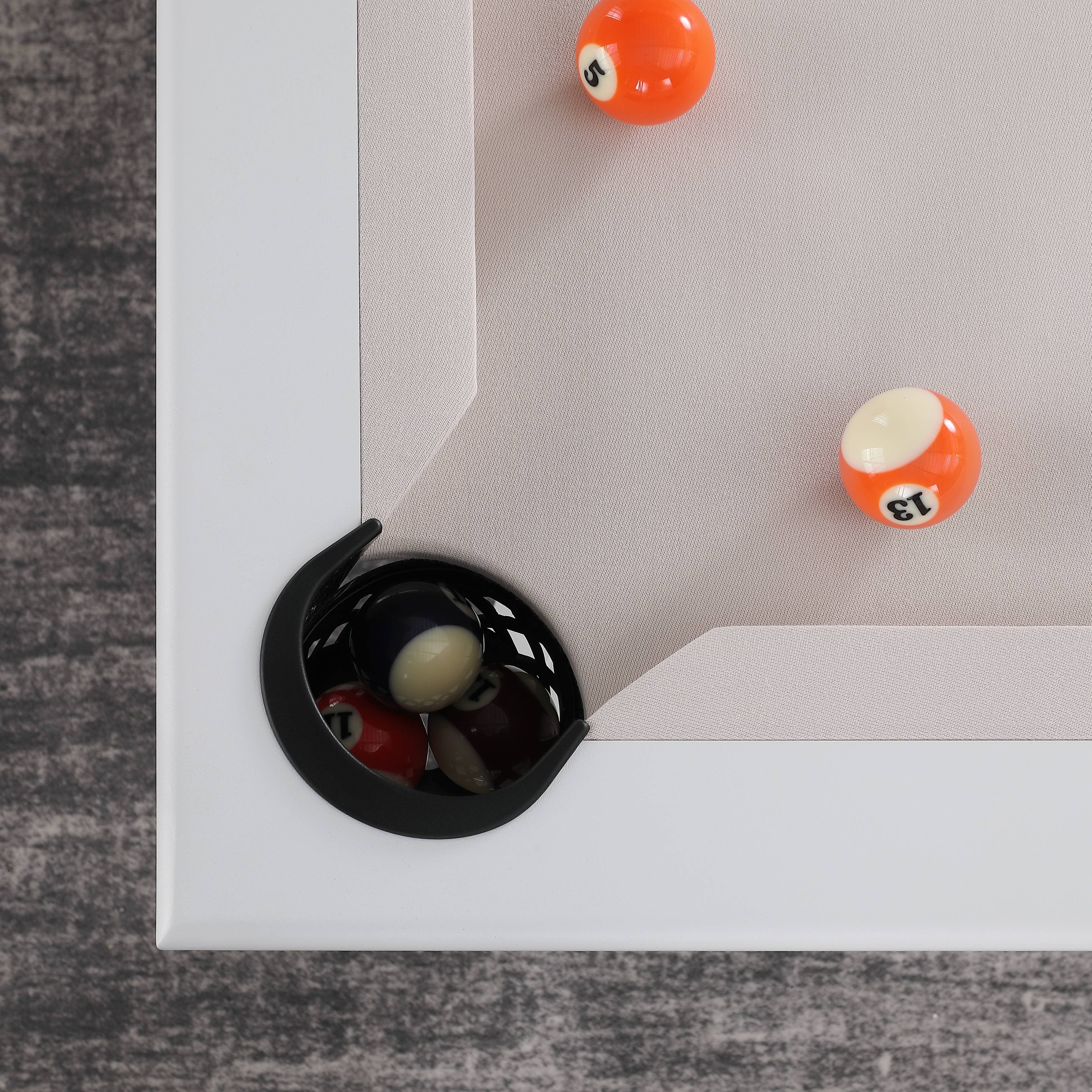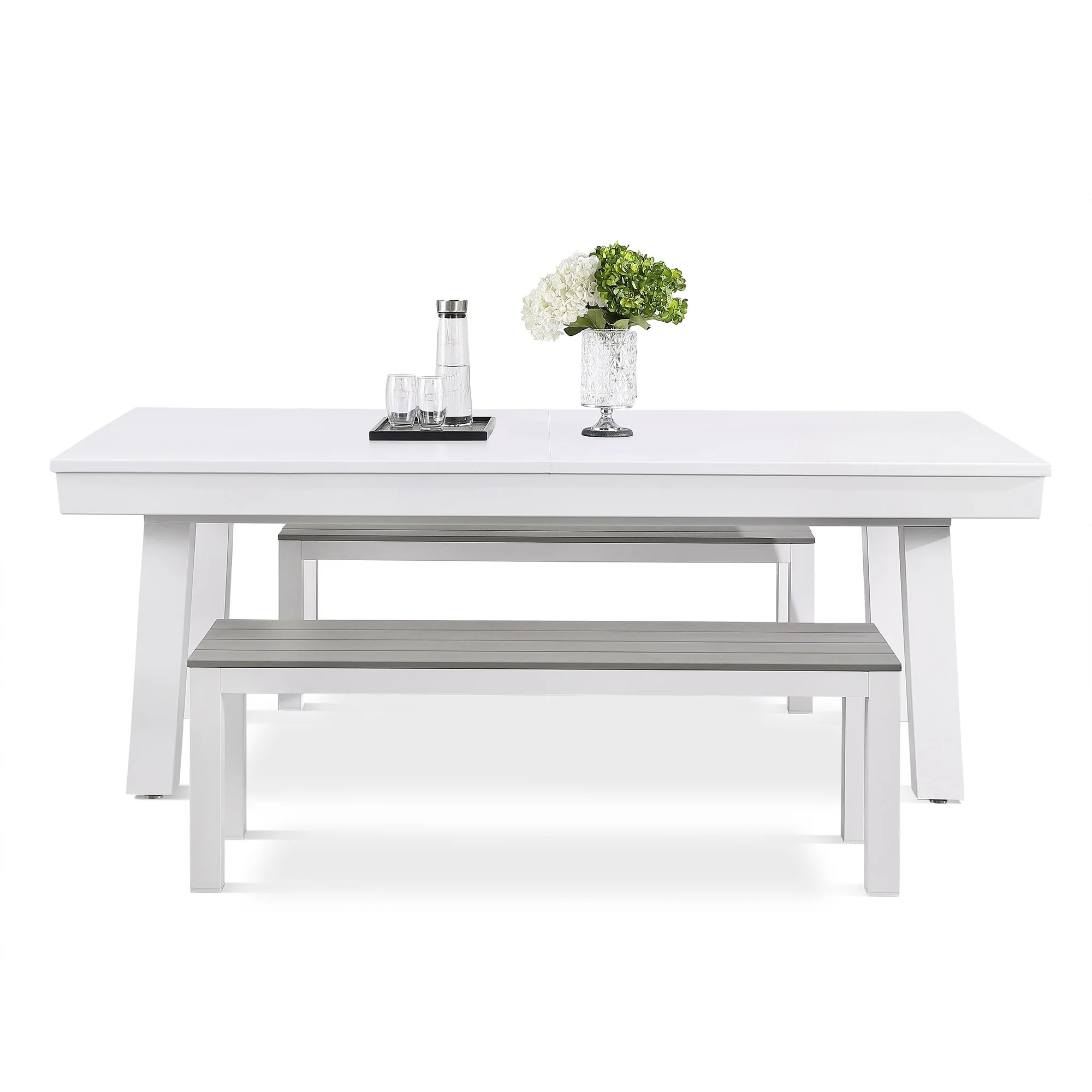 Get ready to add some excitement to your game nights with this modern Laguna Indoor/Outdoor 7ft Billiards Pool Table Dining Set. Built with an aluminum frame and a powder-coated finish, this pool table can withstand any type of weather and makes a stylish statement with its contemporary white finish. This multi-functional table converts to a dining table, and the included slatted gray faux wood bench seats complete the fresh and modern look. You can also double the fun with the included table tennis set. This set includes everything you need for an entertaining night at home, including a pool table cover and a pool accessories kit with two cue sticks.