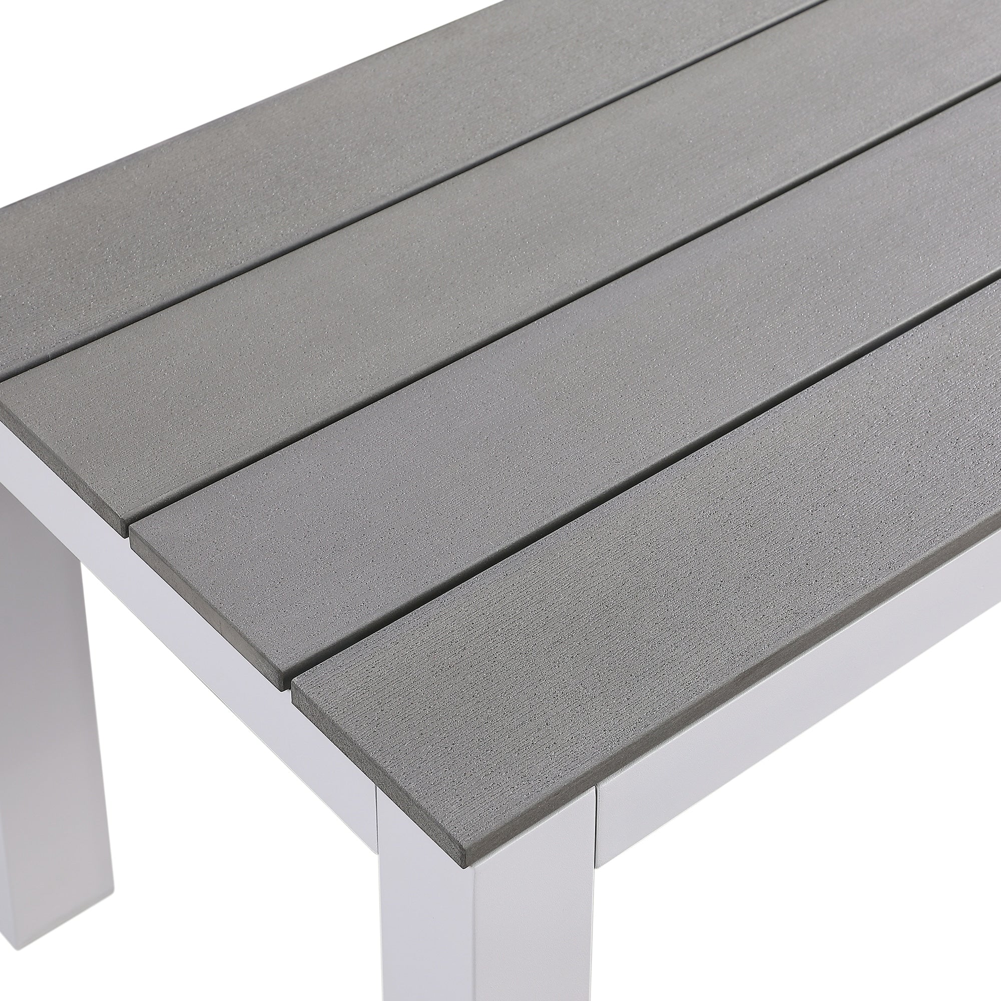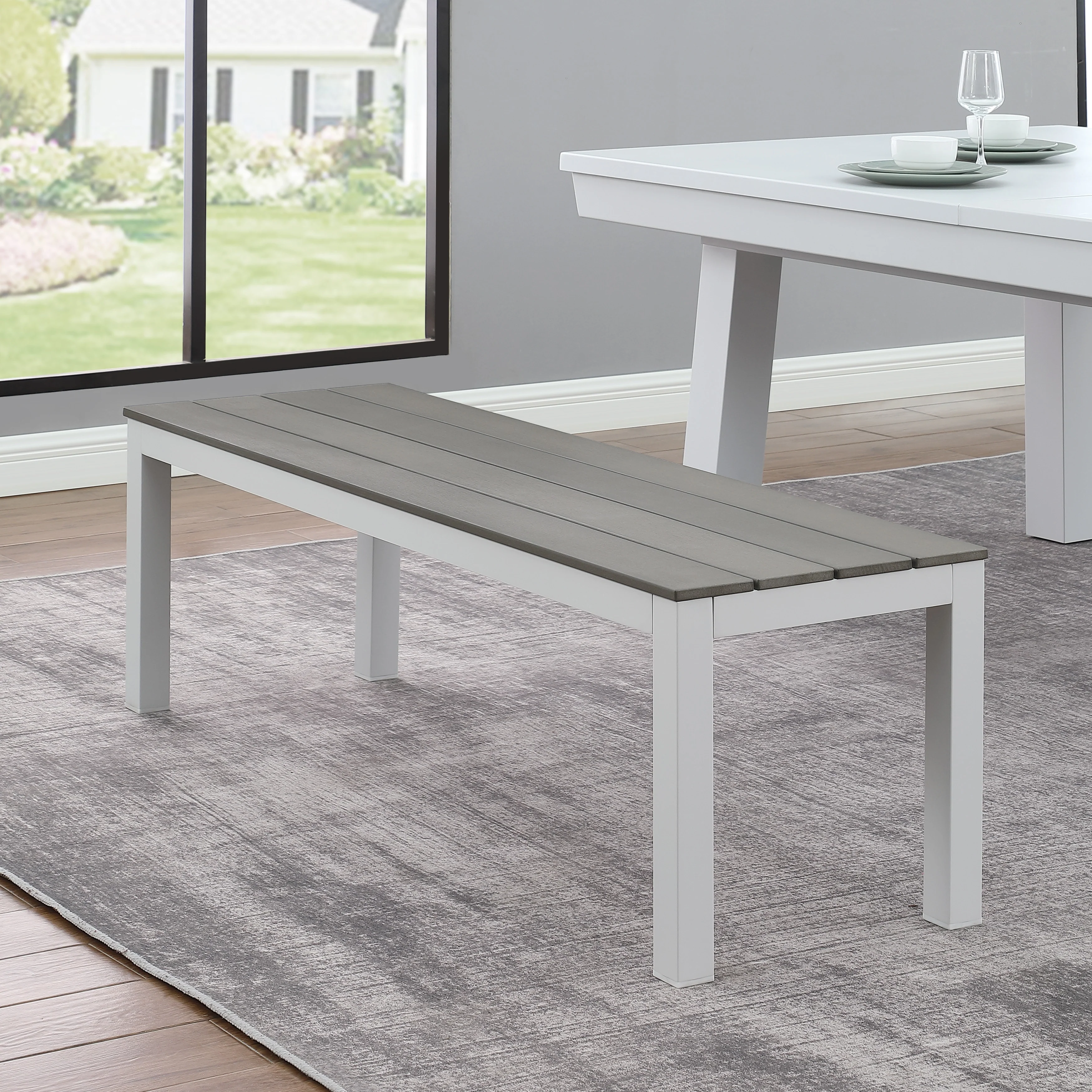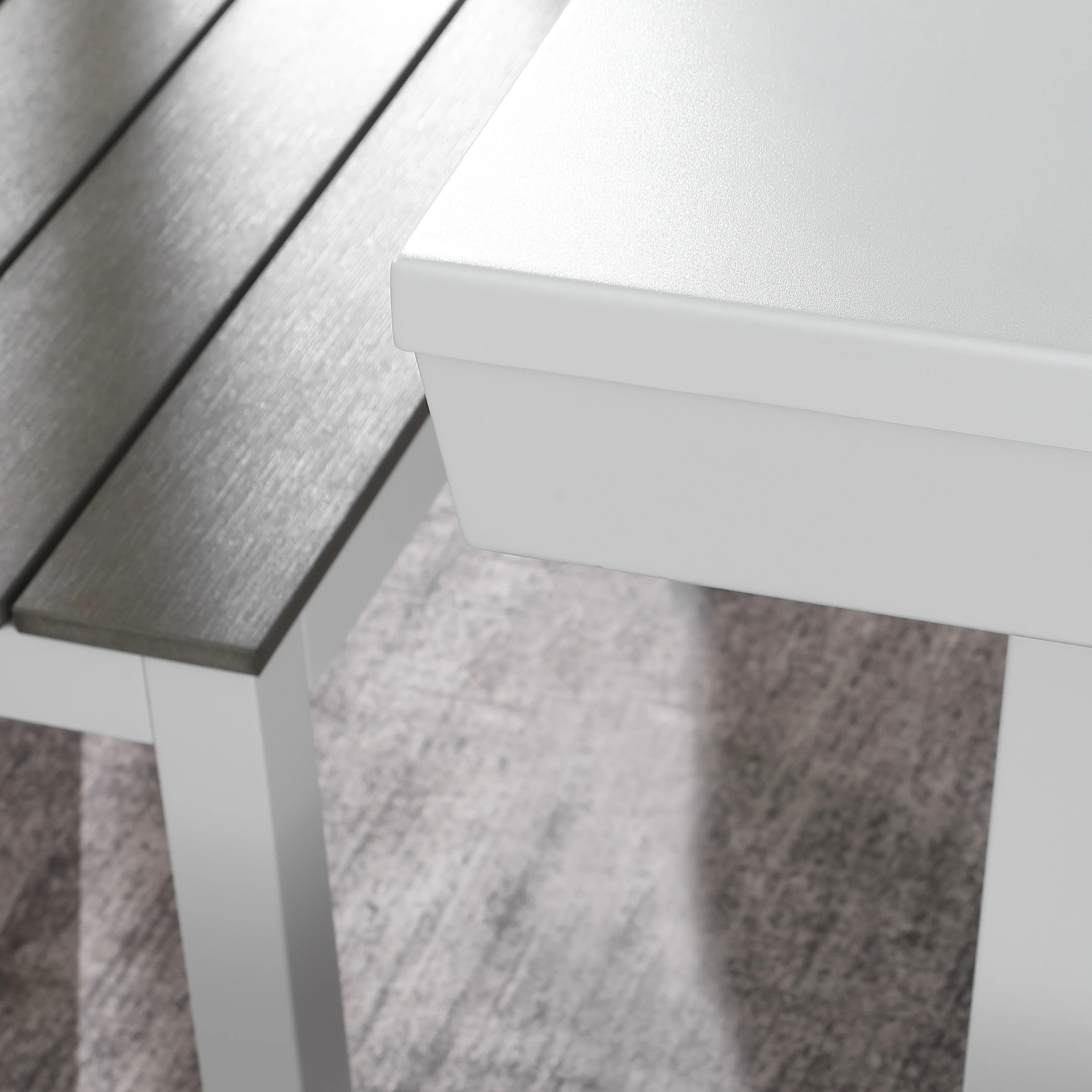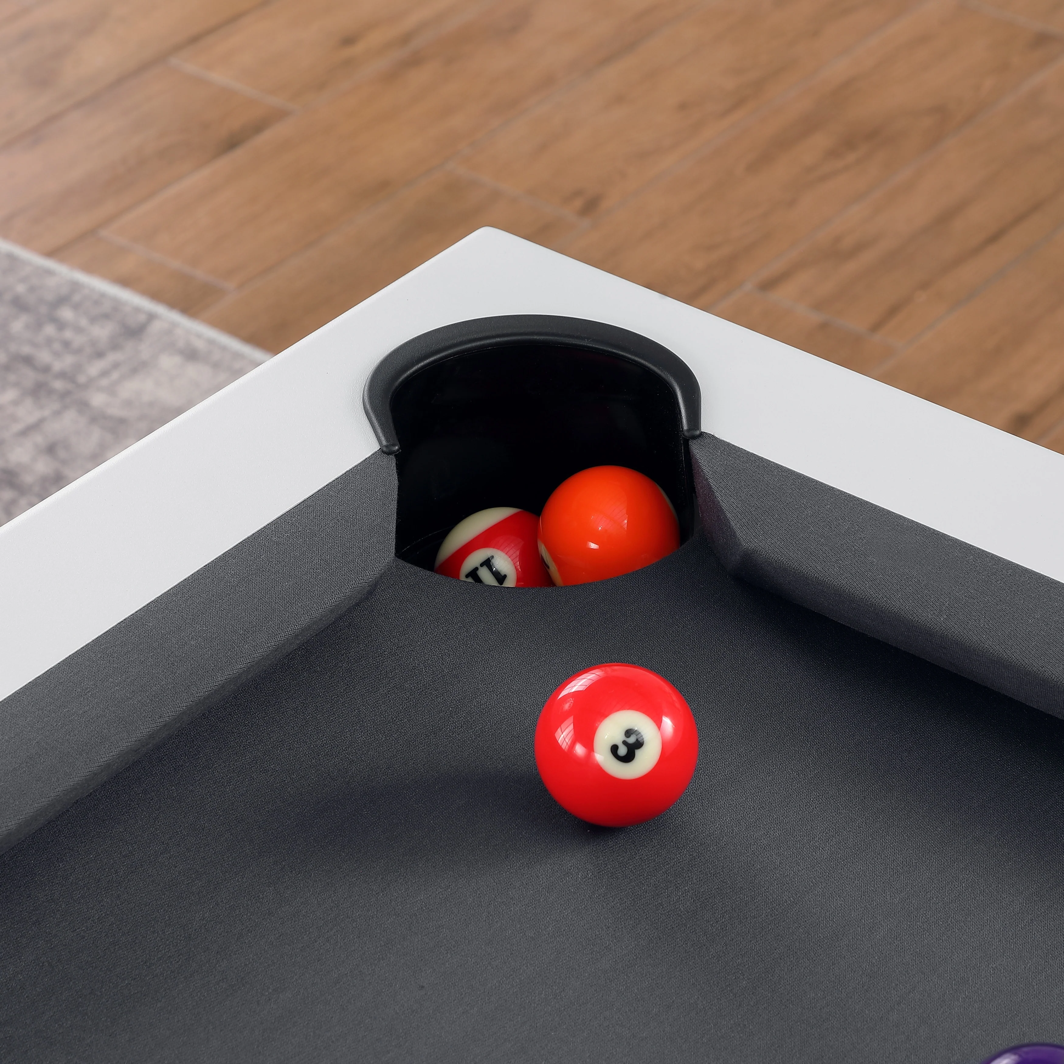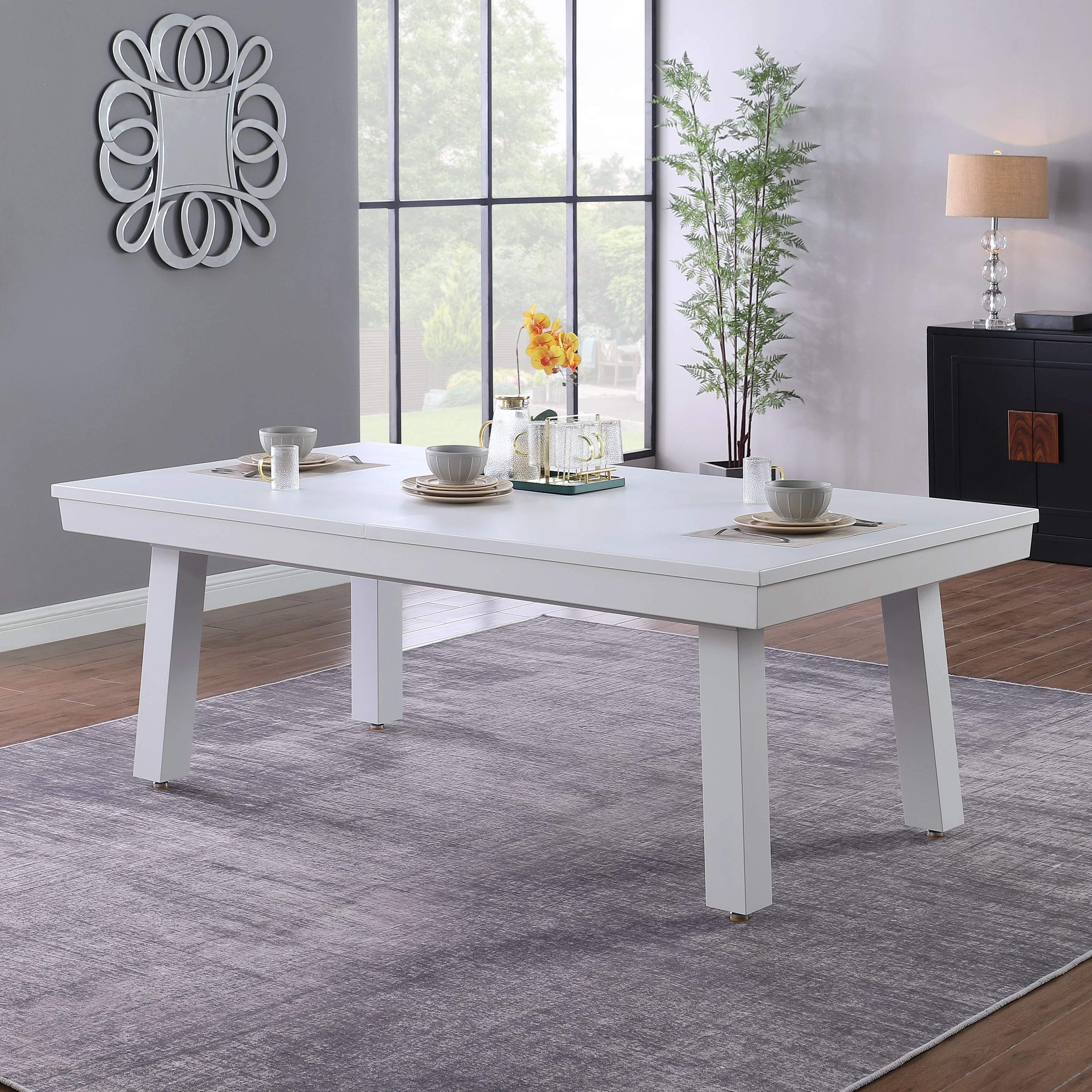 Get ready to add some excitement to your game nights with this modern Laguna Indoor/Outdoor 7ft Billiards Pool Table Dining Set. Built with an aluminum frame and a powder-coated finish, this pool table can withstand any type of weather and makes a stylish statement with its contemporary white finish. This multi-functional table converts to a dining table, and the included slatted gray faux wood bench seats complete the fresh and modern look. You can also double the fun with the included table tennis set. This set includes everything you need for an entertaining night at home, including a pool table cover and a pool accessories kit with two cue sticks.