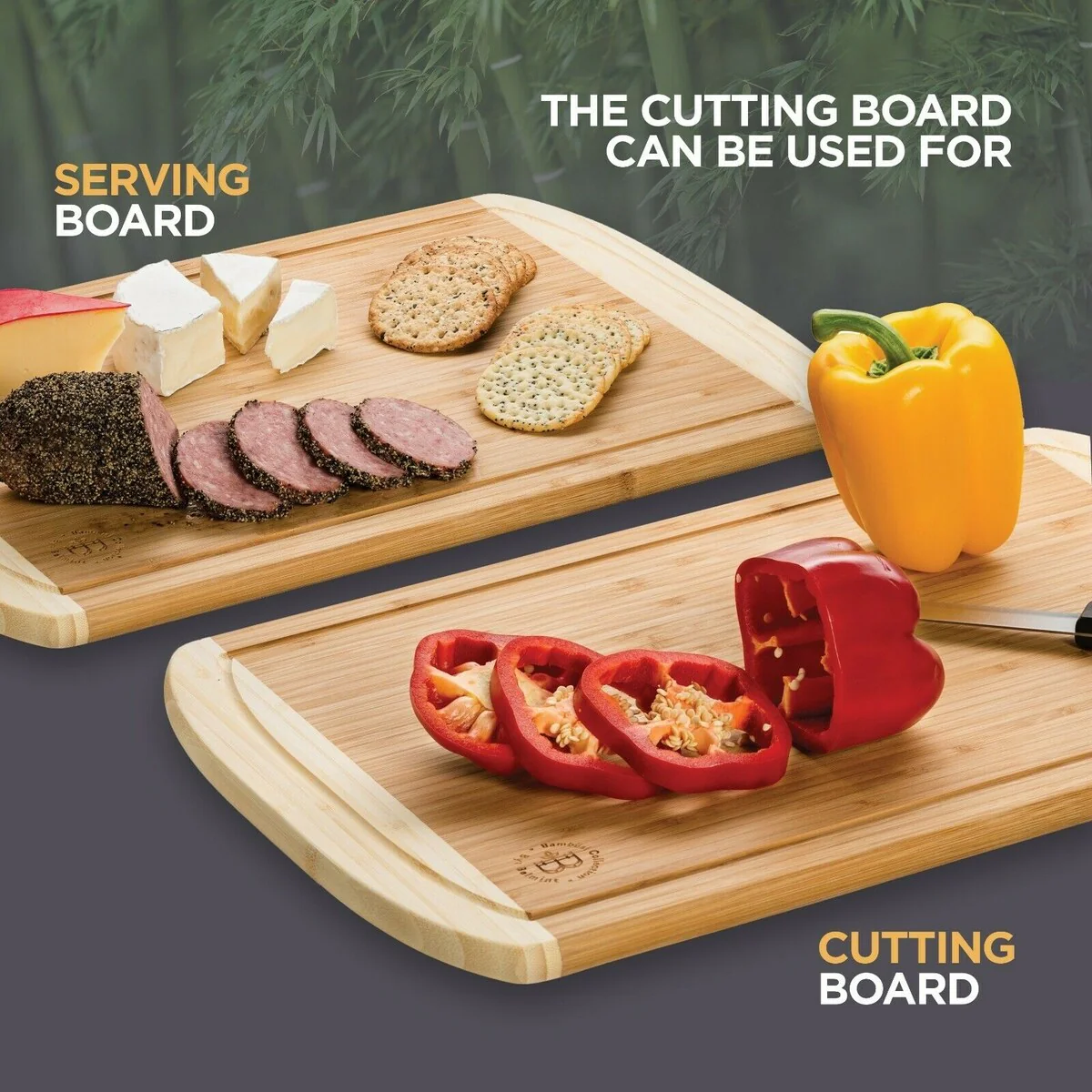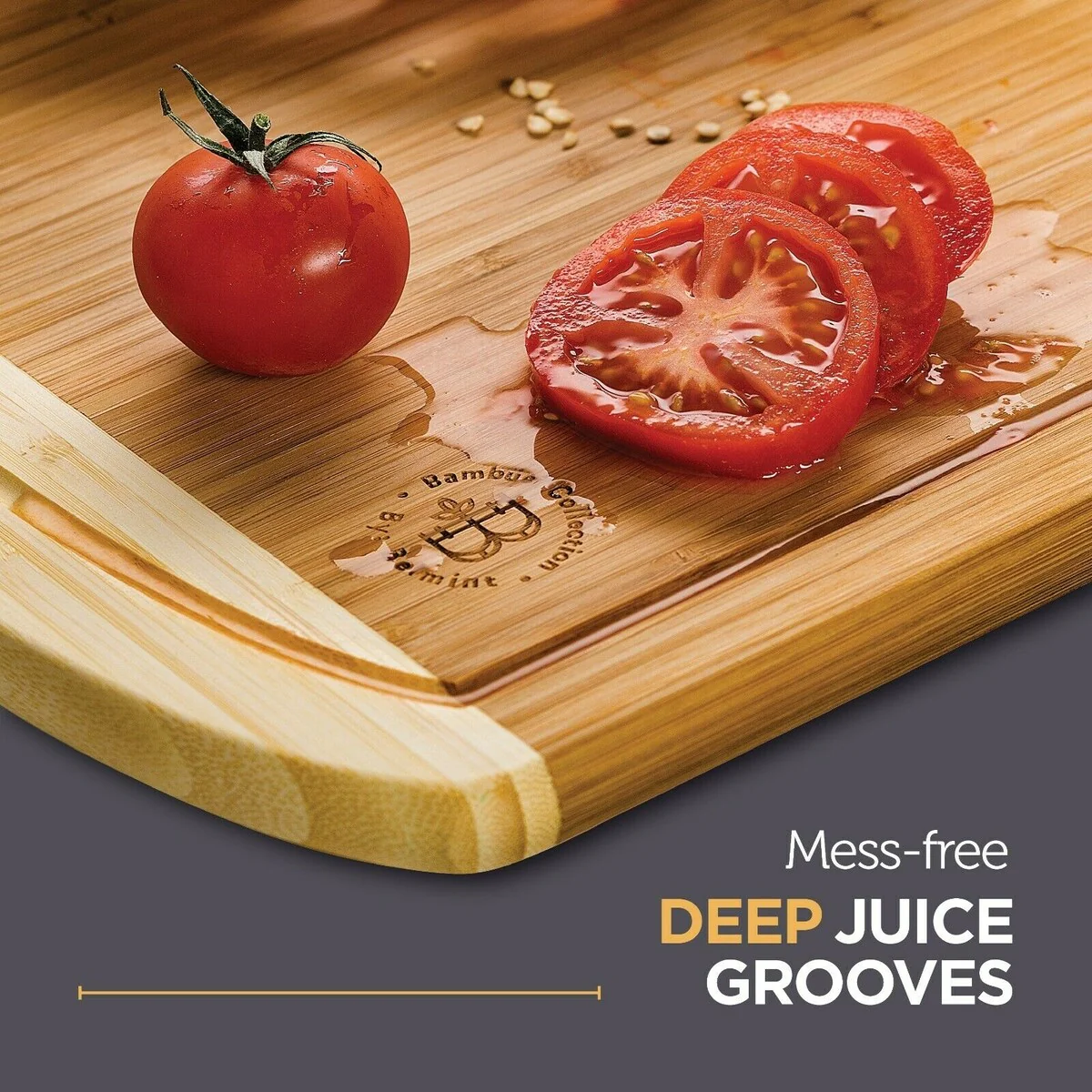 Upgrade your culinary game with this premium cutting board from Bambüsi. Crafted from environmentally-friendly Moso bamboo, this combination board with groove allows you to prep, cut, arrange, and present food on one platter. The sturdy, non-porous material repels dangerous bacteria for optimal food safety, while the oversized 2" ridge catches liquid for easy cleanup. Measuring at 12 W. x 18 L. x 3/4 H. inches, this visually striking platter is not only perfect for entertaining guests but also as a gorgeous decorative piece on your countertop. Add this attractive, durable, and natural cutting board to your collection of Bambüsi by Belmint bamboo products today.