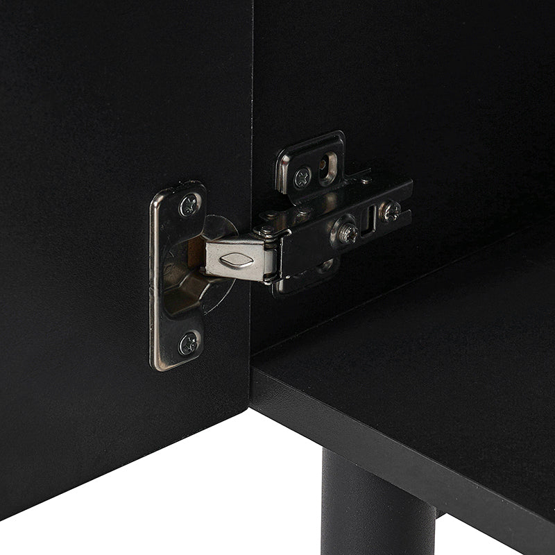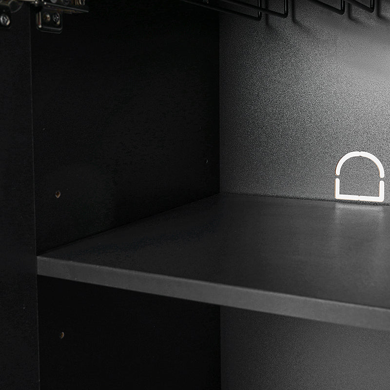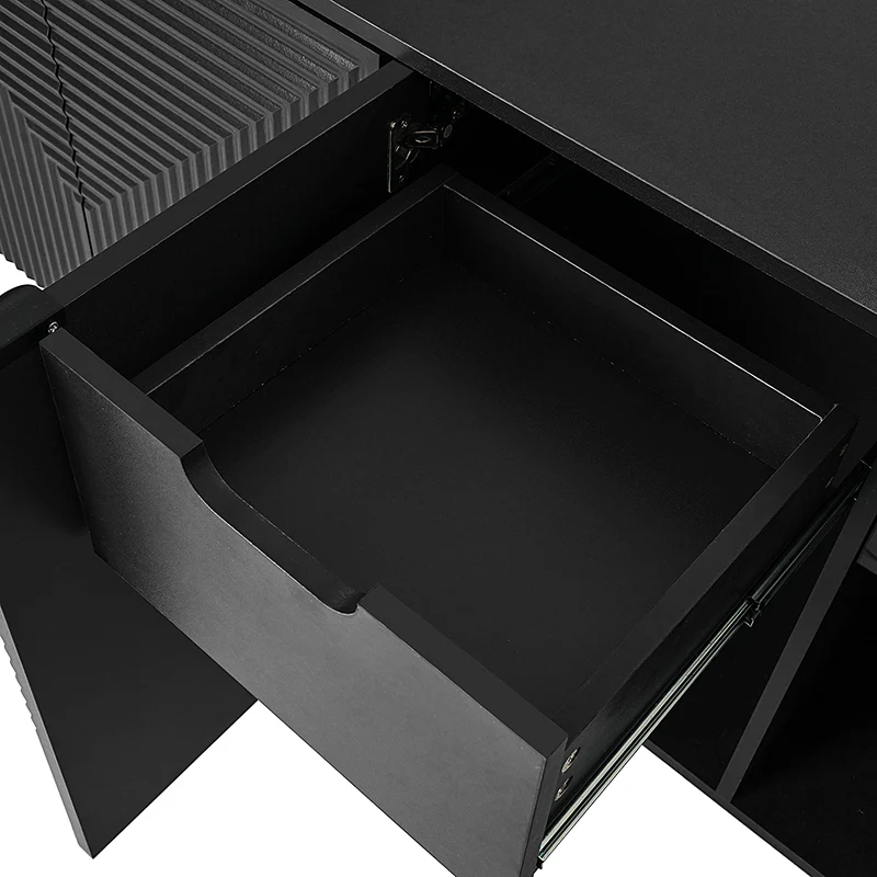 Presenting a sleek and contemporary sideboard featuring a linear groove design on the doors, seamlessly blending into modern decor. Equipped with two discreet drawers, perfect for storing essentials out of sight, and a dedicated wine glass rack for organizing stemware. The three adjustable shelves provide versatile storage options, catering to your organizational needs. A multimedia hole ensures easy cable management, maintaining a clutter-free aesthetic. The sideboard is adorned with stylish iron handles for a chic finish, complemented by sturdy metal legs that enhance its overall durability. Fine-tune the sideboard's position with adjustable feet, ensuring a fit for your living or dining area. Elevate your space with this versatile sideboard, combining form and function effortlessly.