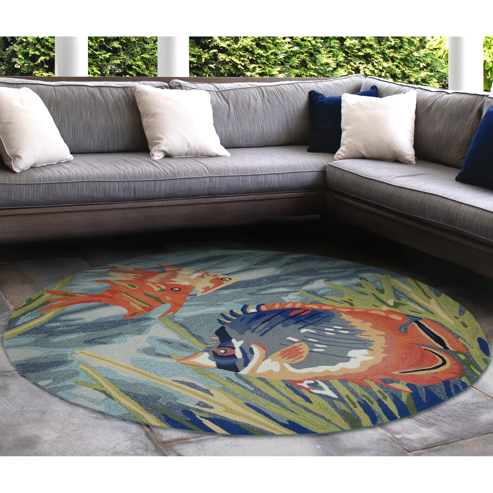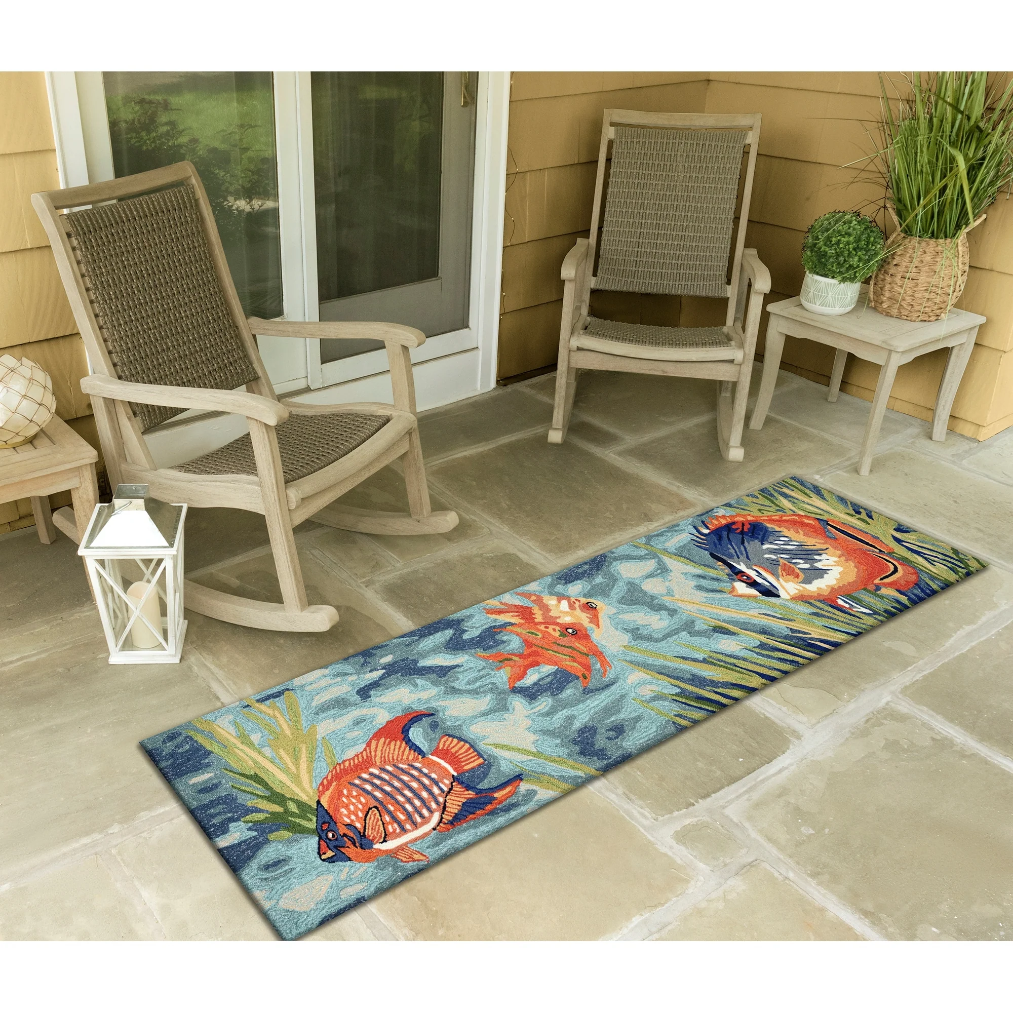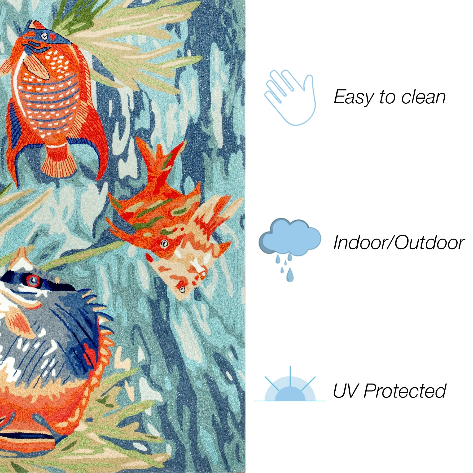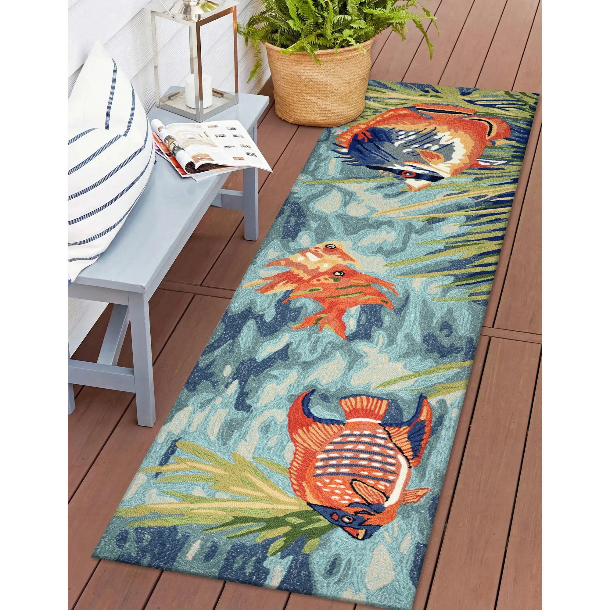 Bring the vibrant colors of the ocean to your indoor or outdoor space with the Liora Manne Ravella Tropical Fish Indoor/Outdoor Rug. Hand-hooked in China from a durable polyester acrylic blend, this flatwoven rug features intricate shading to bring a snapshot of tropical fish in their natural habitat to life. With weather and fade resistance, this rug is perfect for high traffic areas like your kitchen, living room, or patio. Add a touch of nature-inspired design to your home with this expertly hand-tufted area rug.