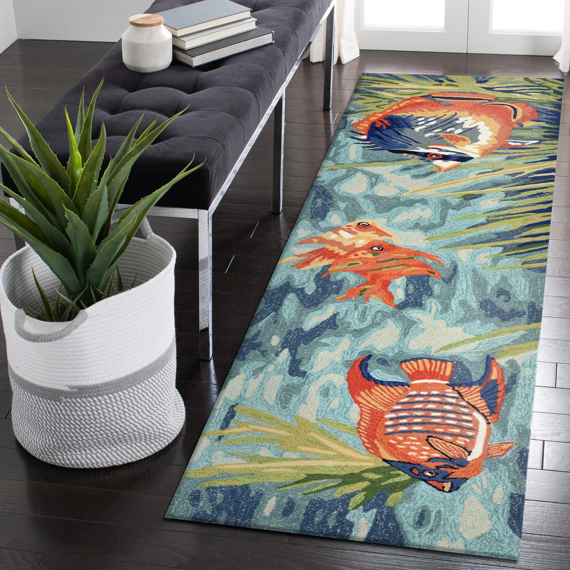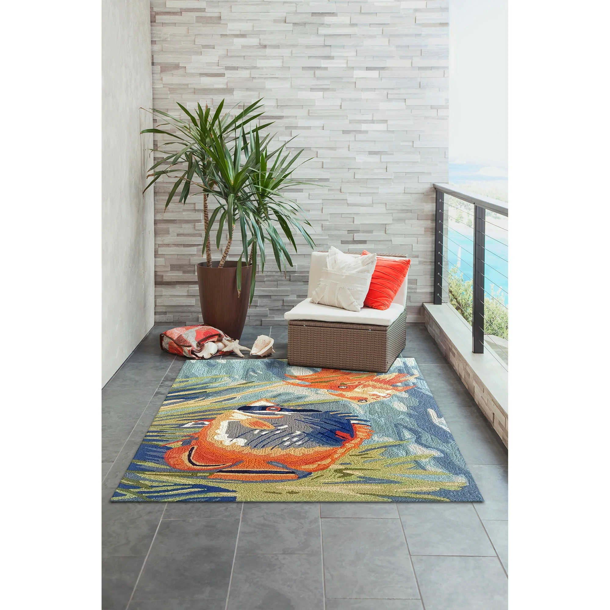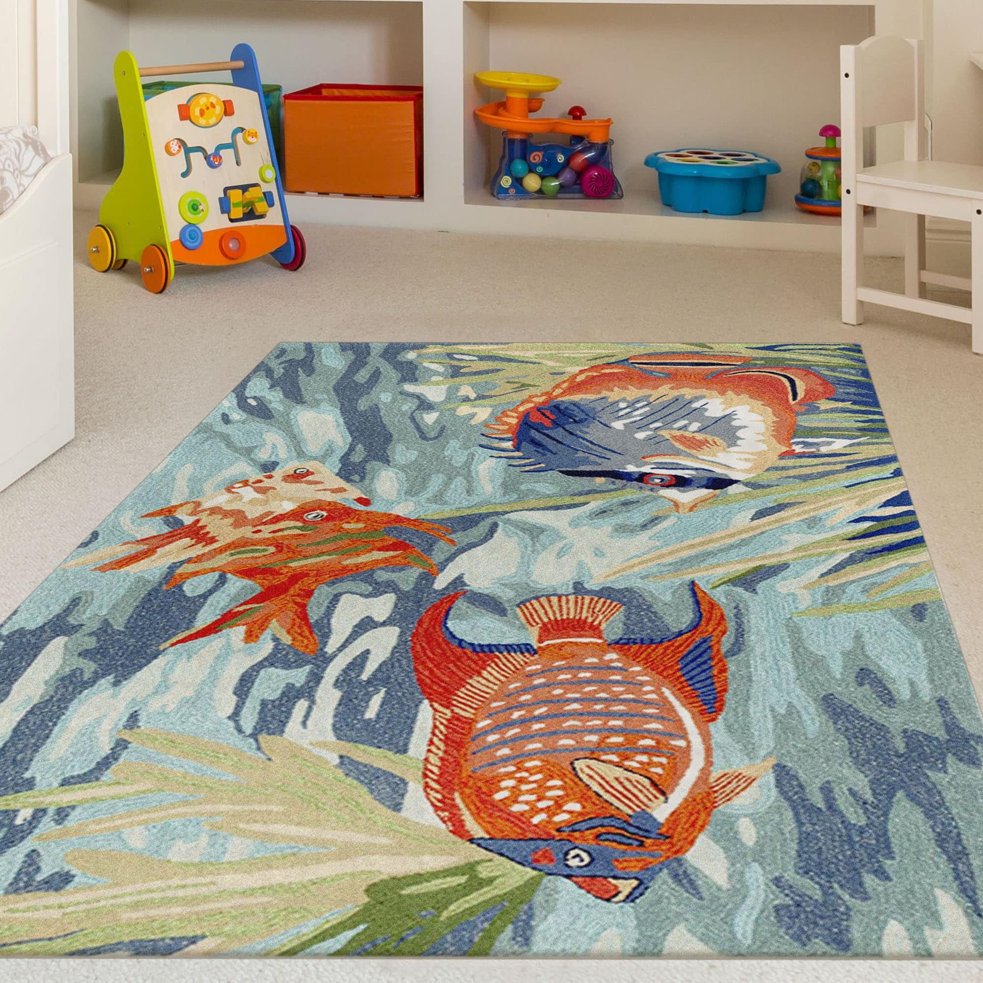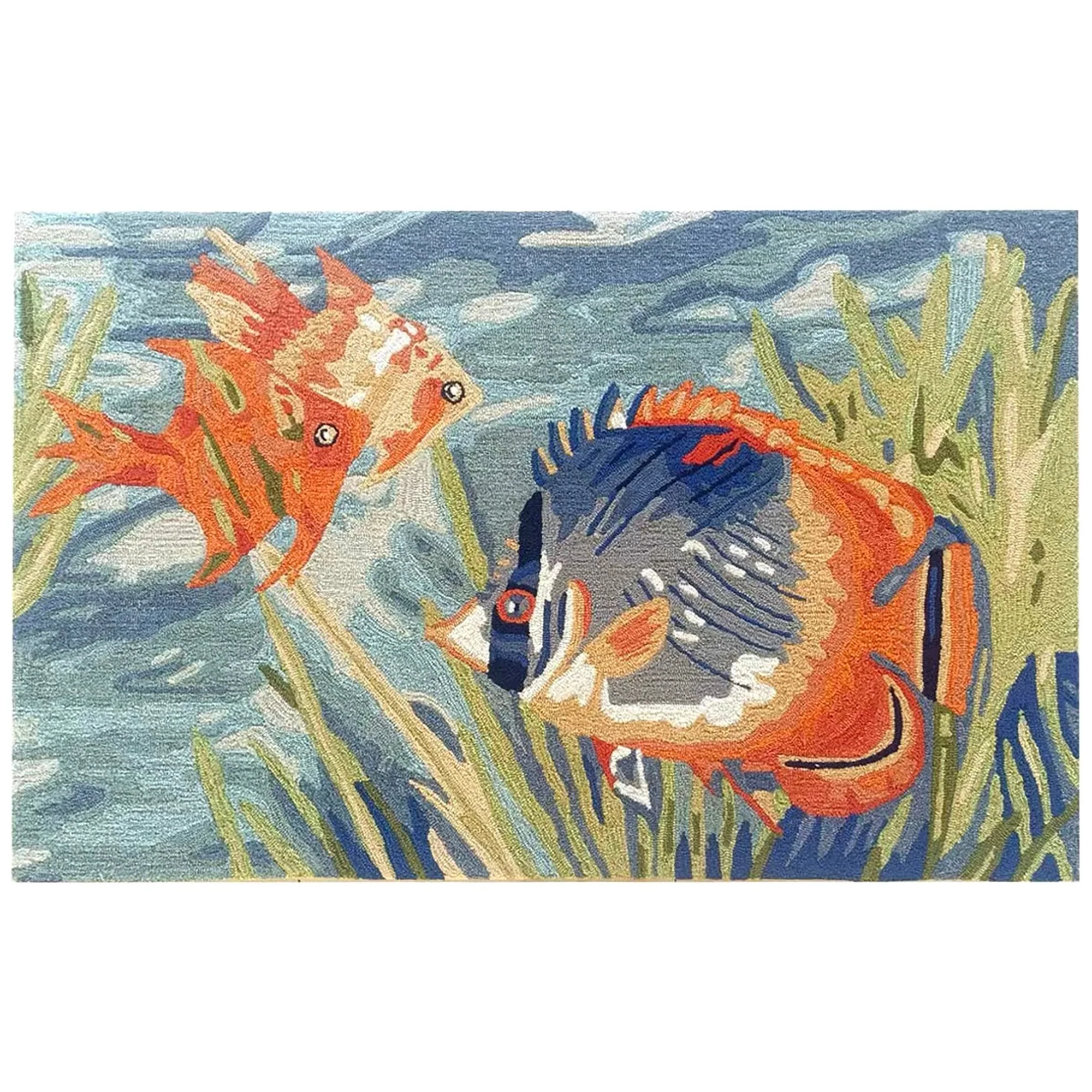 Bring the vibrant colors of the ocean to your indoor or outdoor space with the Liora Manne Ravella Tropical Fish Indoor/Outdoor Rug. Hand-hooked in China from a durable polyester acrylic blend, this flatwoven rug features intricate shading to bring a snapshot of tropical fish in their natural habitat to life. With weather and fade resistance, this rug is perfect for high traffic areas like your kitchen, living room, or patio. Add a touch of nature-inspired design to your home with this expertly hand-tufted area rug.