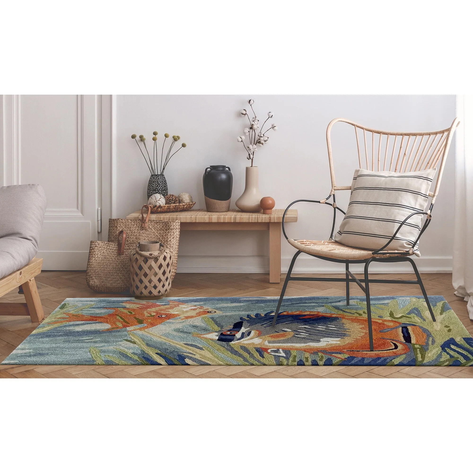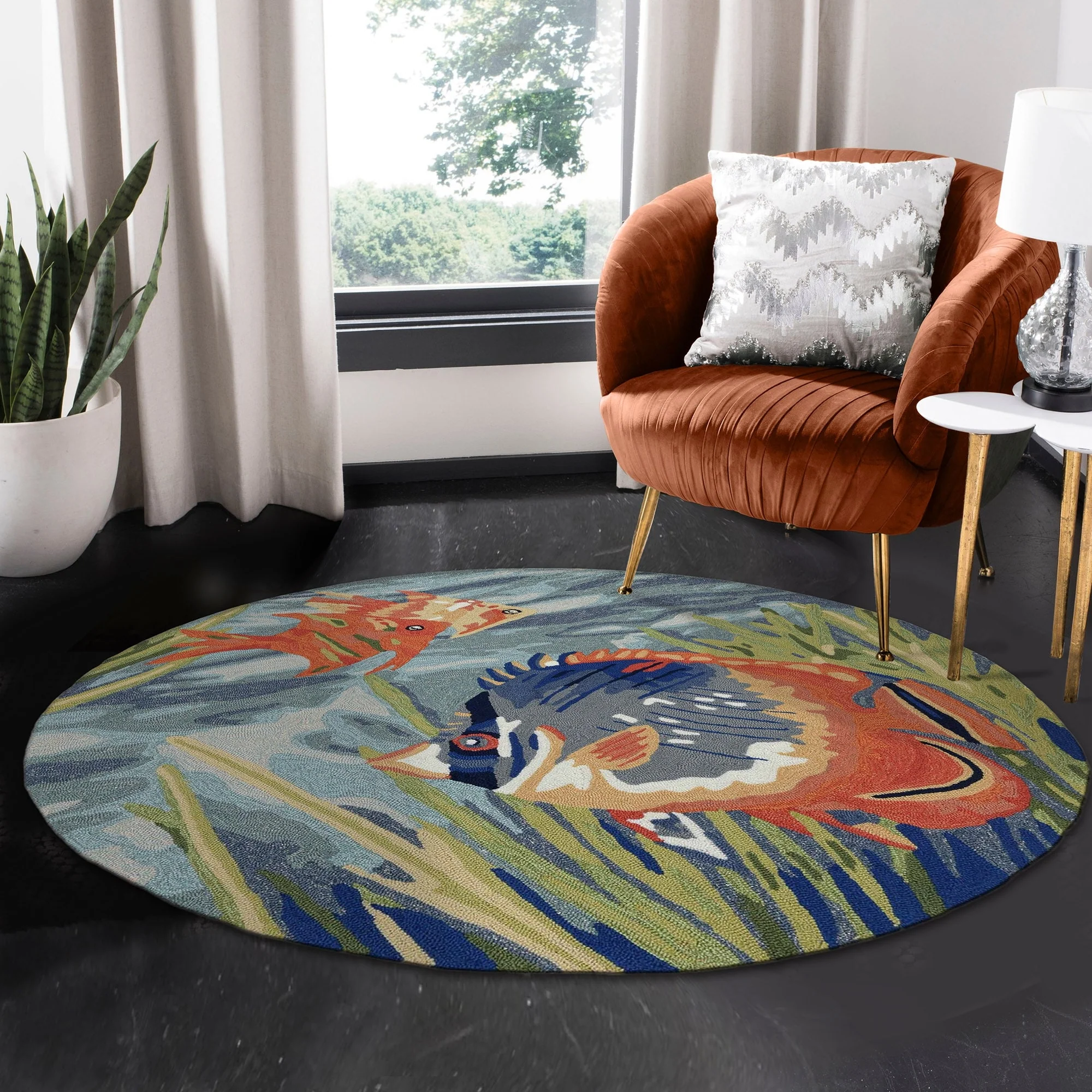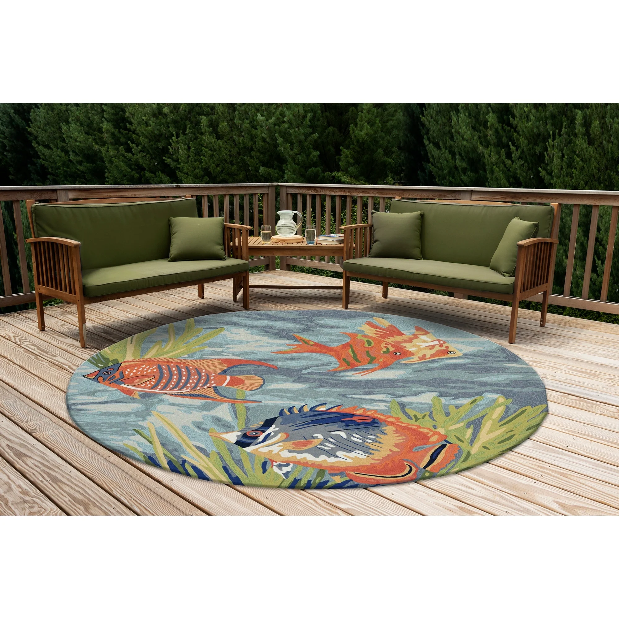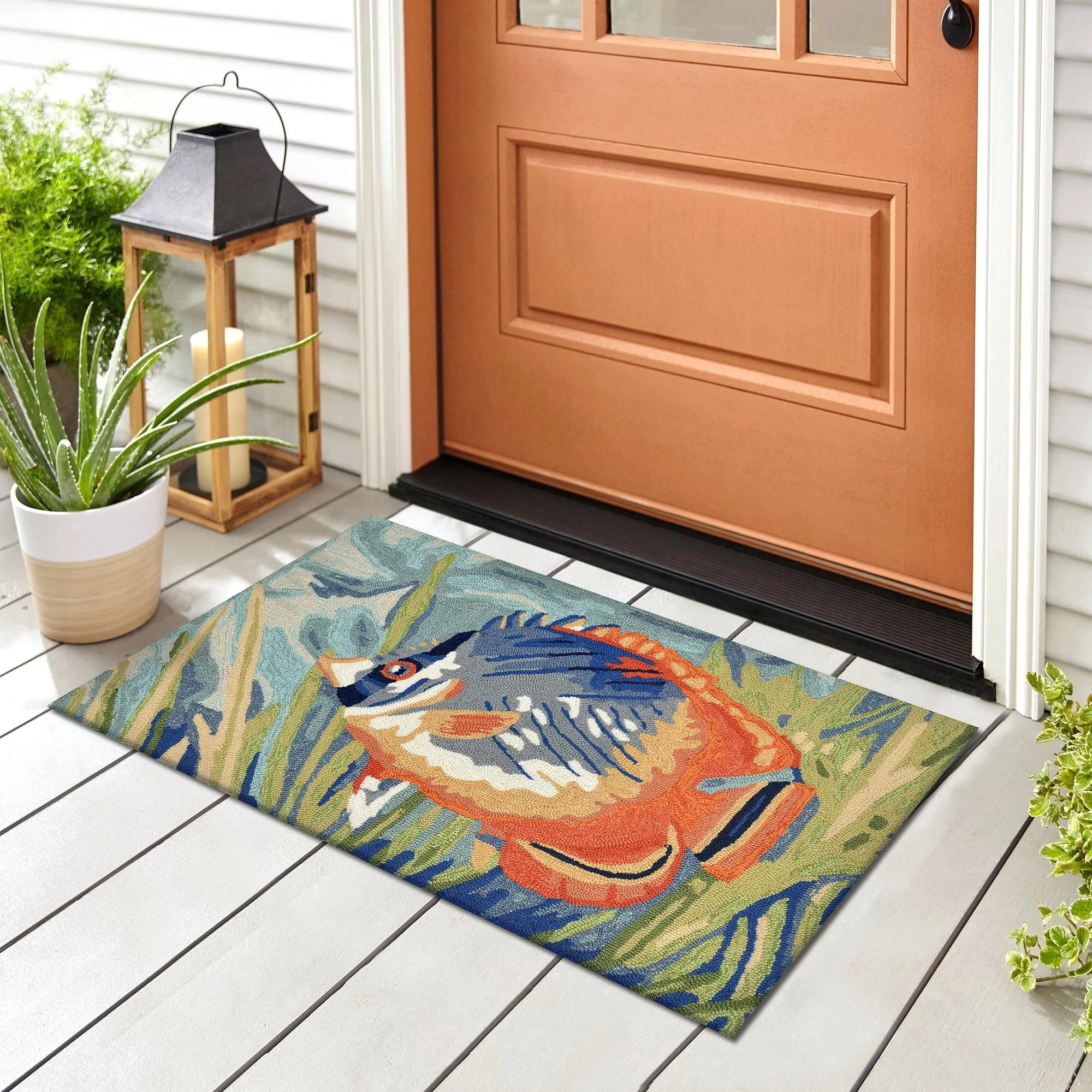 Bring the vibrant colors of the ocean to your indoor or outdoor space with the Liora Manne Ravella Tropical Fish Indoor/Outdoor Rug. Hand-hooked in China from a durable polyester acrylic blend, this flatwoven rug features intricate shading to bring a snapshot of tropical fish in their natural habitat to life. With weather and fade resistance, this rug is perfect for high traffic areas like your kitchen, living room, or patio. Add a touch of nature-inspired design to your home with this expertly hand-tufted area rug.