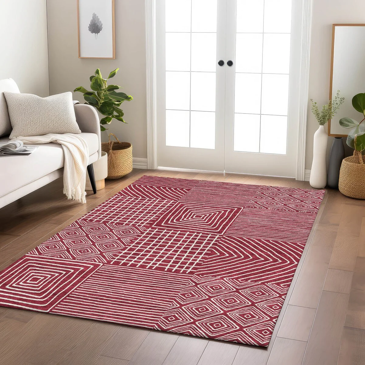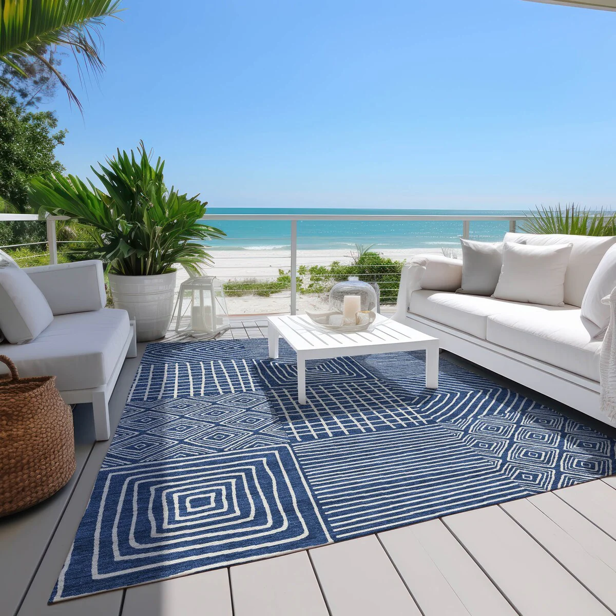 Delight in the geometric diversity of our transitional area rug, where each square features a distinct motif, blending harmoniously into a stylish whole. This rug is designed to be a functional centerpiece in any setting, with UV stabilization for environmental versatility, ultra-thin construction for underfoot comfort, machine-washable fabric for no-hassle cleaning, and a robust build thats both family and pet friendly. All rugs exposed to long periods of intense and direct sunlight can experience loss of color over time. Our rugs perform best in covered outdoor areas and uncovered areas with lower hours of direct sunlight. The ultra thin profile allows for fast drying after rainfall or outdoor cleaning. Larger rug sizes may not fit into a residential washing machine. They may be washed in a commercial size washing machine or hosed-off outside with mild soap and water. Air-dry, do not machine dry. While each rug already has a non-skid backing, the necessity for additional cushion or room settings with high traction areas, may require an additional rug pad.