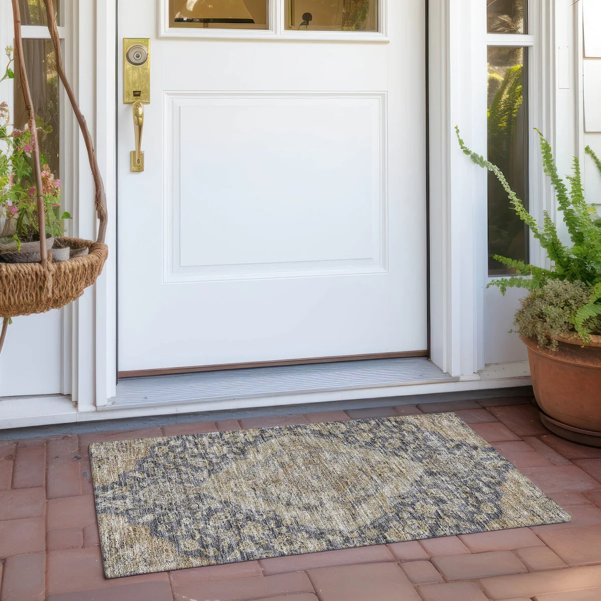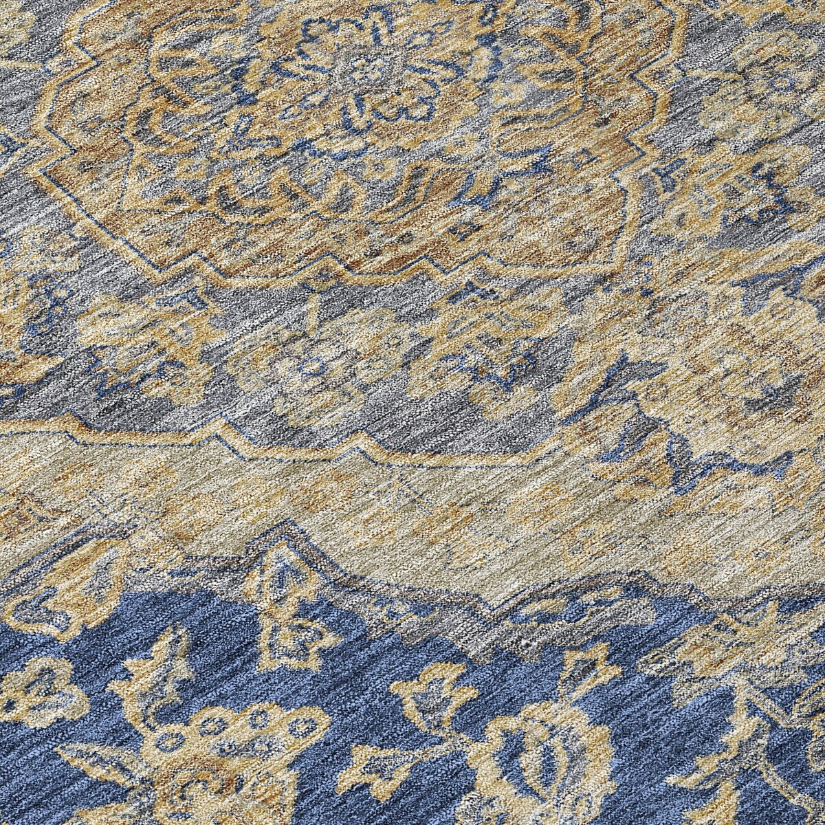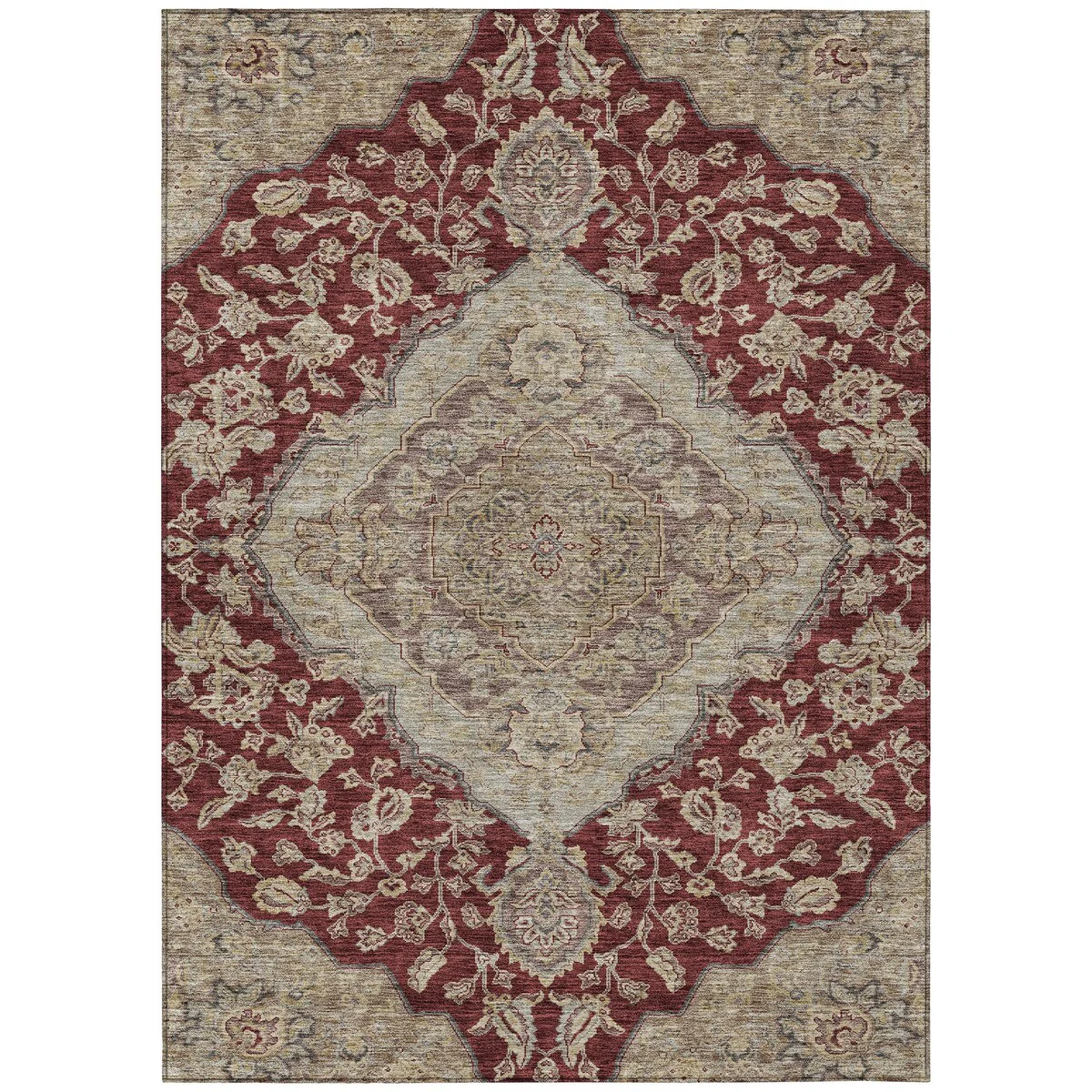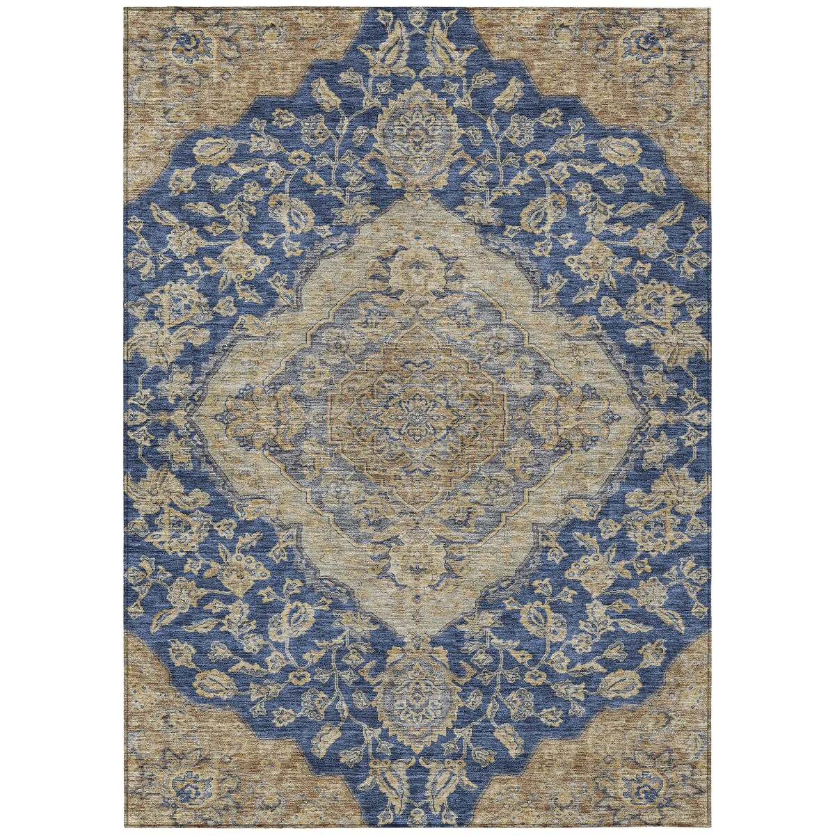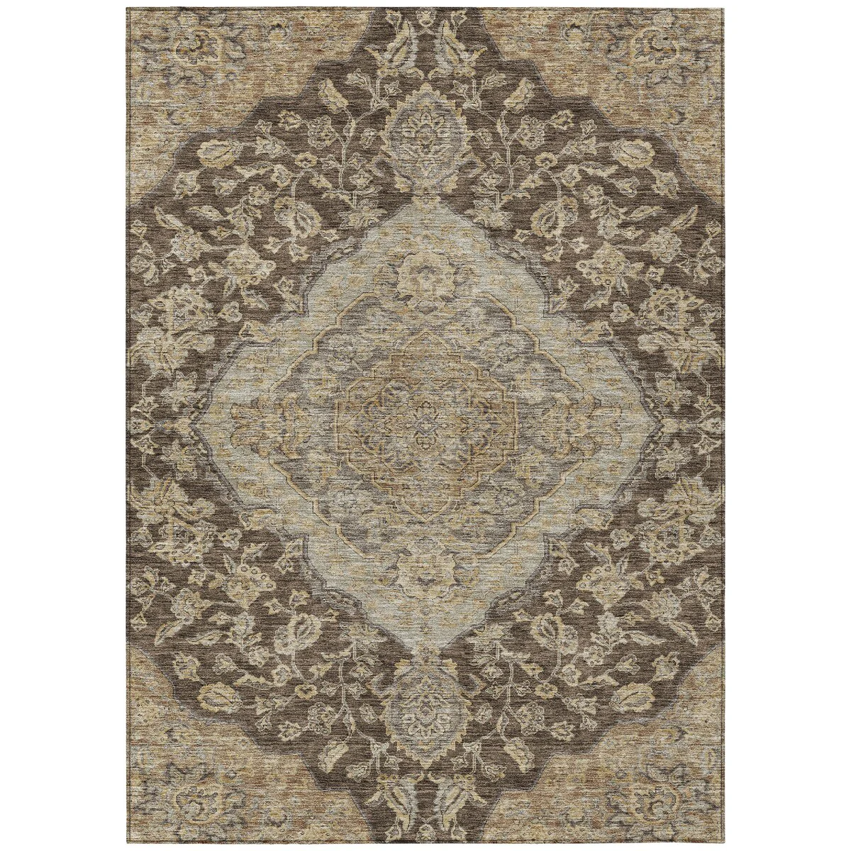 Add sophistication to your home with our area rug, featuring a beautifully detailed large diamond center medallion that seamlessly integrates traditional and global design elements. UV stabilized for lasting color, it's perfect for indoor or outdoor use. The ultra-thin construction ensures easy placement, and its machine-washable nature makes it a practical choice for families and pet owners. All rugs exposed to long periods of intense and direct sunlight can experience loss of color over time. Our rugs perform best in covered outdoor areas and uncovered areas with lower hours of direct sunlight. The ultra thin profile allows for fast drying after rainfall or outdoor cleaning. Larger rug sizes may not fit into a residential washing machine. They may be washed in a commercial size washing machine or hosed-off outside with mild soap and water. Air-dry, do not machine dry. While each rug already has a non-skid backing, the necessity for additional cushion or room settings with high traction areas, may require an additional rug pad.