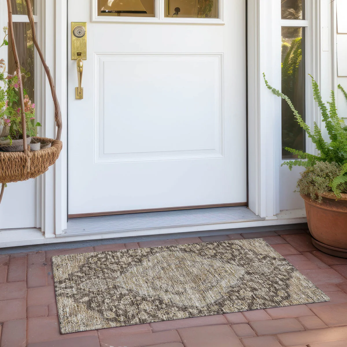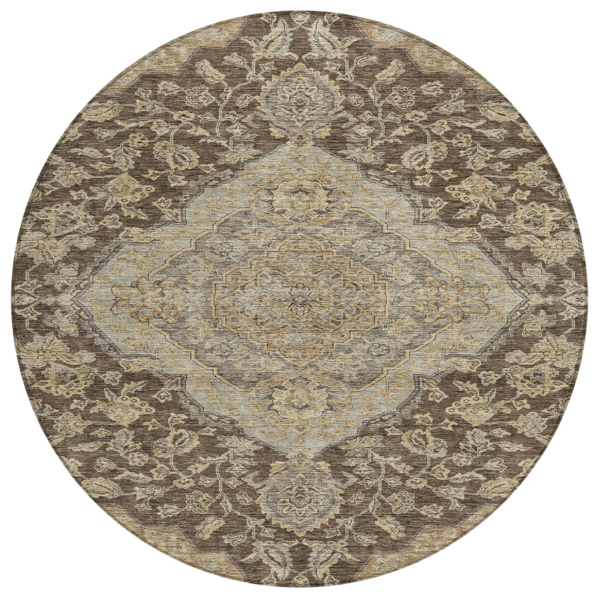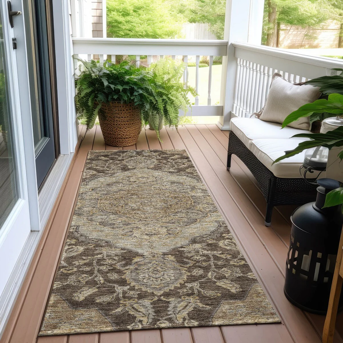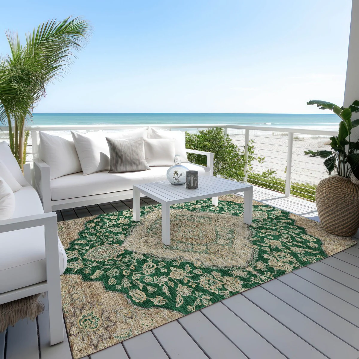 Add sophistication to your home with our area rug, featuring a beautifully detailed large diamond center medallion that seamlessly integrates traditional and global design elements. UV stabilized for lasting color, it's perfect for indoor or outdoor use. The ultra-thin construction ensures easy placement, and its machine-washable nature makes it a practical choice for families and pet owners. All rugs exposed to long periods of intense and direct sunlight can experience loss of color over time. Our rugs perform best in covered outdoor areas and uncovered areas with lower hours of direct sunlight. The ultra thin profile allows for fast drying after rainfall or outdoor cleaning. Larger rug sizes may not fit into a residential washing machine. They may be washed in a commercial size washing machine or hosed-off outside with mild soap and water. Air-dry, do not machine dry. While each rug already has a non-skid backing, the necessity for additional cushion or room settings with high traction areas, may require an additional rug pad.