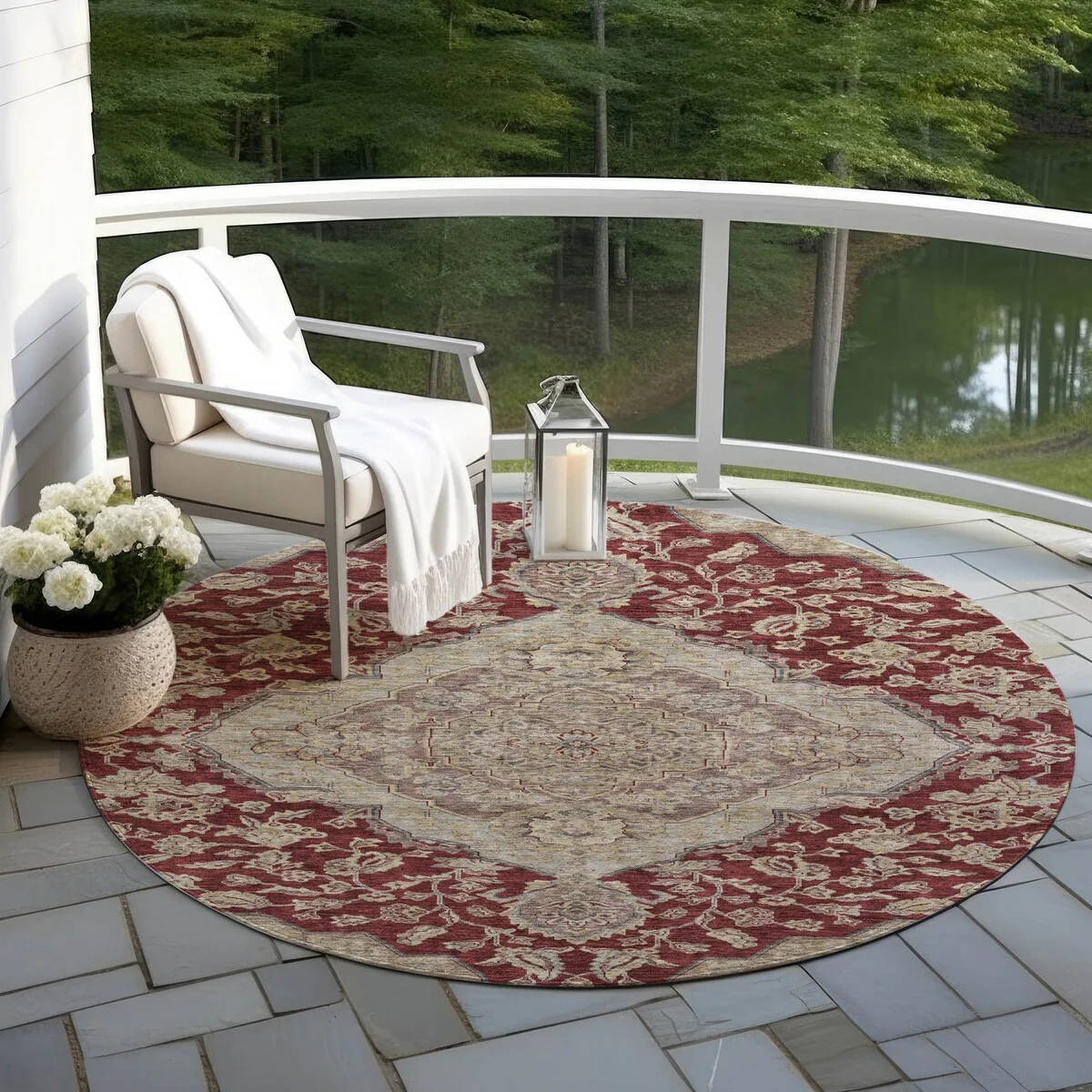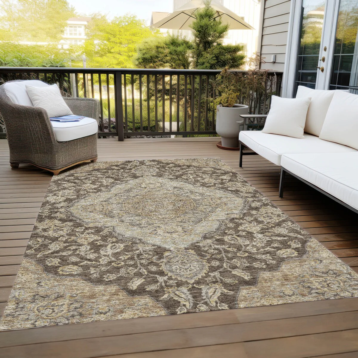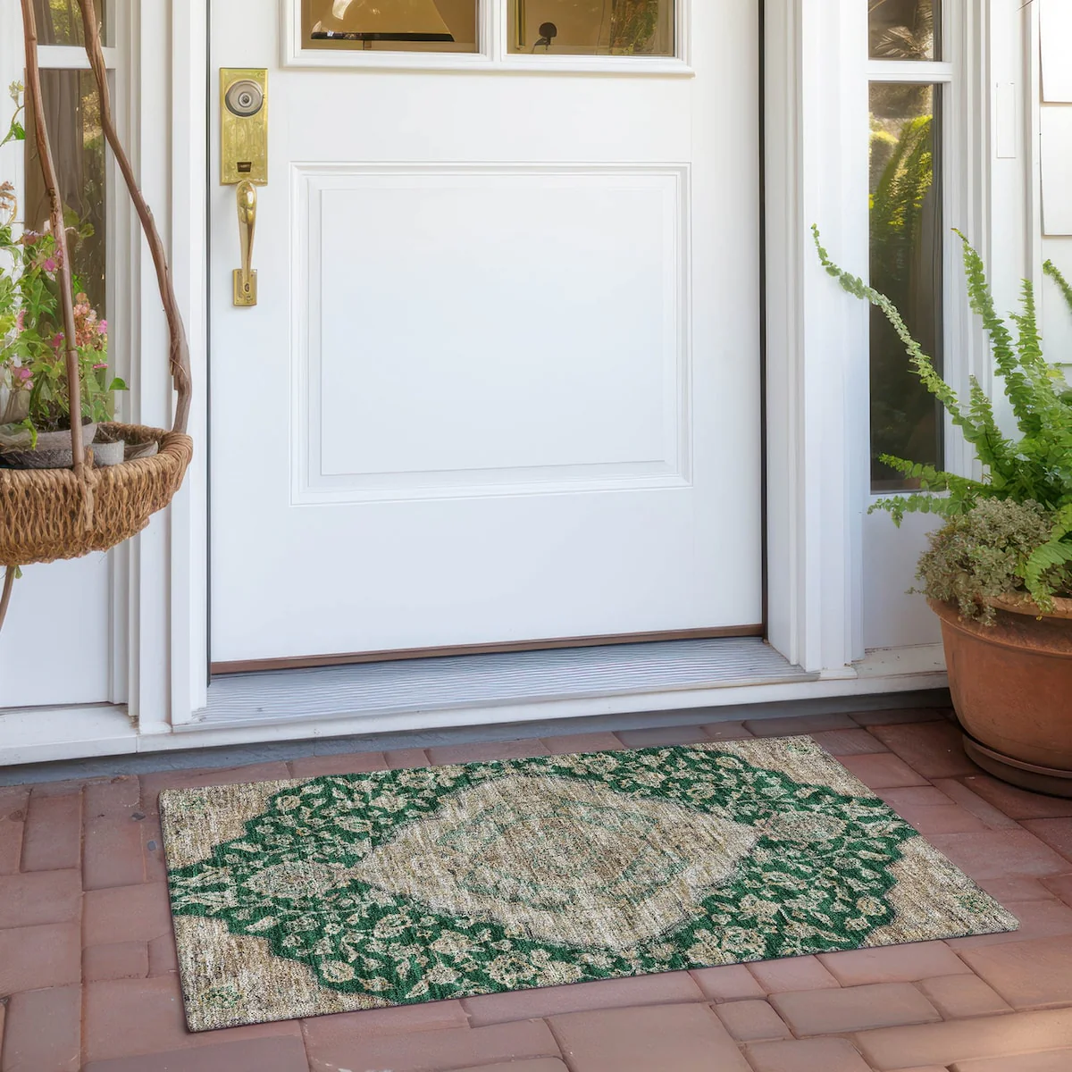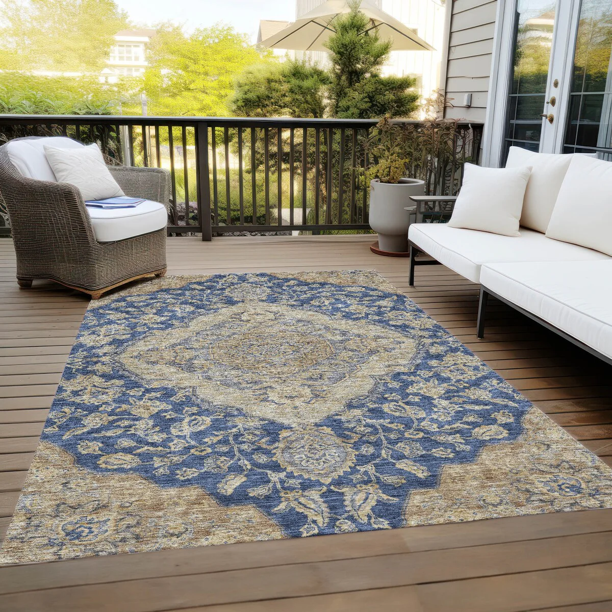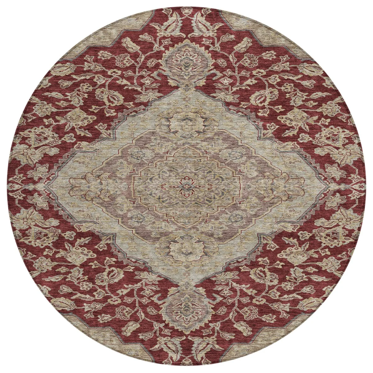 Add sophistication to your home with our area rug, featuring a beautifully detailed large diamond center medallion that seamlessly integrates traditional and global design elements. UV stabilized for lasting color, it's perfect for indoor or outdoor use. The ultra-thin construction ensures easy placement, and its machine-washable nature makes it a practical choice for families and pet owners. All rugs exposed to long periods of intense and direct sunlight can experience loss of color over time. Our rugs perform best in covered outdoor areas and uncovered areas with lower hours of direct sunlight. The ultra thin profile allows for fast drying after rainfall or outdoor cleaning. Larger rug sizes may not fit into a residential washing machine. They may be washed in a commercial size washing machine or hosed-off outside with mild soap and water. Air-dry, do not machine dry. While each rug already has a non-skid backing, the necessity for additional cushion or room settings with high traction areas, may require an additional rug pad.
