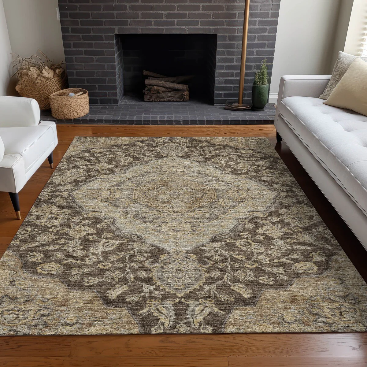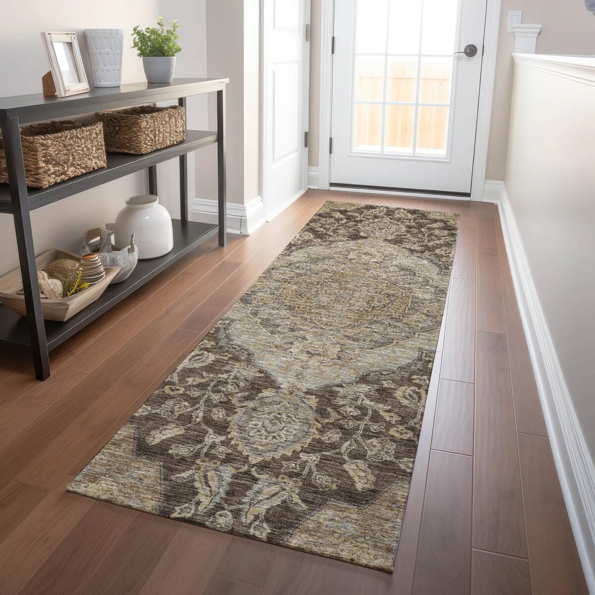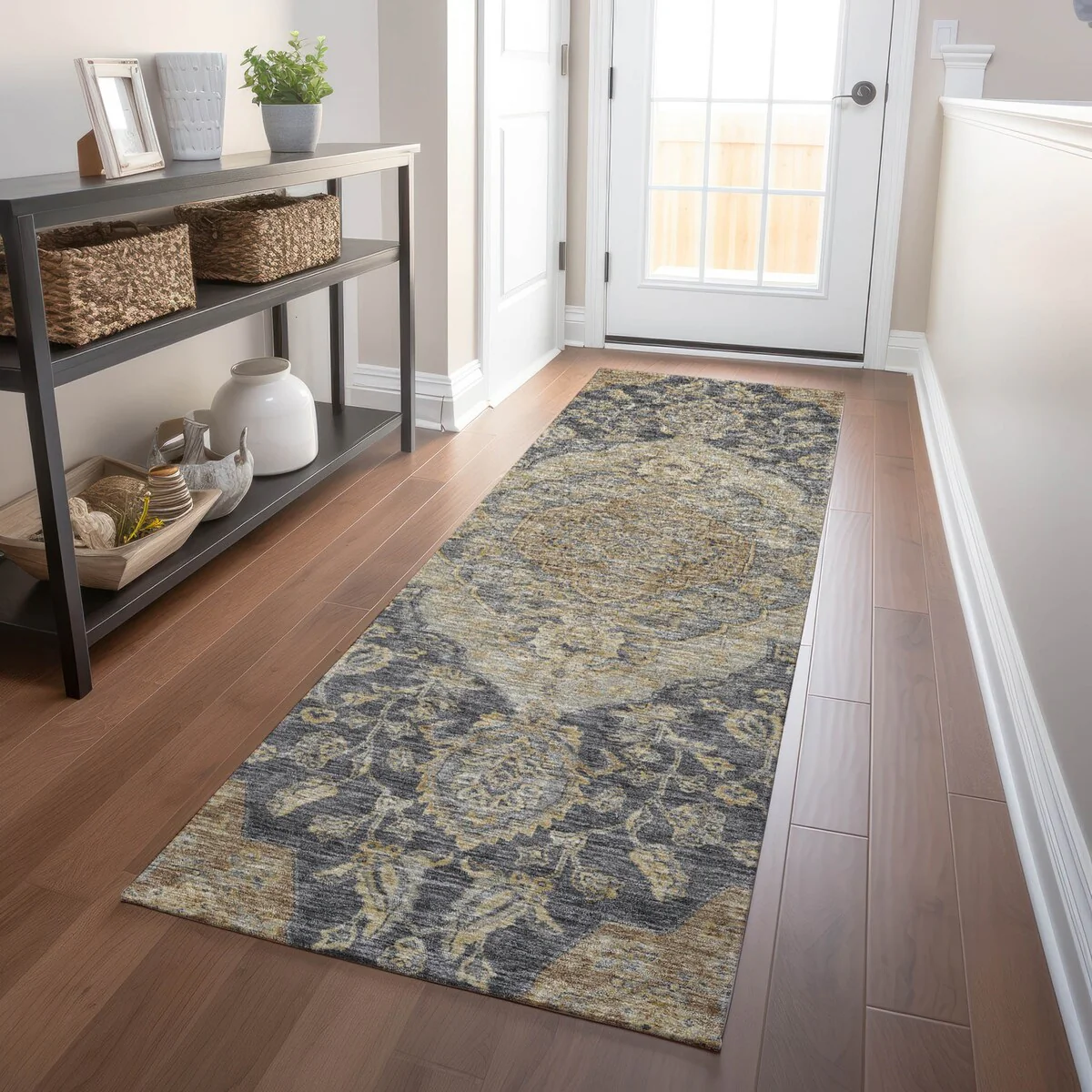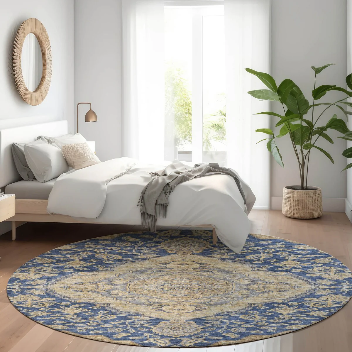 Add sophistication to your home with our area rug, featuring a beautifully detailed large diamond center medallion that seamlessly integrates traditional and global design elements. UV stabilized for lasting color, it's perfect for indoor or outdoor use. The ultra-thin construction ensures easy placement, and its machine-washable nature makes it a practical choice for families and pet owners. All rugs exposed to long periods of intense and direct sunlight can experience loss of color over time. Our rugs perform best in covered outdoor areas and uncovered areas with lower hours of direct sunlight. The ultra thin profile allows for fast drying after rainfall or outdoor cleaning. Larger rug sizes may not fit into a residential washing machine. They may be washed in a commercial size washing machine or hosed-off outside with mild soap and water. Air-dry, do not machine dry. While each rug already has a non-skid backing, the necessity for additional cushion or room settings with high traction areas, may require an additional rug pad.