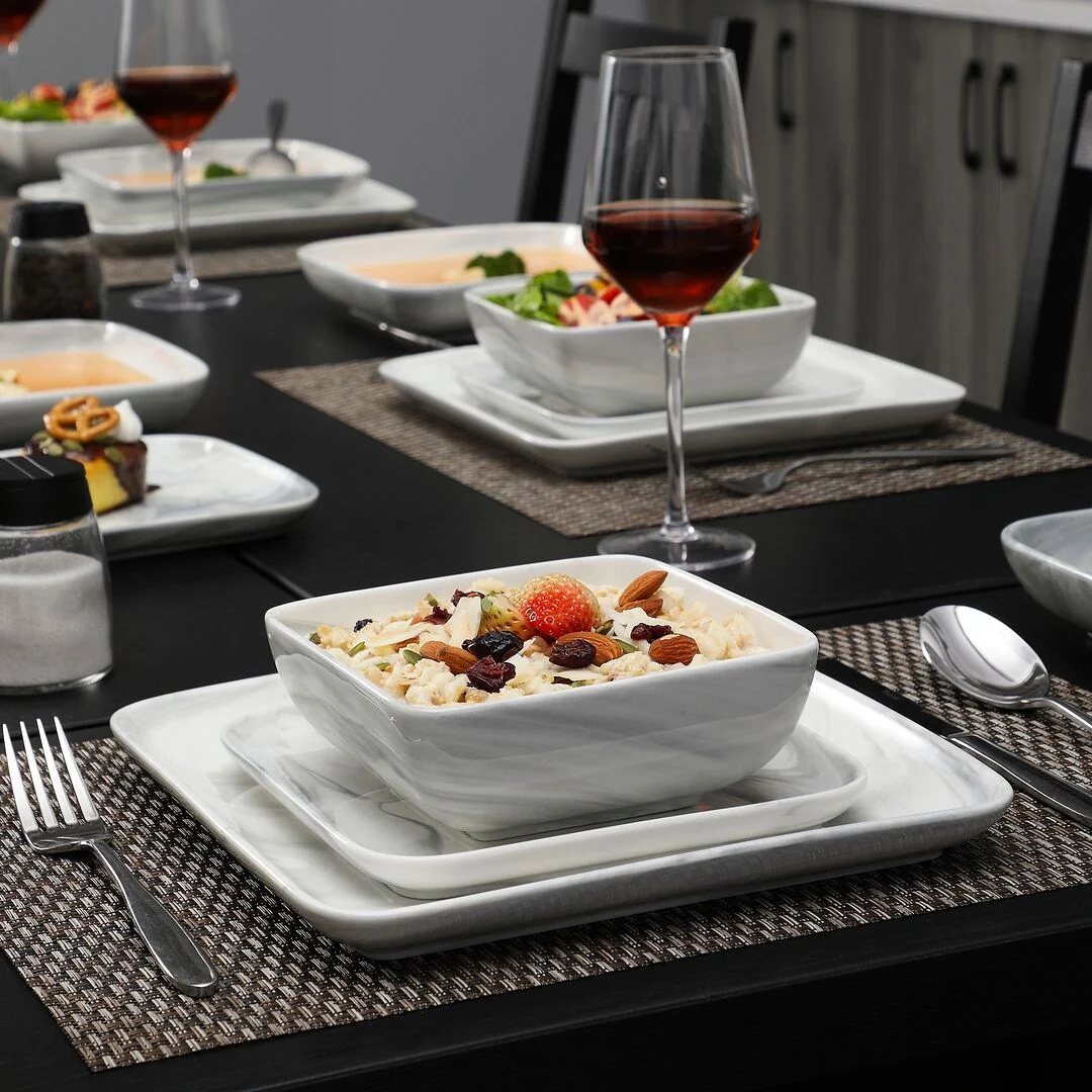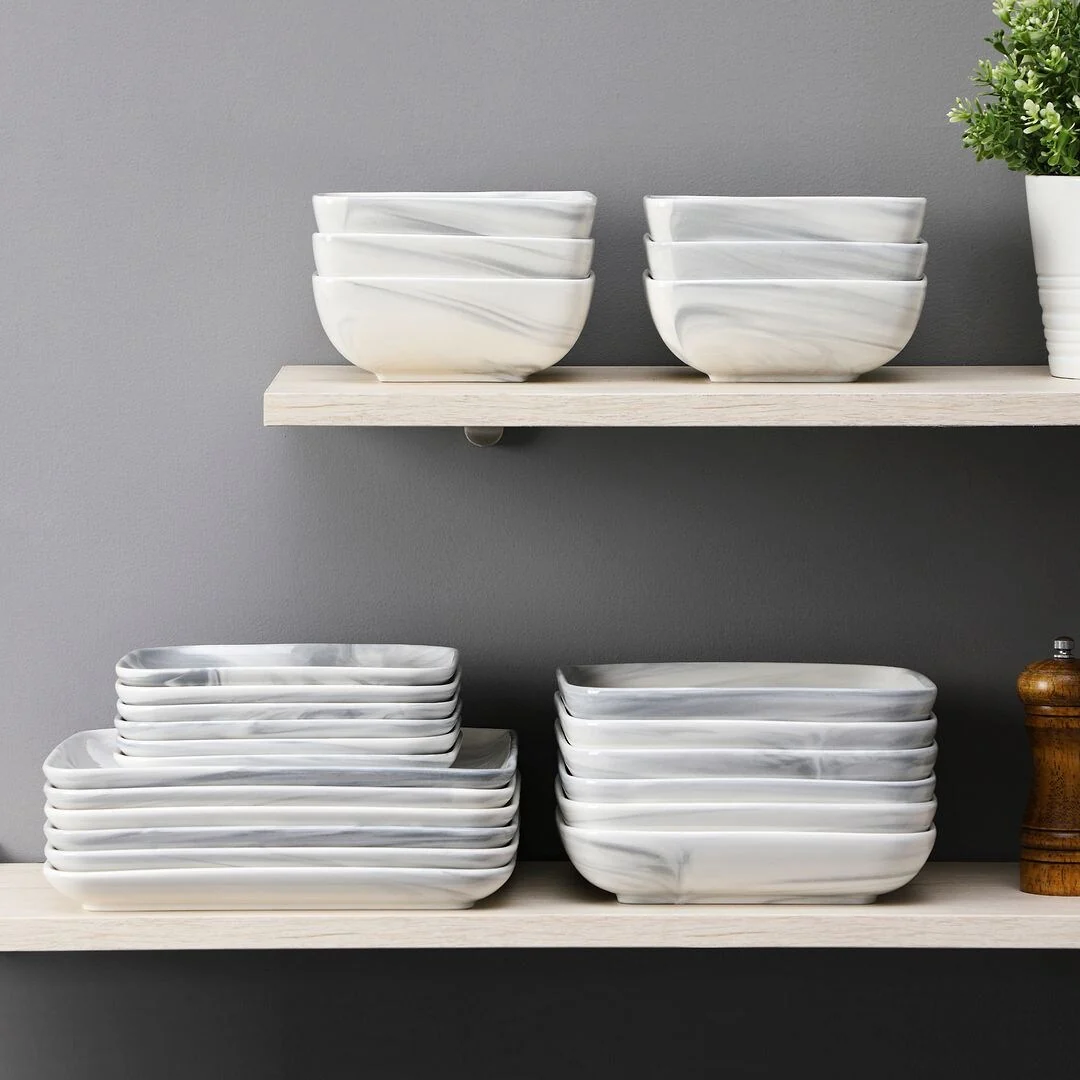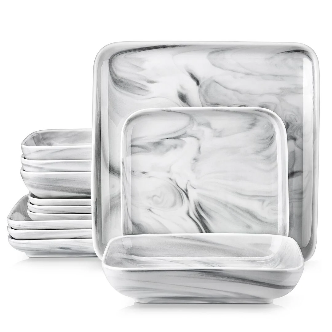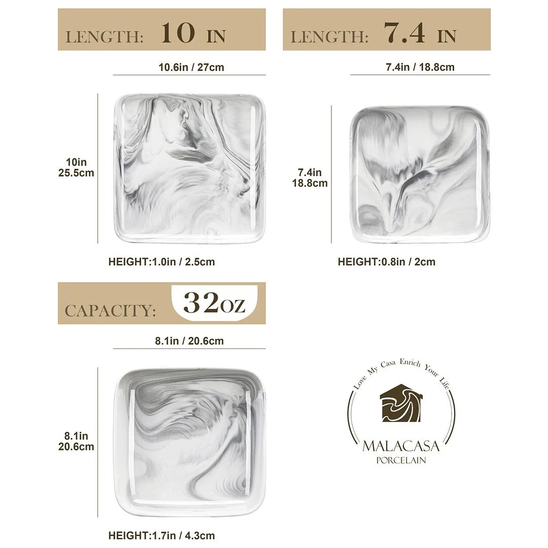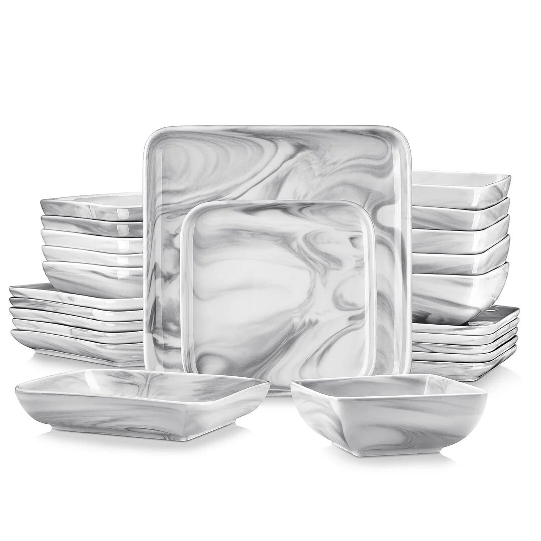 MALACASA Ivy Series 24-piece square dinnerware set service for 6 (12-piece dinnerware set for 4). Sophisticatedly crafted in true minimalist fashion and timeless design in exquisite marble grey, the dinnerware set provides the ultra-elegant vibe for your kitchen and dining table.