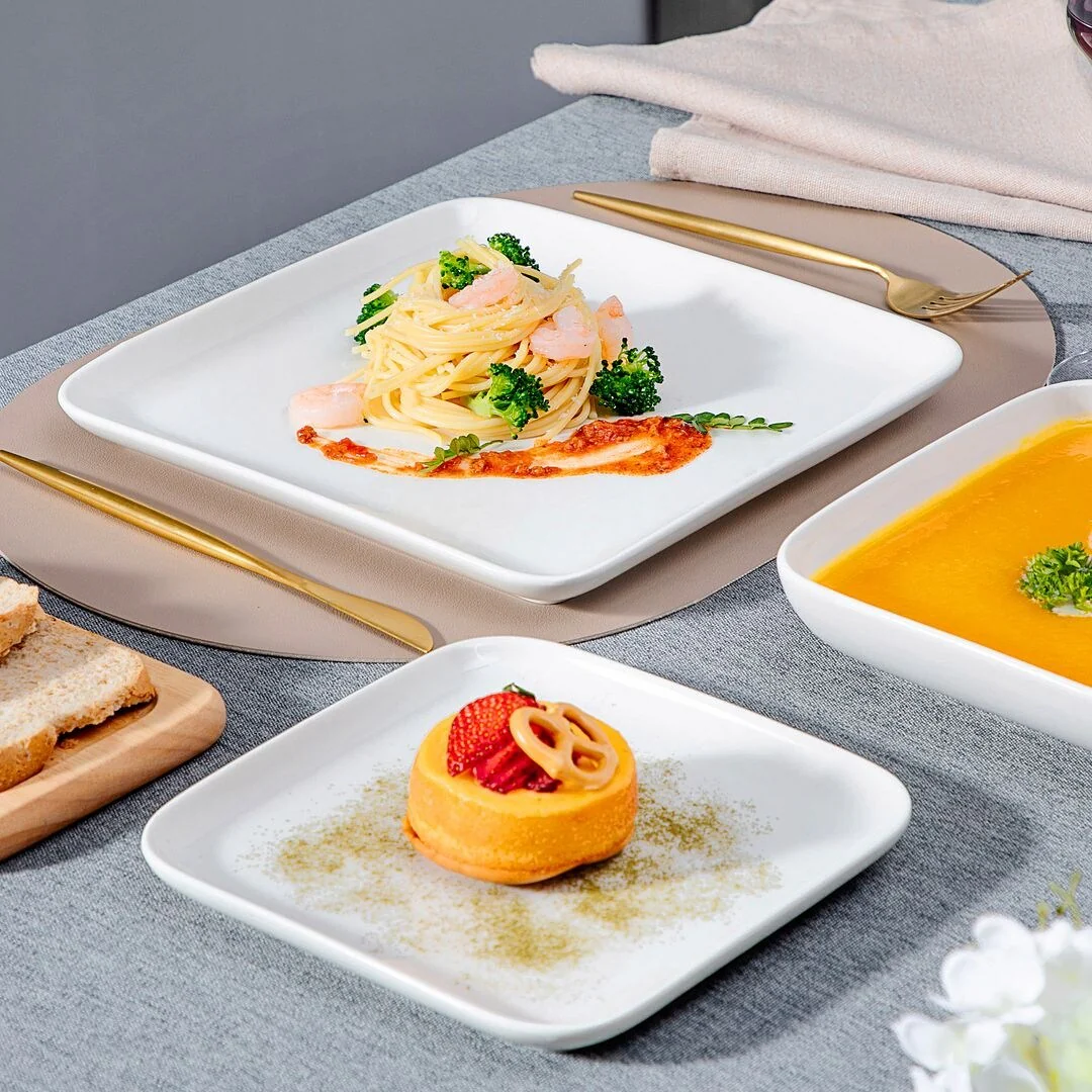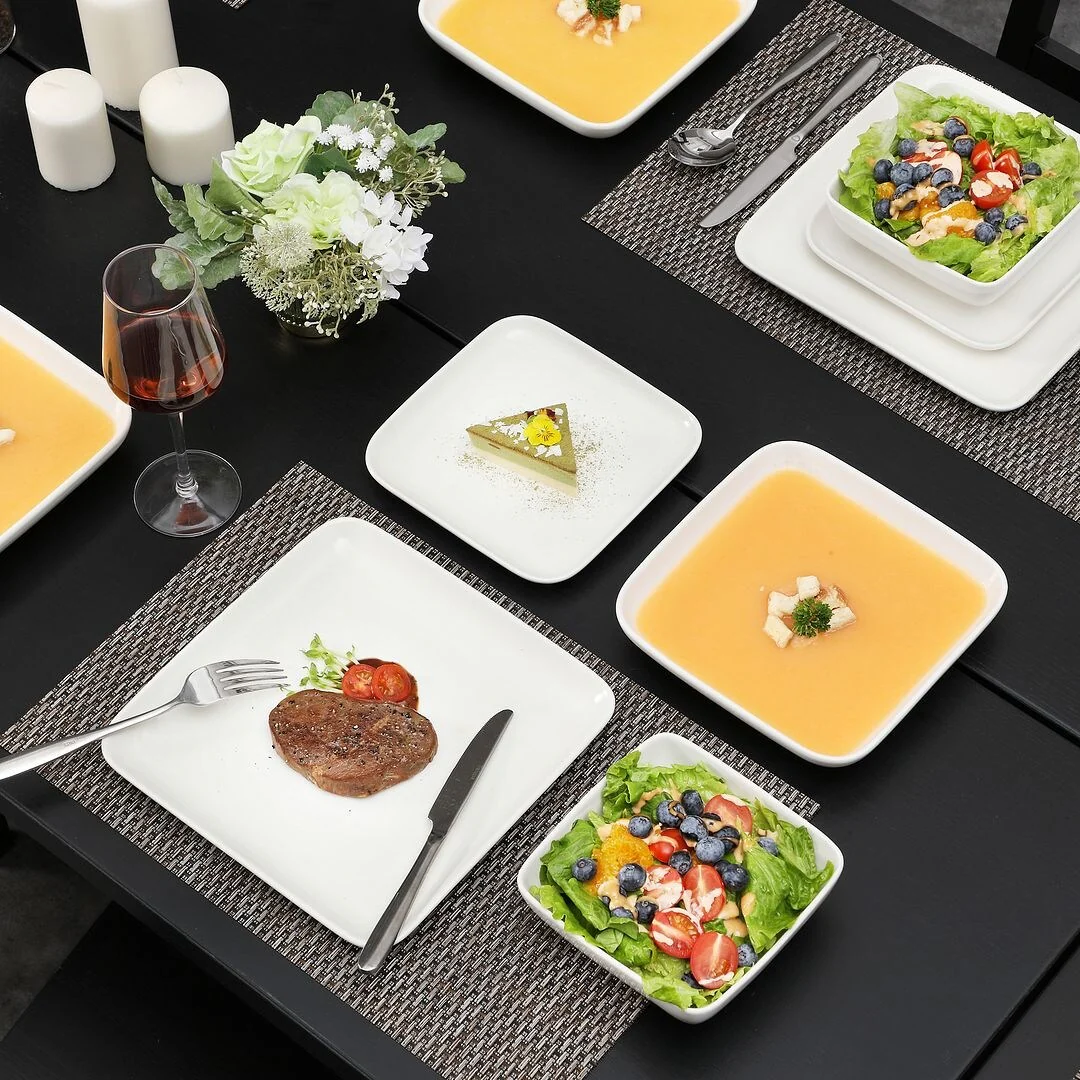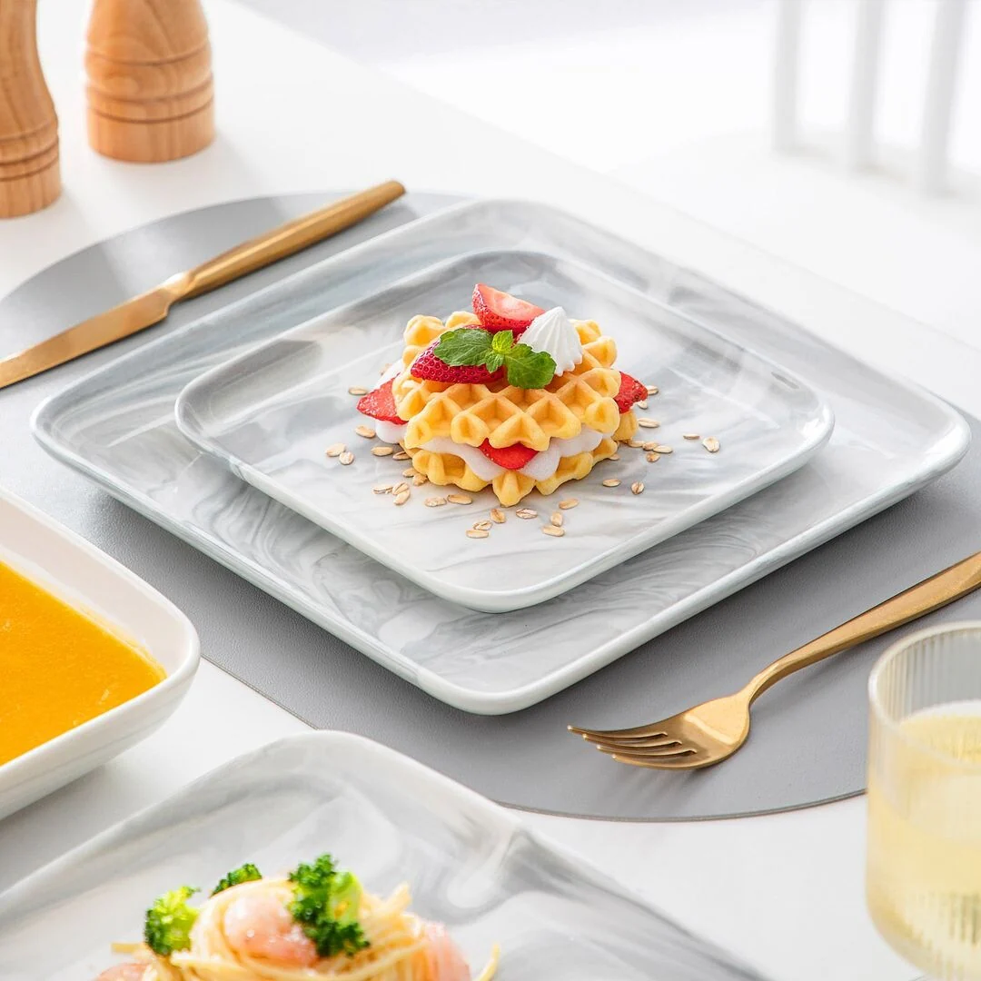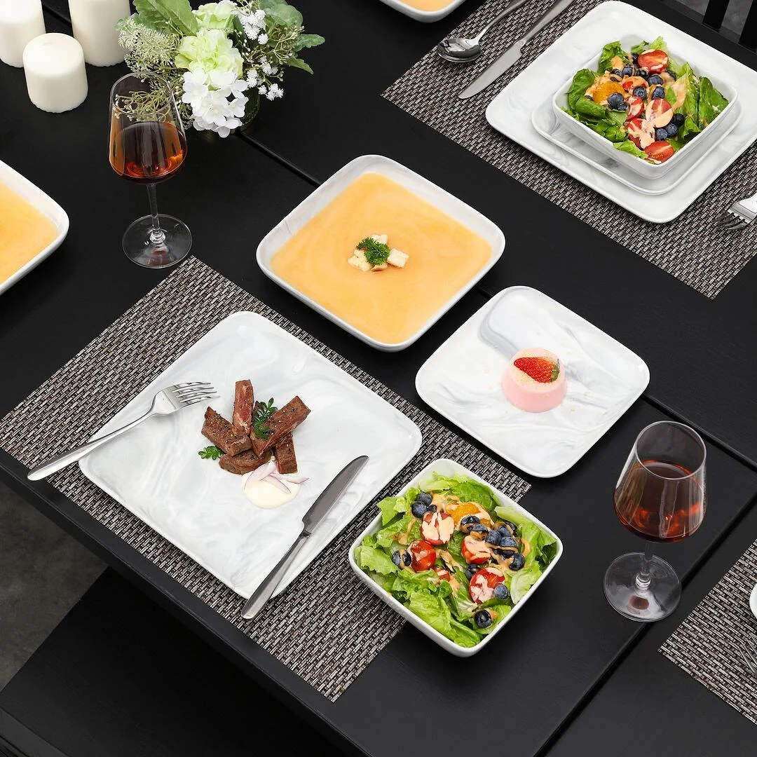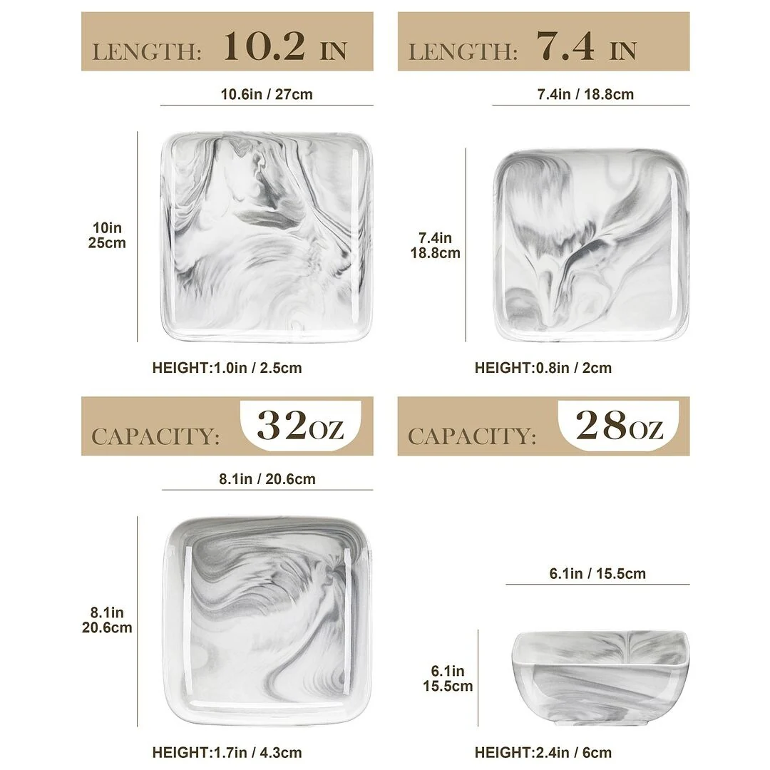 MALACASA Ivy Series 24-piece square dinnerware set service for 6 (12-piece dinnerware set for 4). Sophisticatedly crafted in true minimalist fashion and timeless design in exquisite marble grey, the dinnerware set provides the ultra-elegant vibe for your kitchen and dining table.