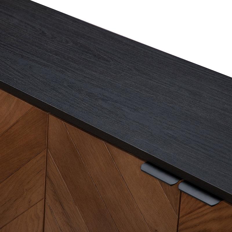With a spacious footprint and clean industrial styling, this mid-century sideboard grounds your dining or living space with a striking modern look. Crafted from a blend of solid and engineered wood, it features a clean rectangular body set on a stainless steel base. Double two-door cabinets with interior shelving create versatile storage space. A wood grain chevron pattern on the doors layers in some modern styling, while keeping the rugged, organic look in place. With generous proportions, it holds its own against larger walls and rooms.