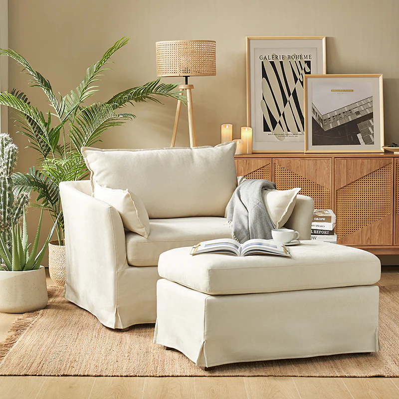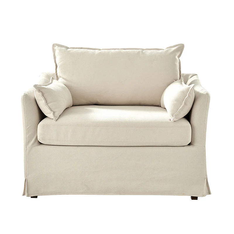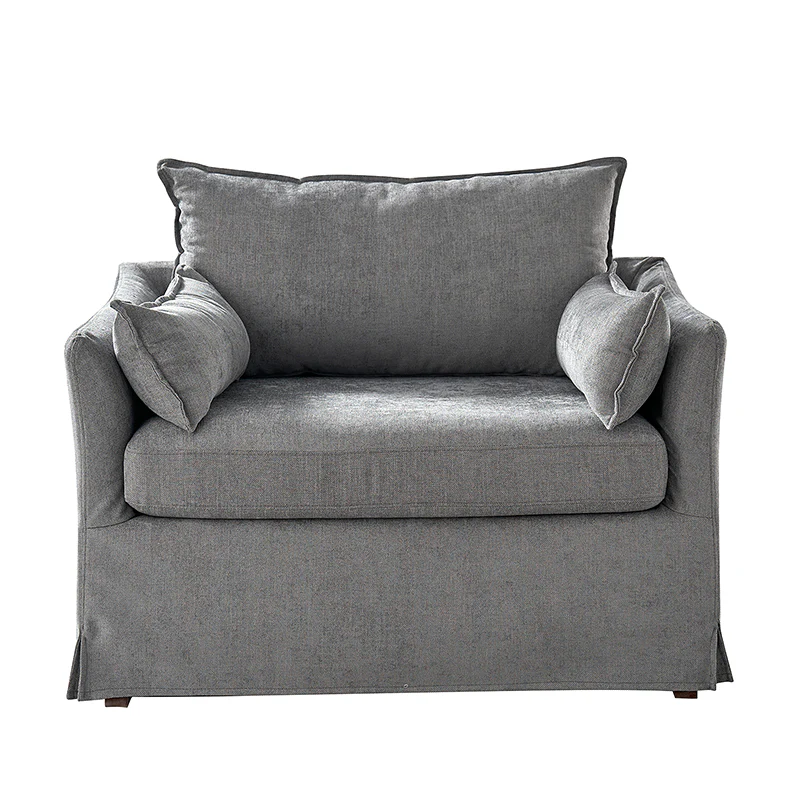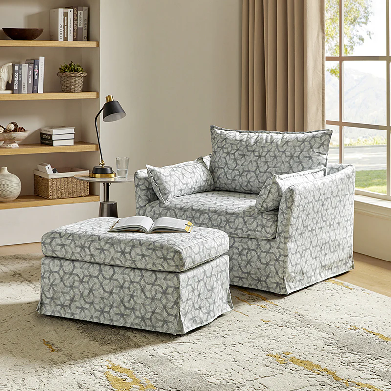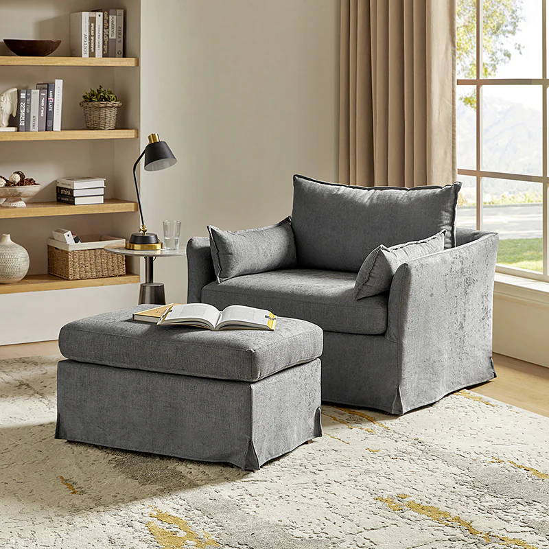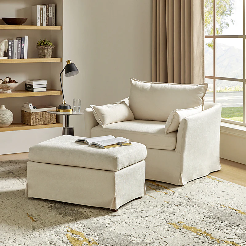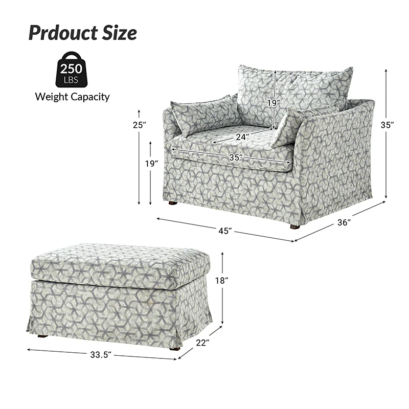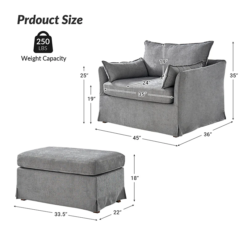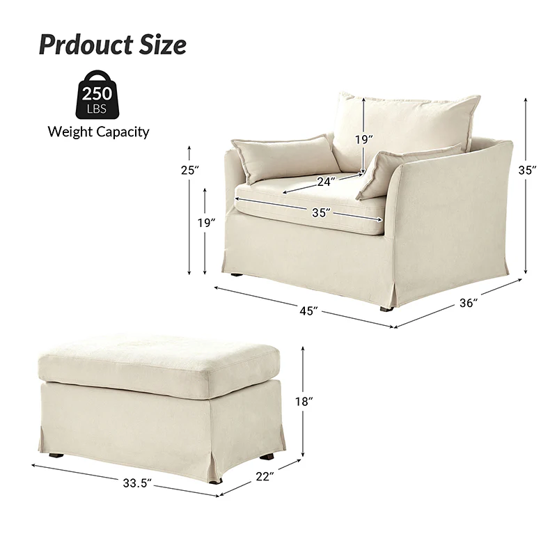 Introducing a versatile chair seamlessly blending farmhouse charm and modern aesthetics, ideal for the living room and the bedroom. This oversized 1.5-seater features a removable slipcover for easy cleaning and is adorned with an imitation linen fabric that exudes sophistication. The solid wood legs add a touch of rustic elegance, ensuring durability and stability. With the convenience of an accompanying ottoman, this chair provides extra comfort and flexibility. Easy mobility is guaranteed, thanks to lockable rear wheels. The reversible seat cushion enhances usability, allowing you to flip and refresh the look effortlessly. Embrace a harmonious blend of countryside allure and contemporary design, making this chair a stylish and functional centerpiece for any space.