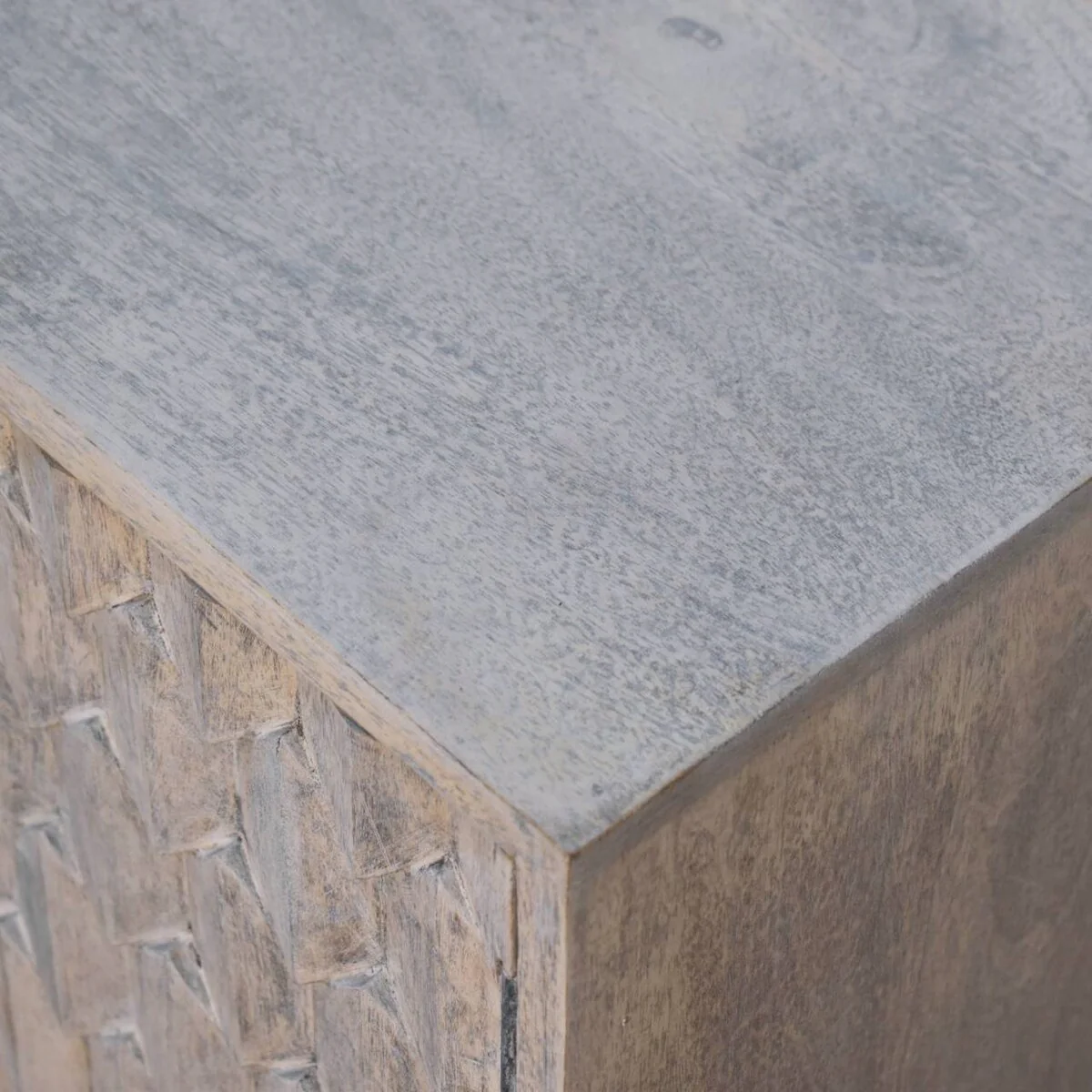 This mini cabinet has been constructed from 100% solid mango wood and has a fine stone finish. Its pineapple-carved design gives the product a unique twist and provides enough space with 2 doors that offer useful storage. Other features include shiny knobs and 4 Nordic style feet. This cabinet is the perfect addition to any home.