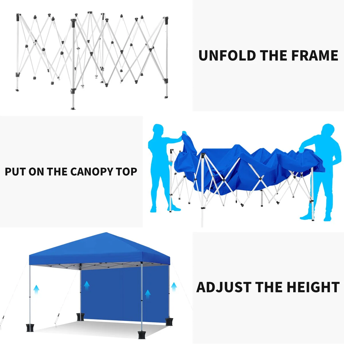 - Quick & easy setup & take down: Our 10x10 canopy tent can be set up in just 5 minutes with no tools needed. With three simple steps, stretch the frame legs, attach the canopy top, and adjust the height with a press of a button to your preferred canopy height