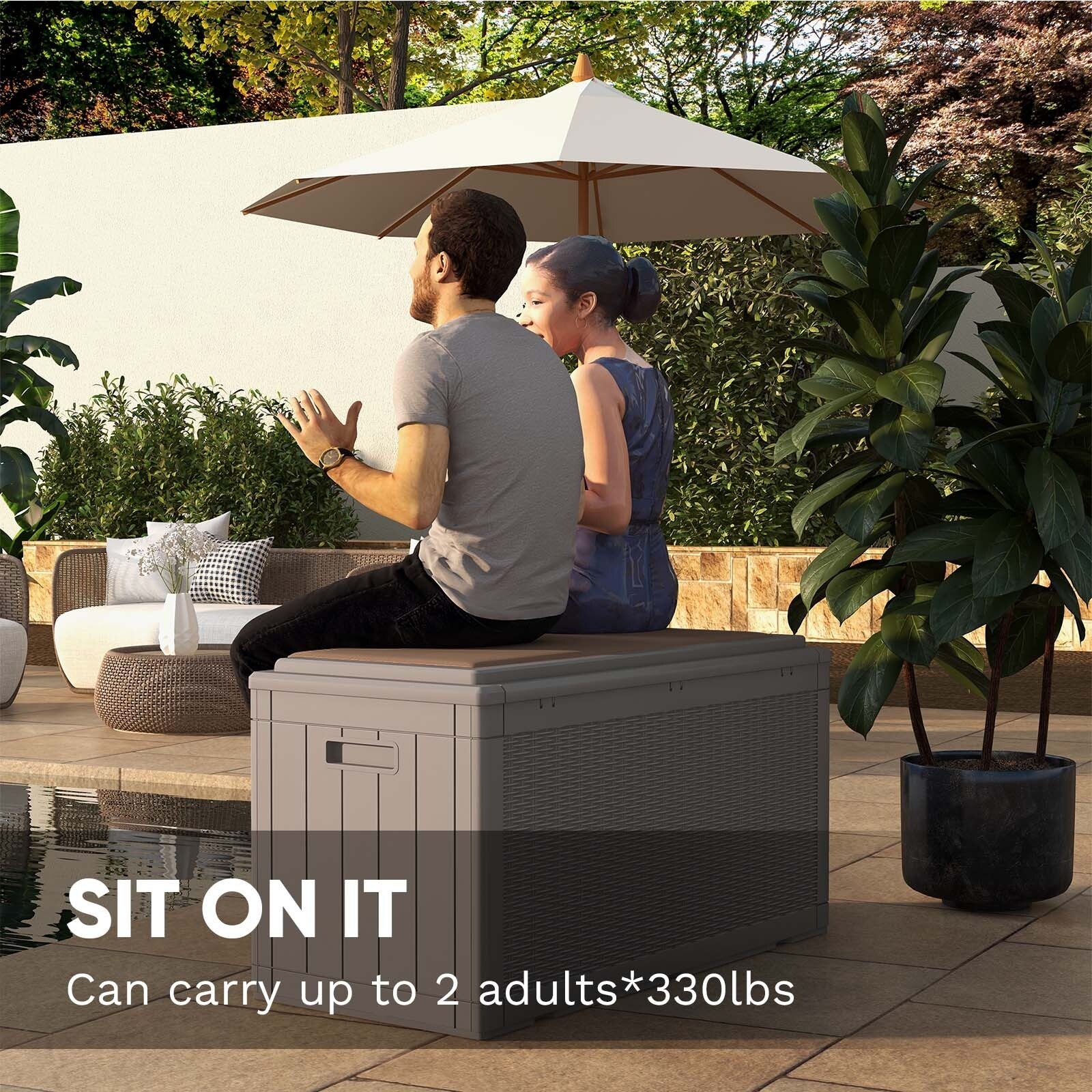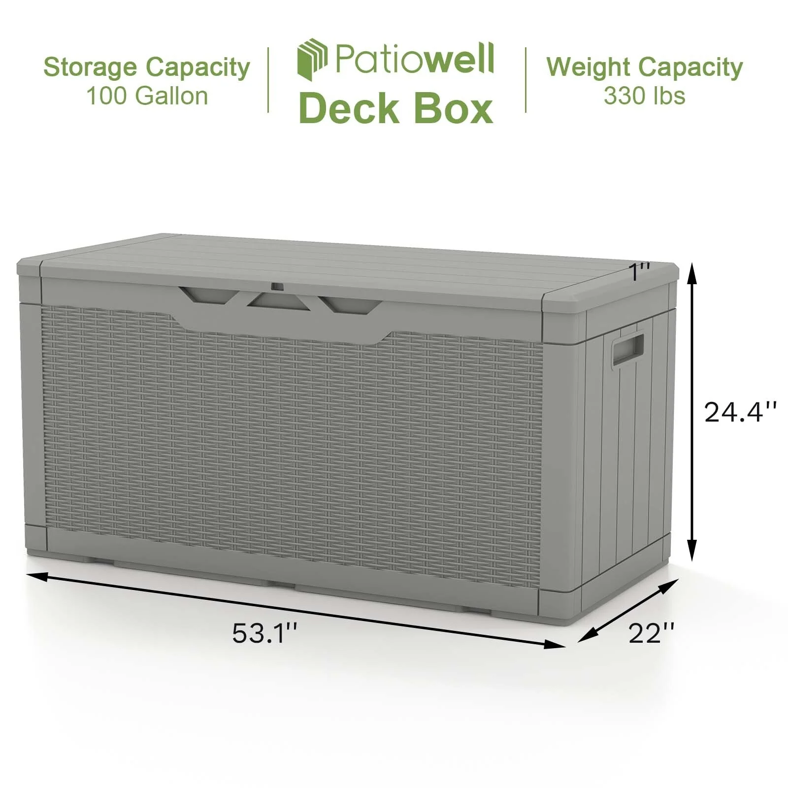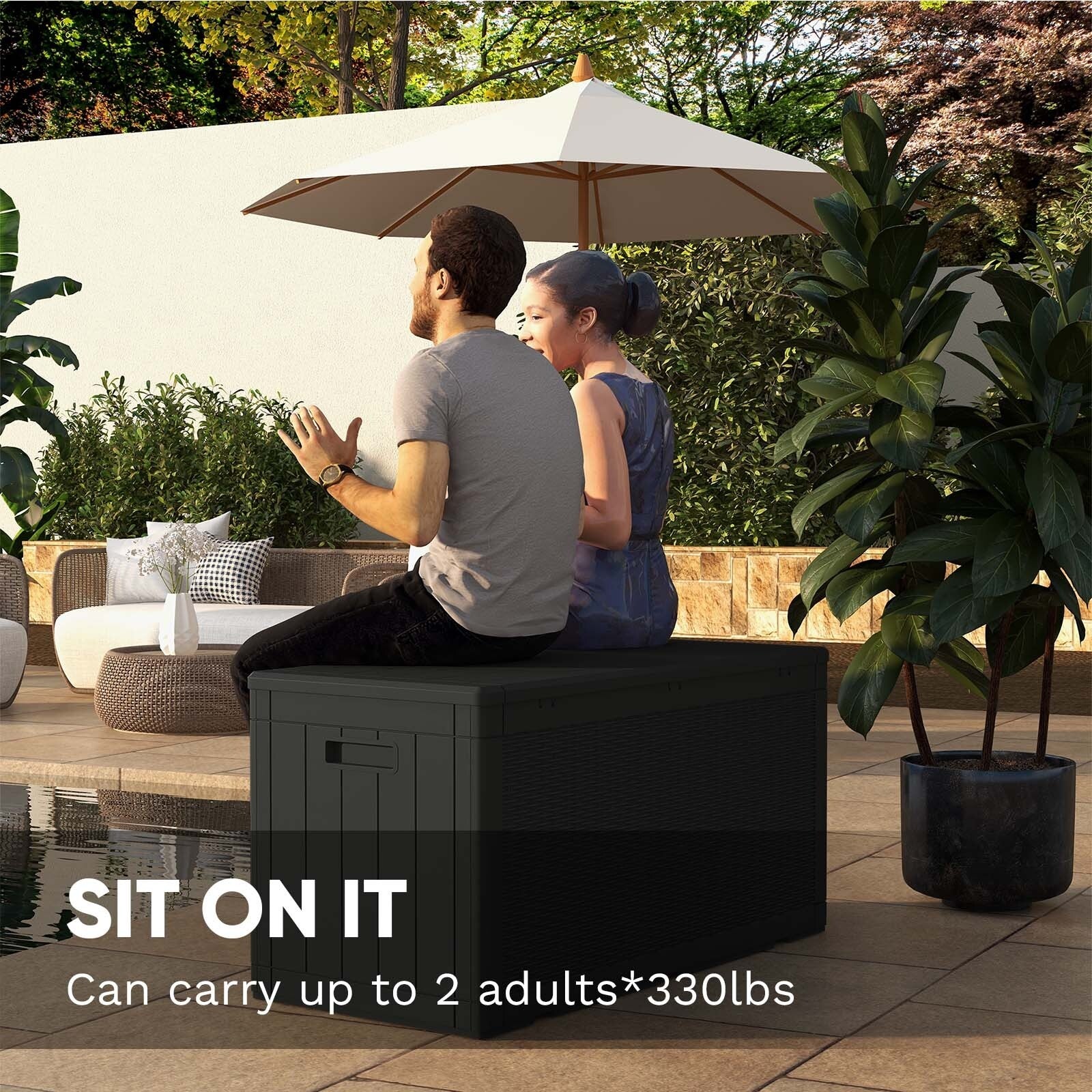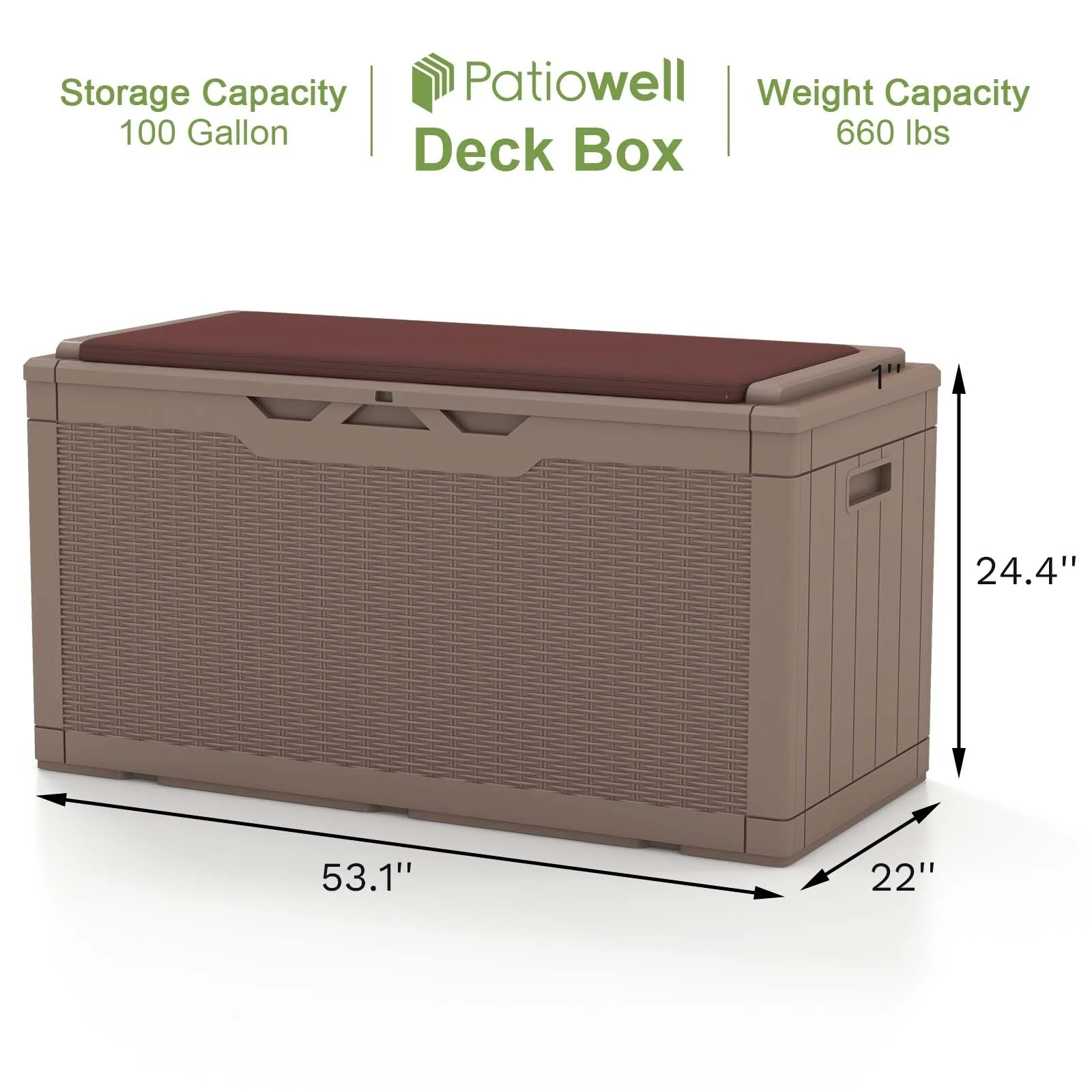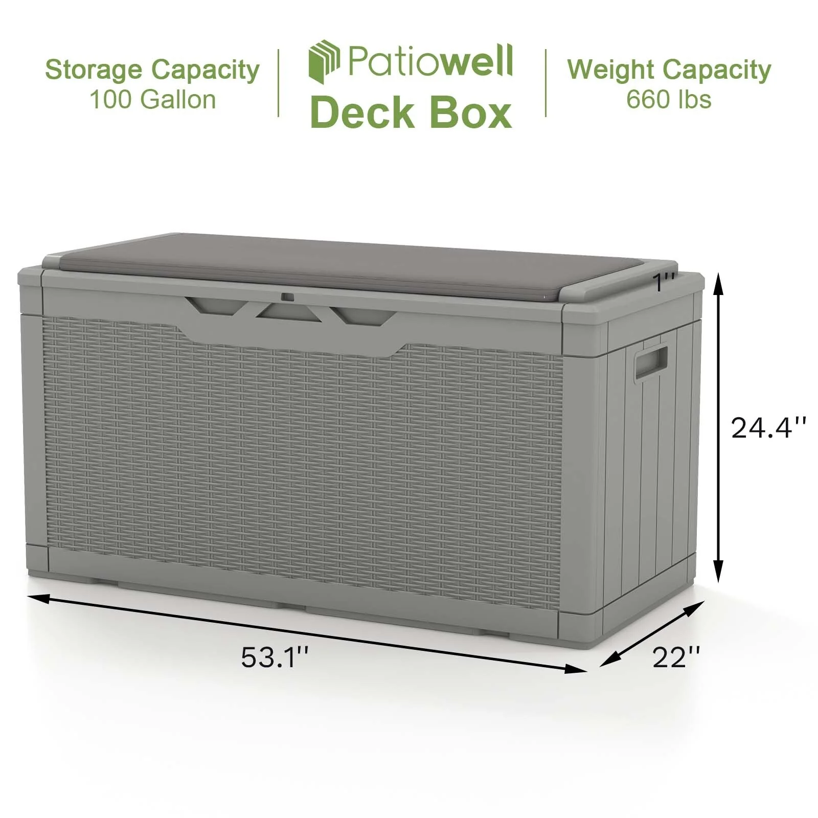 - Spacious and versatile: The deck box can store up to 100 gallons of items, such as patio furniture, pool accessories, toys, garden tools, and sports equipment. You can also use it as a bench to seat two people comfortably.