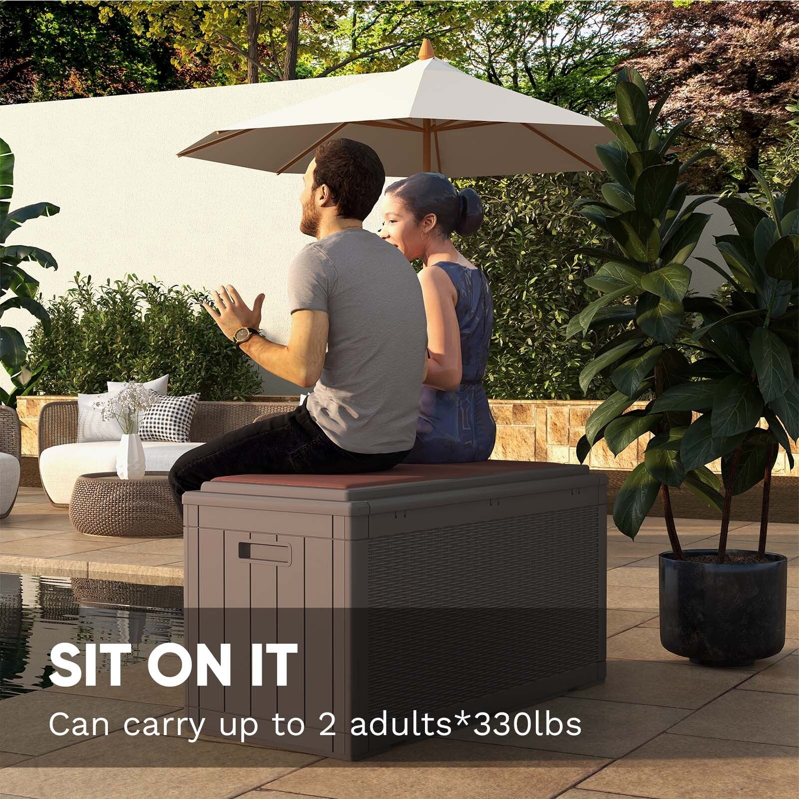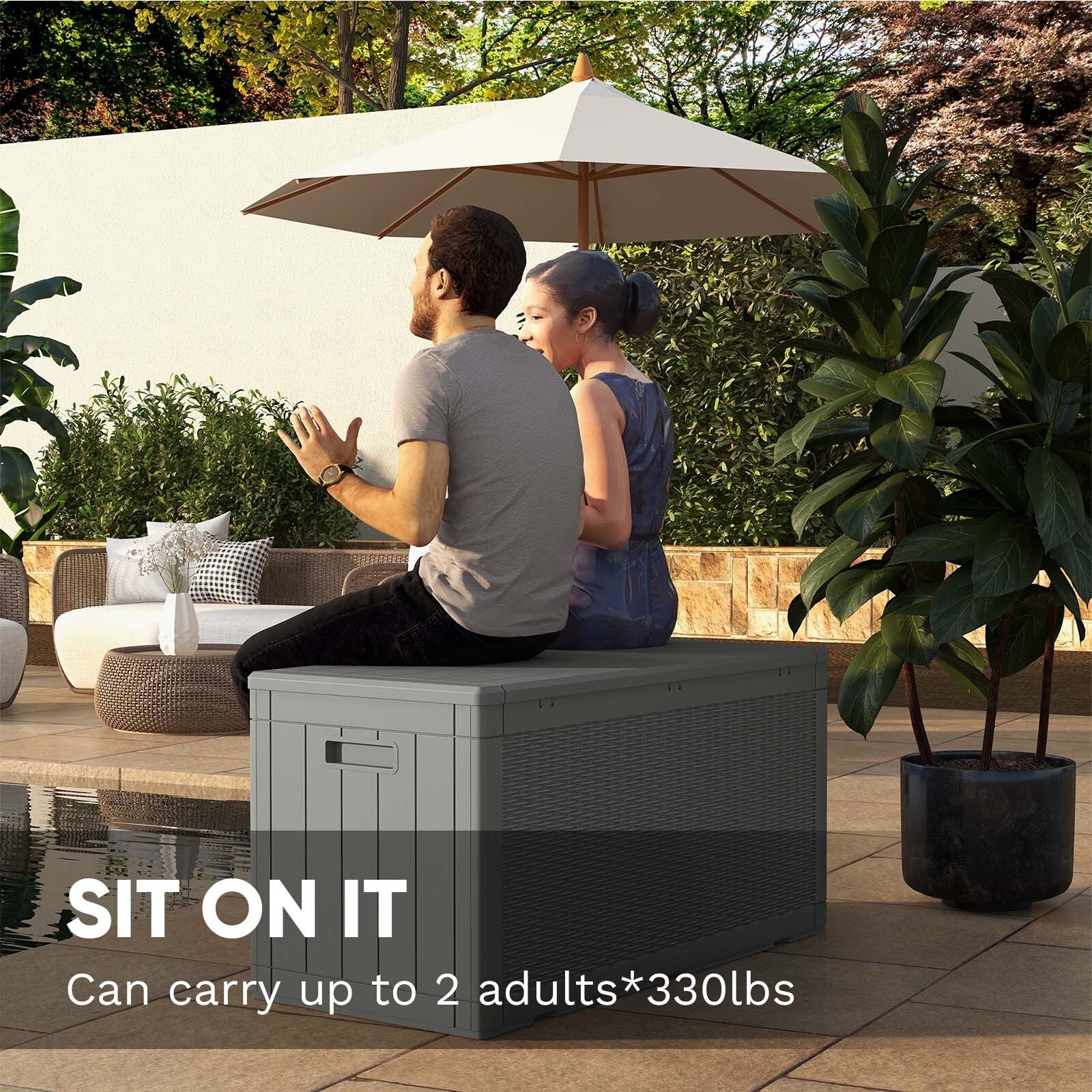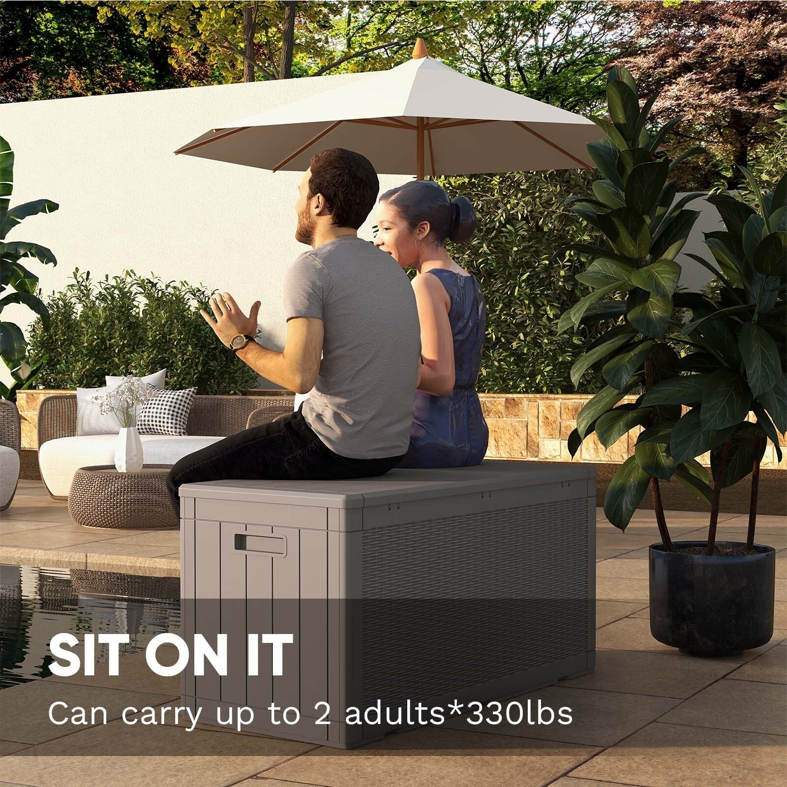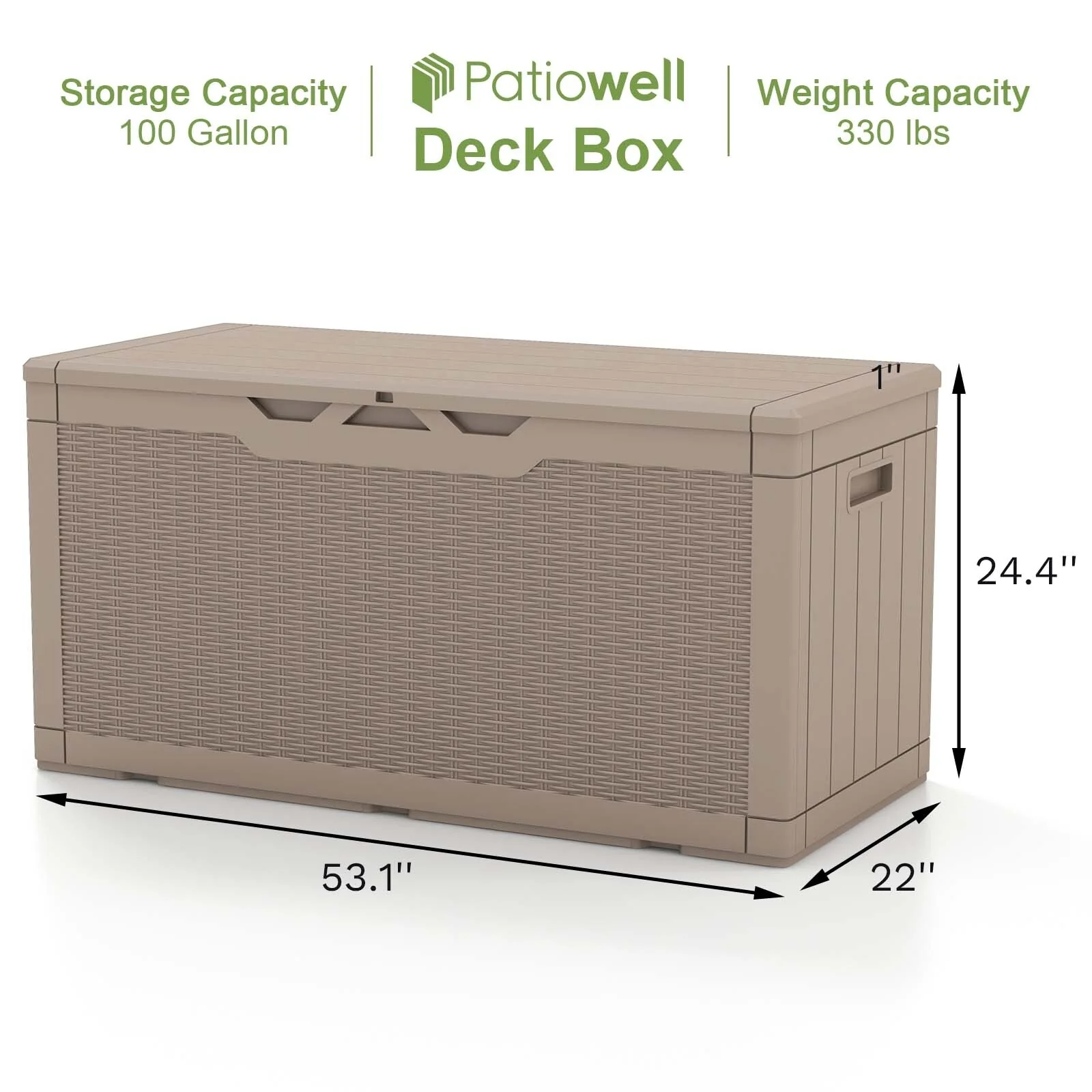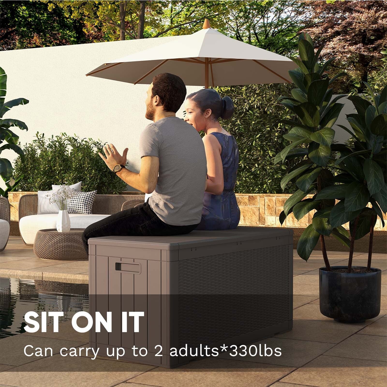 - Spacious and versatile: The deck box can store up to 100 gallons of items, such as patio furniture, pool accessories, toys, garden tools, and sports equipment. You can also use it as a bench to seat two people comfortably.