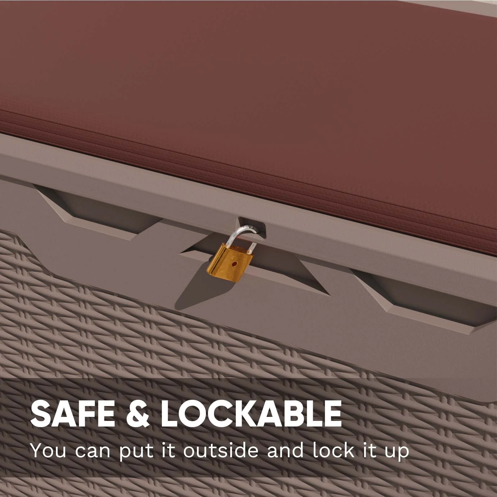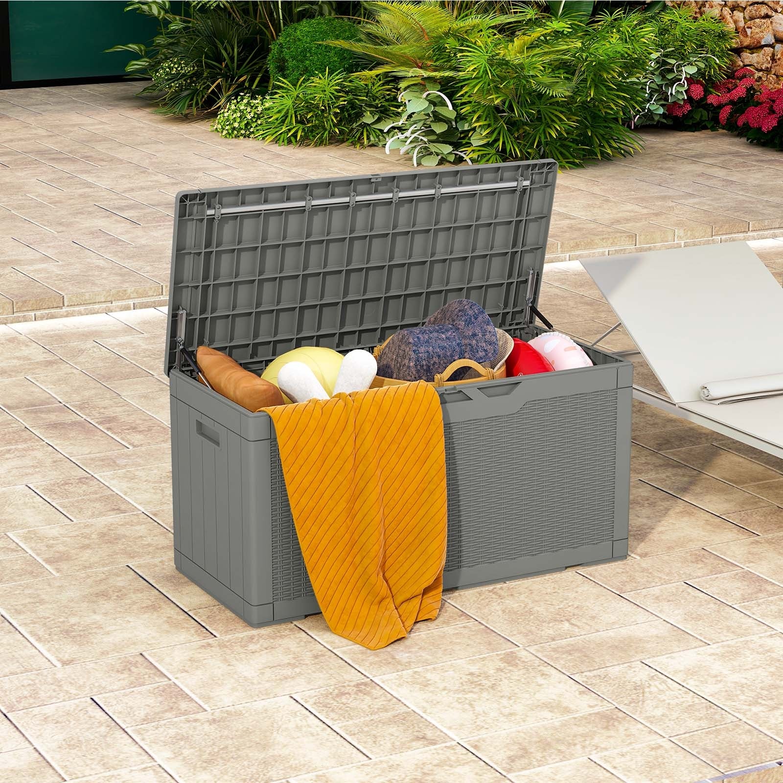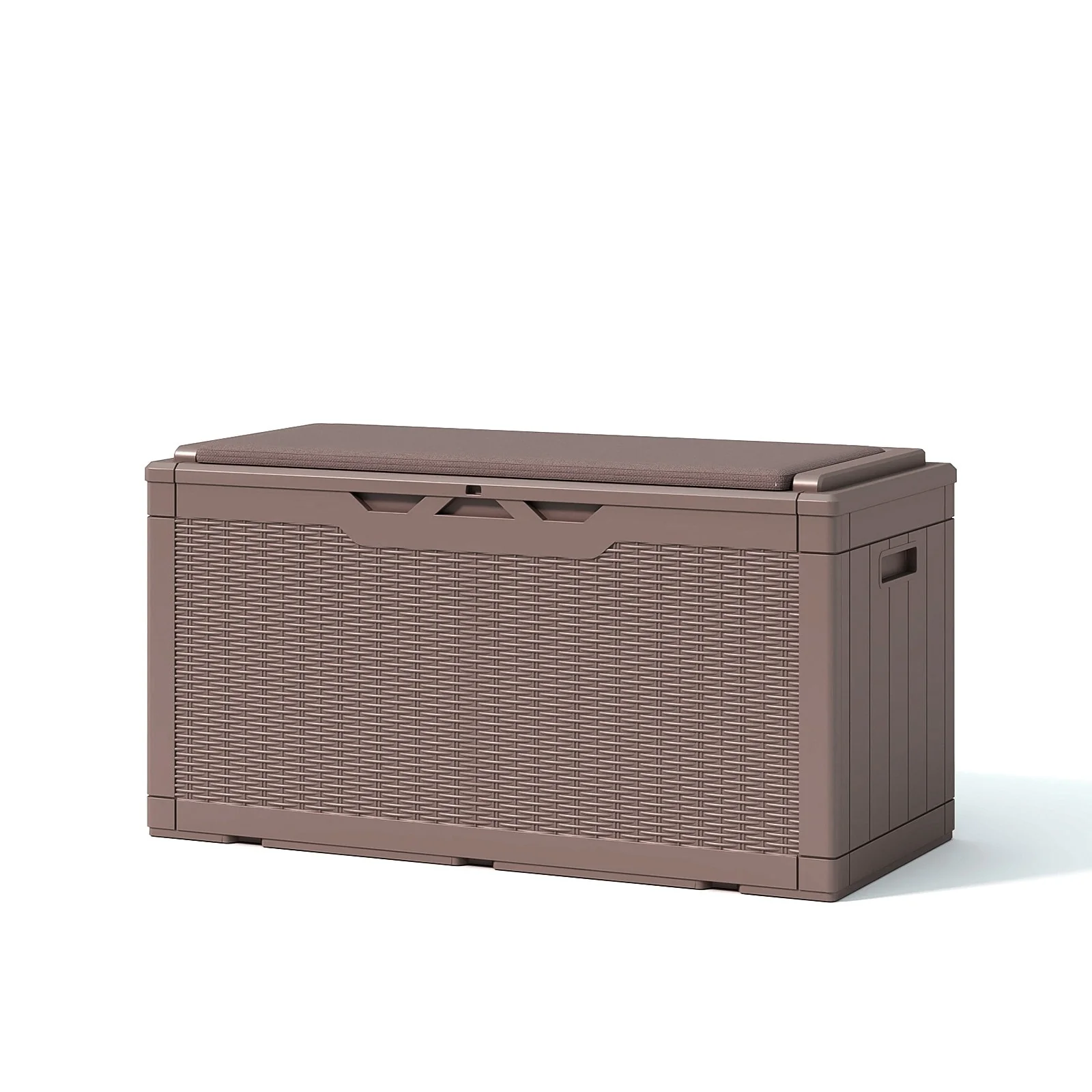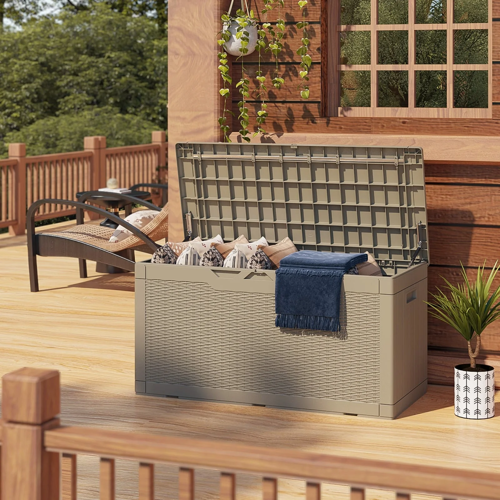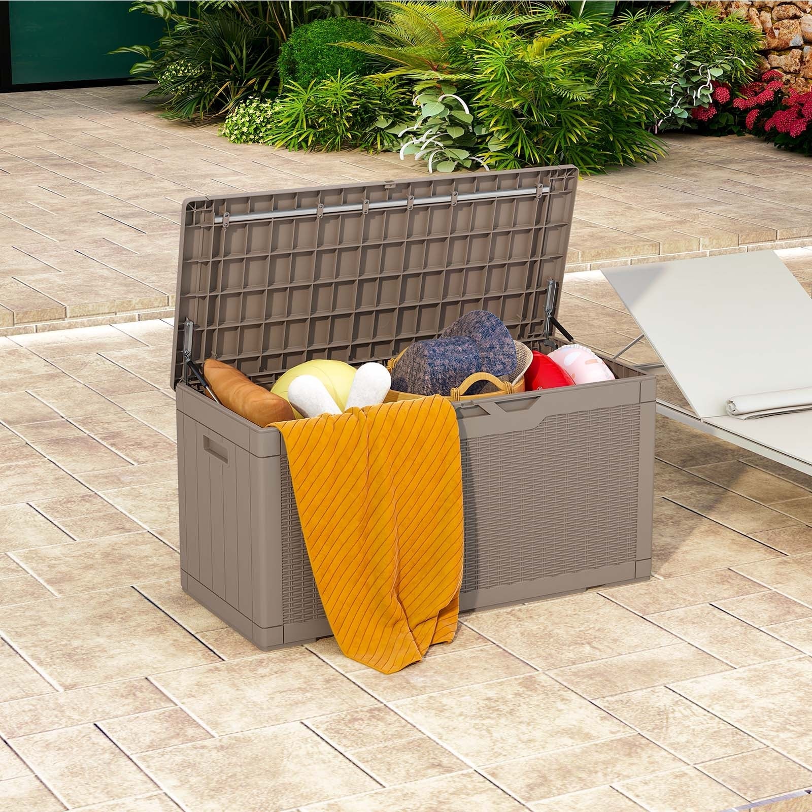 - Elegant and stylish: The deck box has a rattan design that adds a touch of elegance to your outdoor decor. It comes in four colors, brown / grey / tan / black, to match your preference and style.
