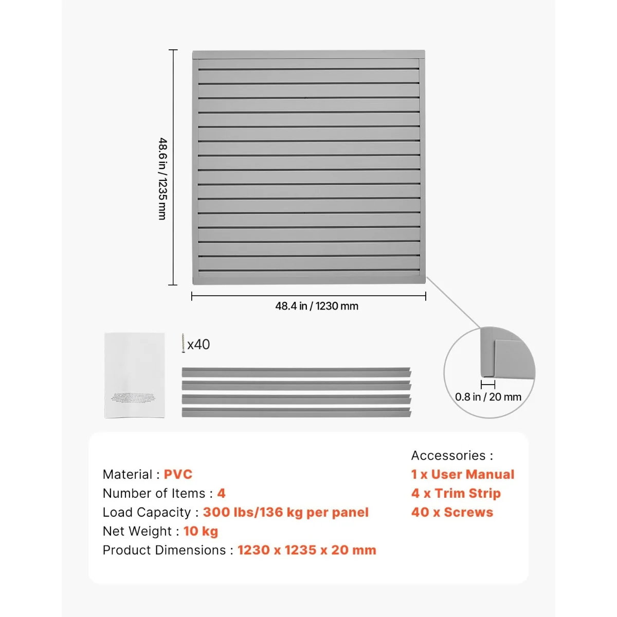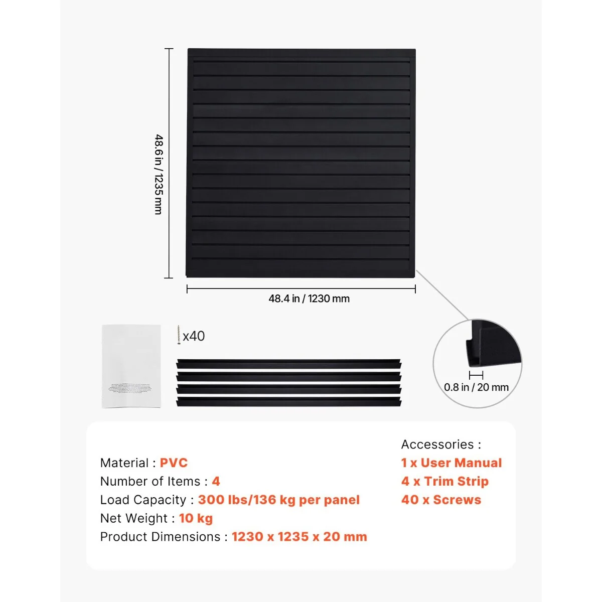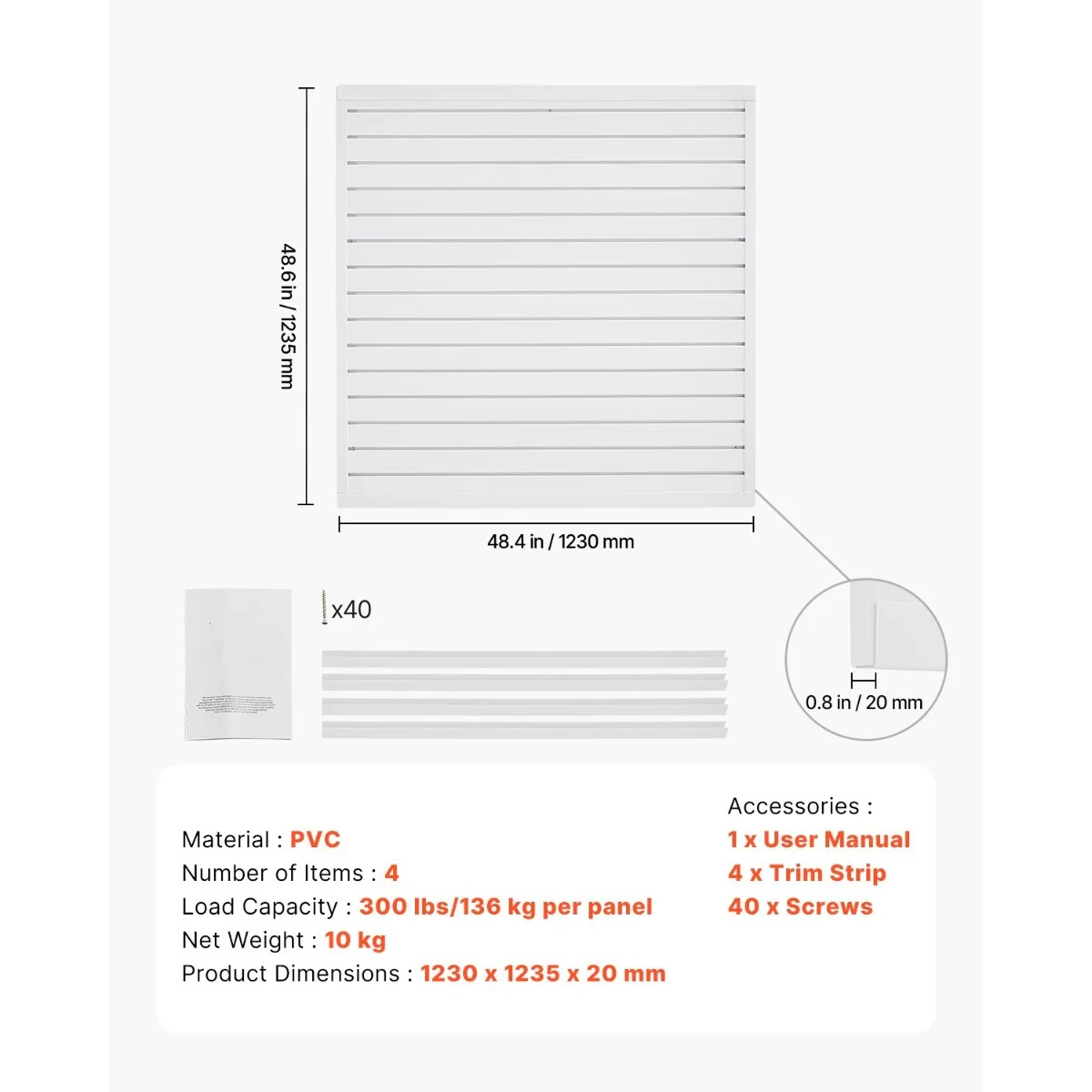 • Durable & Sturdy: Made from thick, solid PVC material, this slat wall panel offers higher durability compared to traditional materials (such as wood and metal) with outstanding weather-resistance, fire-proof, and waterproof properties, suitable for both indoor and outdoor use.