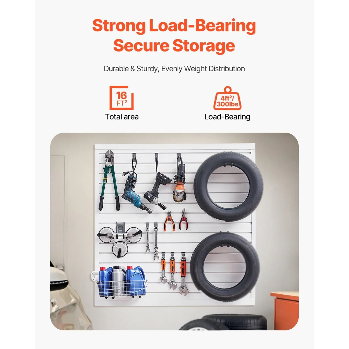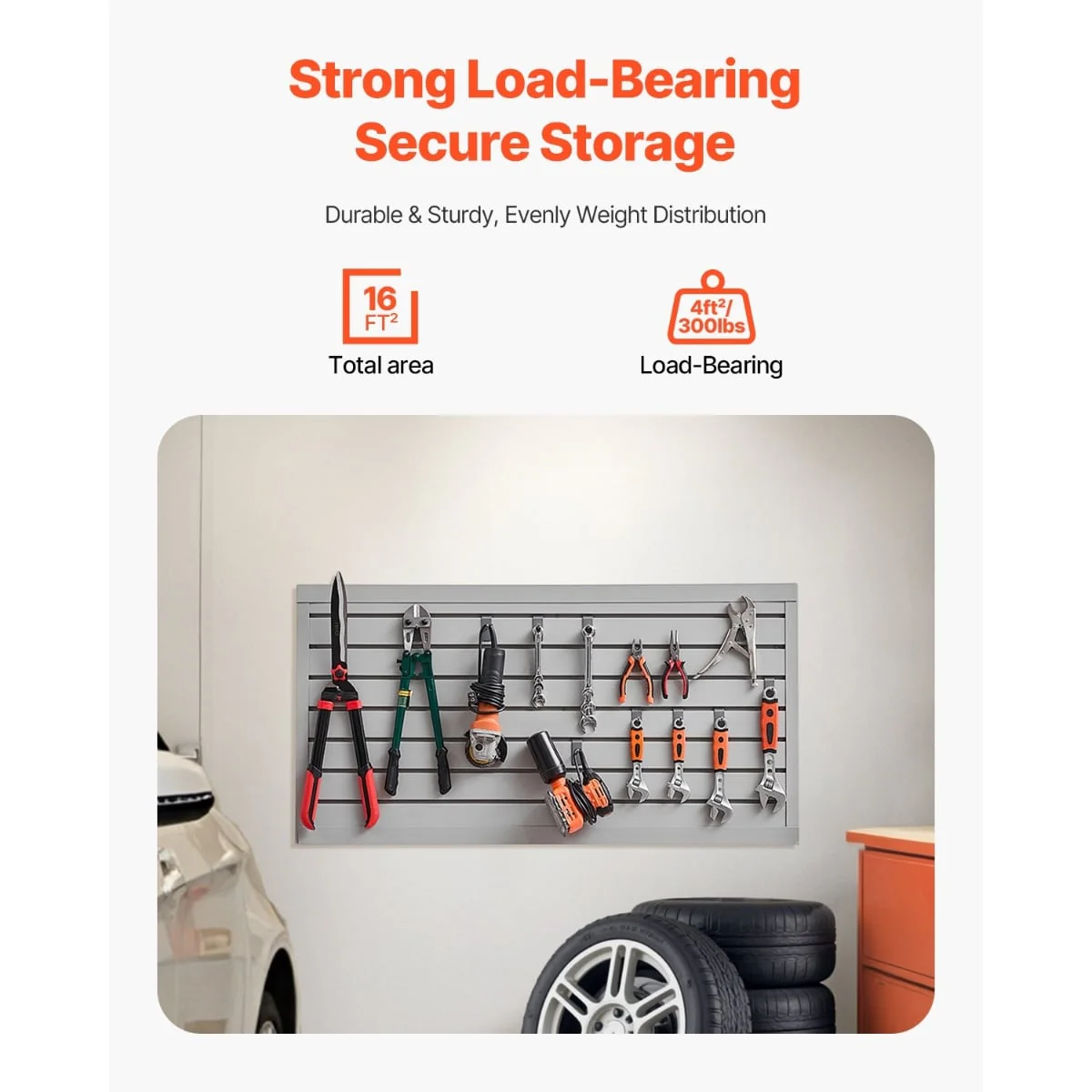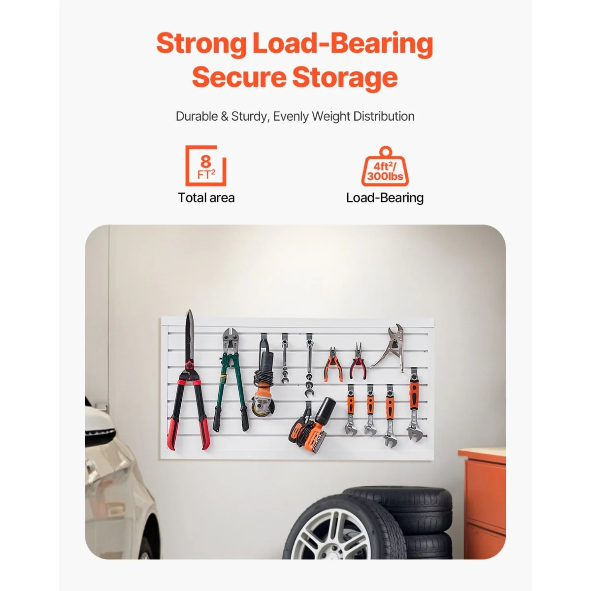 • Strong Load-Bearing Capacity: The slat wall panel can support up to 300LBS/4ft², providing stable and efficient storage for various heavy items such as hammers, drills, ladders, and more, making it ideal for use in garages, workshops, and other spaces.