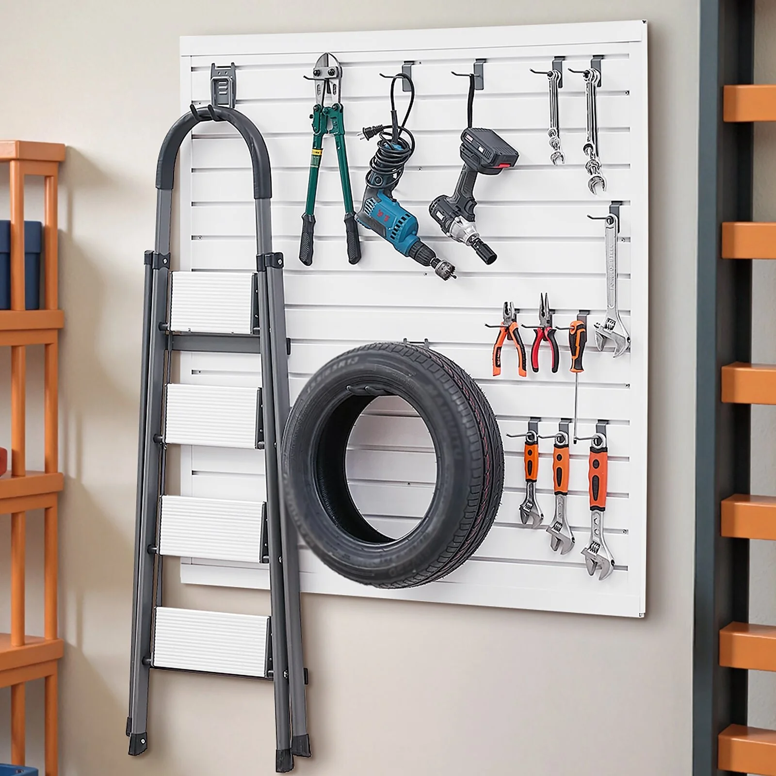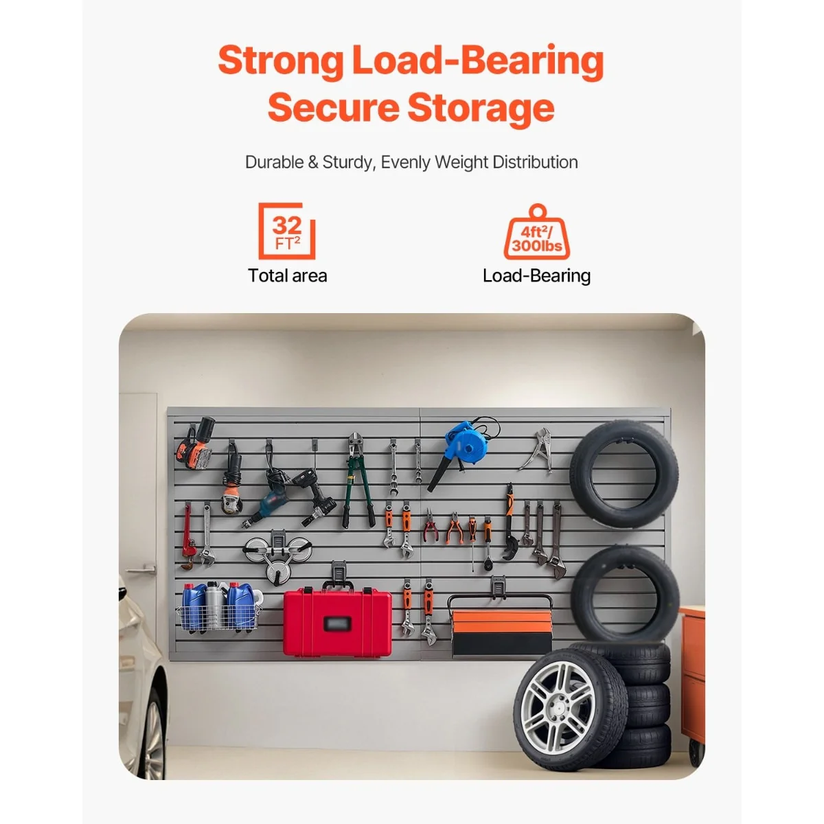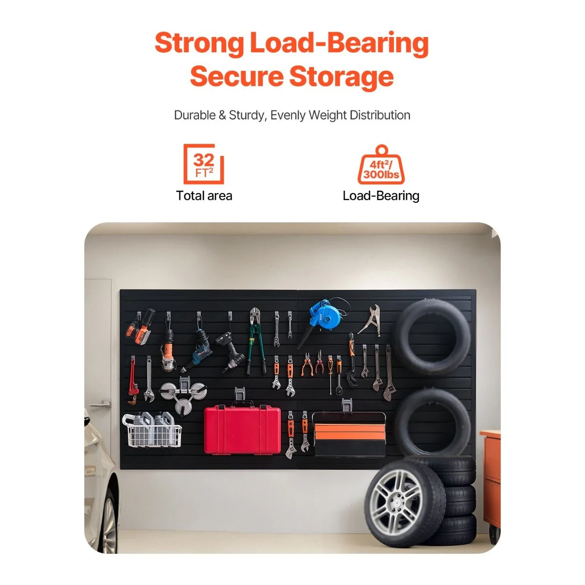 • Strong Load-Bearing Capacity: The slat wall panel can support up to 300LBS/4ft², providing stable and efficient storage for various heavy items such as hammers, drills, ladders, and more, making it ideal for use in garages, workshops, and other spaces.