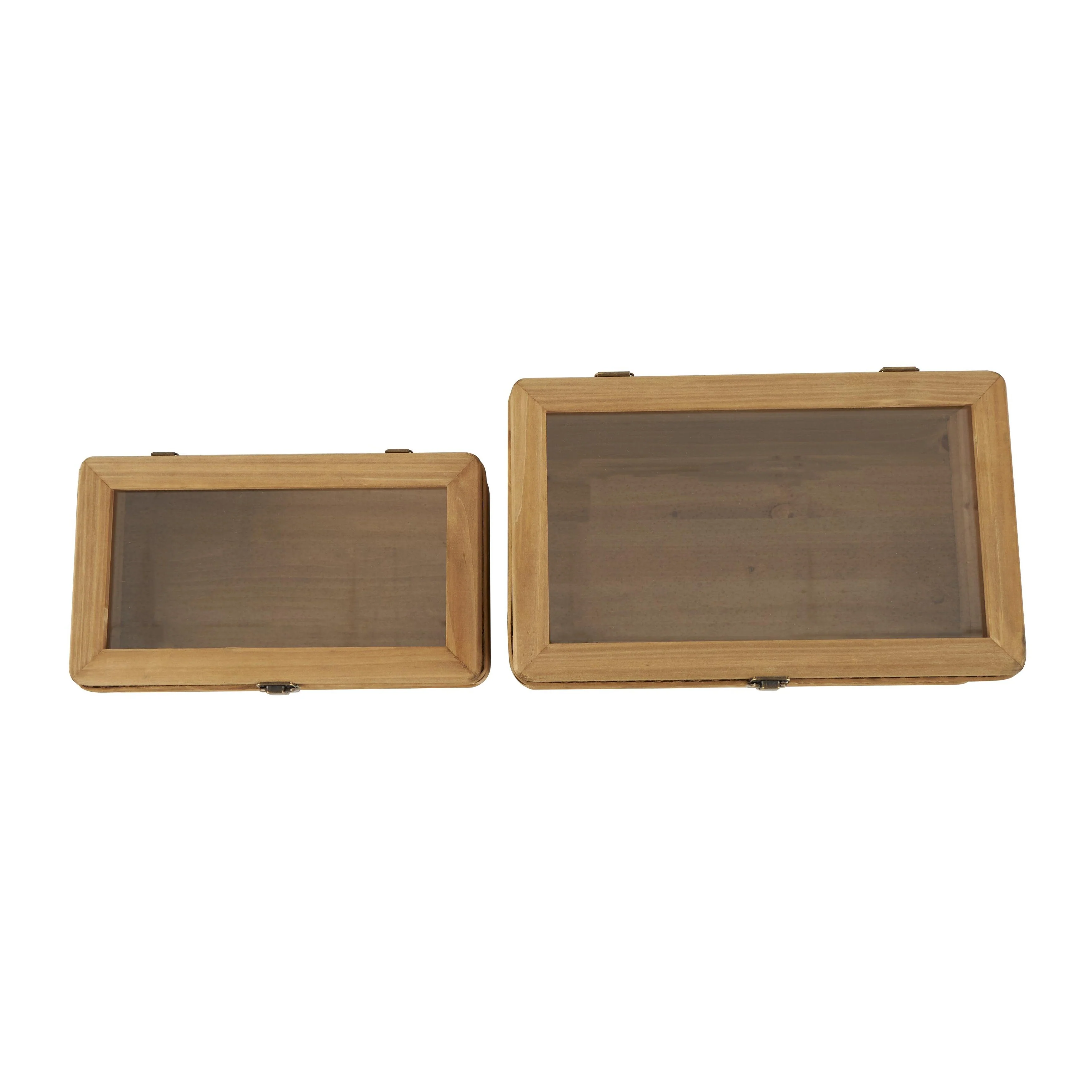 • Square decorative storage box set boasts a warm brown color and bronze latches, with clear glass tops that add an earthy touch to any decor