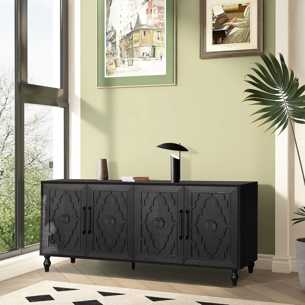Add a touch of elegance and functionality to your home with the Carved Flower Door Large Storage Cabinet. Featuring intricate flower carvings and a sturdy metal handle, this cabinet is perfect for the living room, kitchen, or entryway. It offers ample storage space to keep your belongings organized and your home stylish. The elegant carved flower design on the doors adds a unique and artistic touch, making it a standout piece in any room. The large storage space provides plenty of room to store and organize your essentials, while the durable metal handle ensures easy opening and closing. This versatile cabinet is ideal for use in the living room, kitchen, or entryway, enhancing the decor of any room with its sophisticated design. Made with premium materials, this high-quality cabinet is built for long-lasting durability. Its low-maintenance surface makes cleaning a breeze, keeping your cabinet looking pristine.