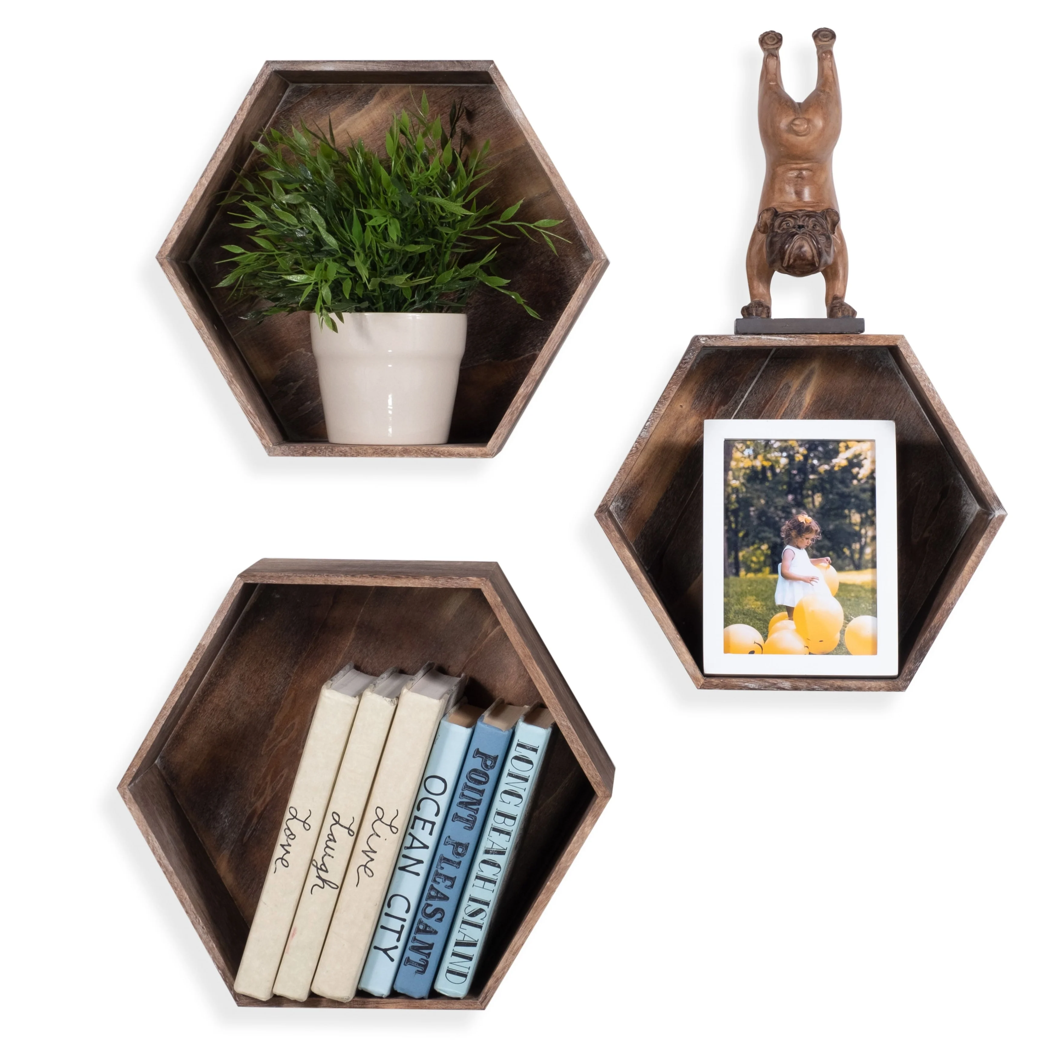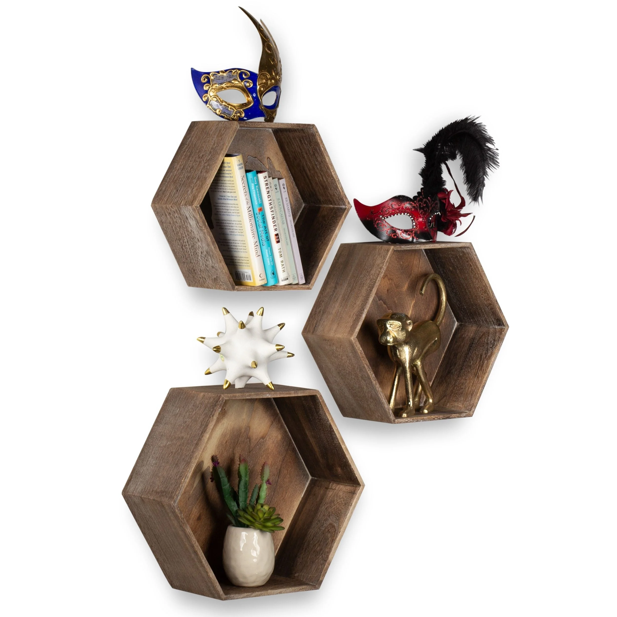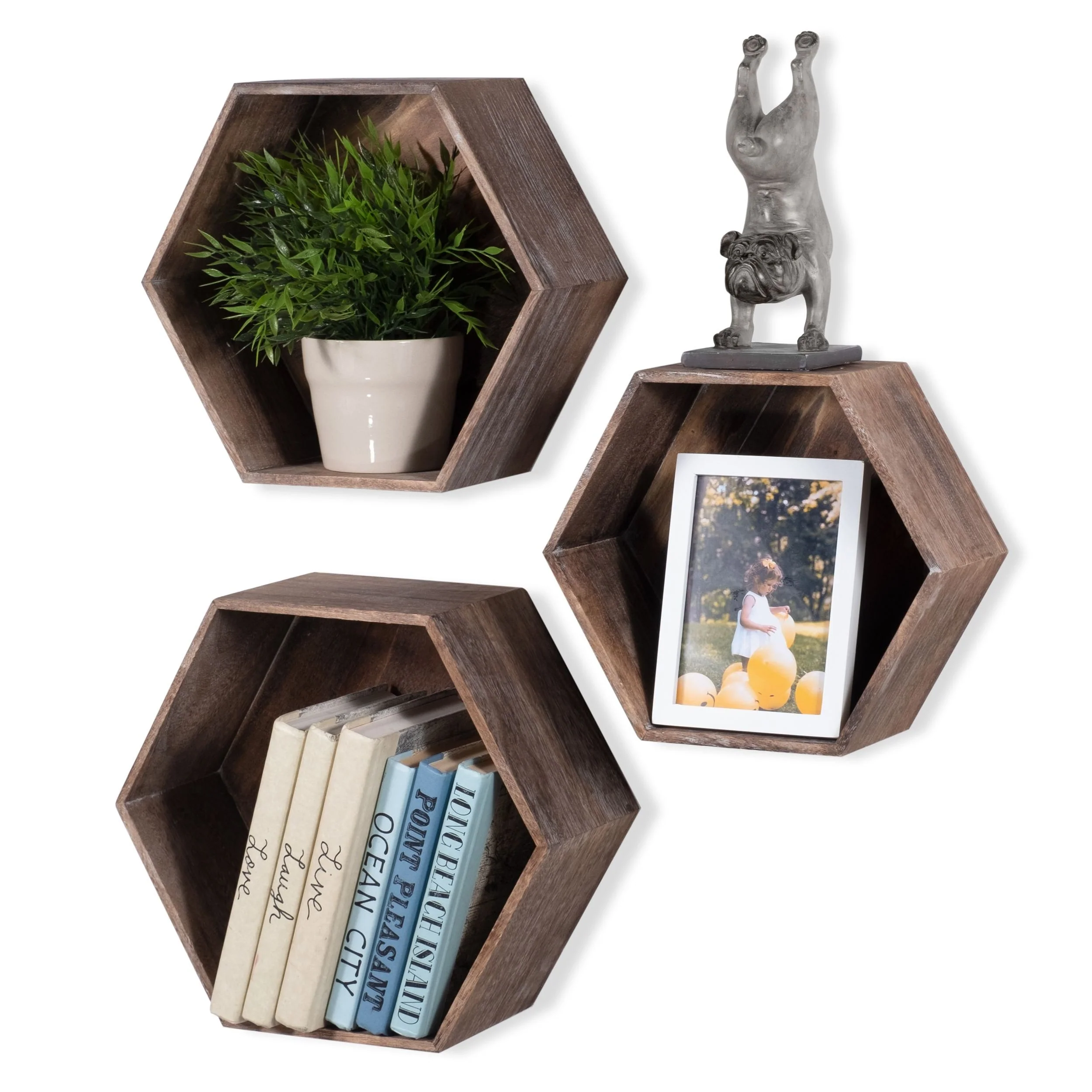 Distressed wood hexagon shelves are great for small spaces with rustic , industrial design.