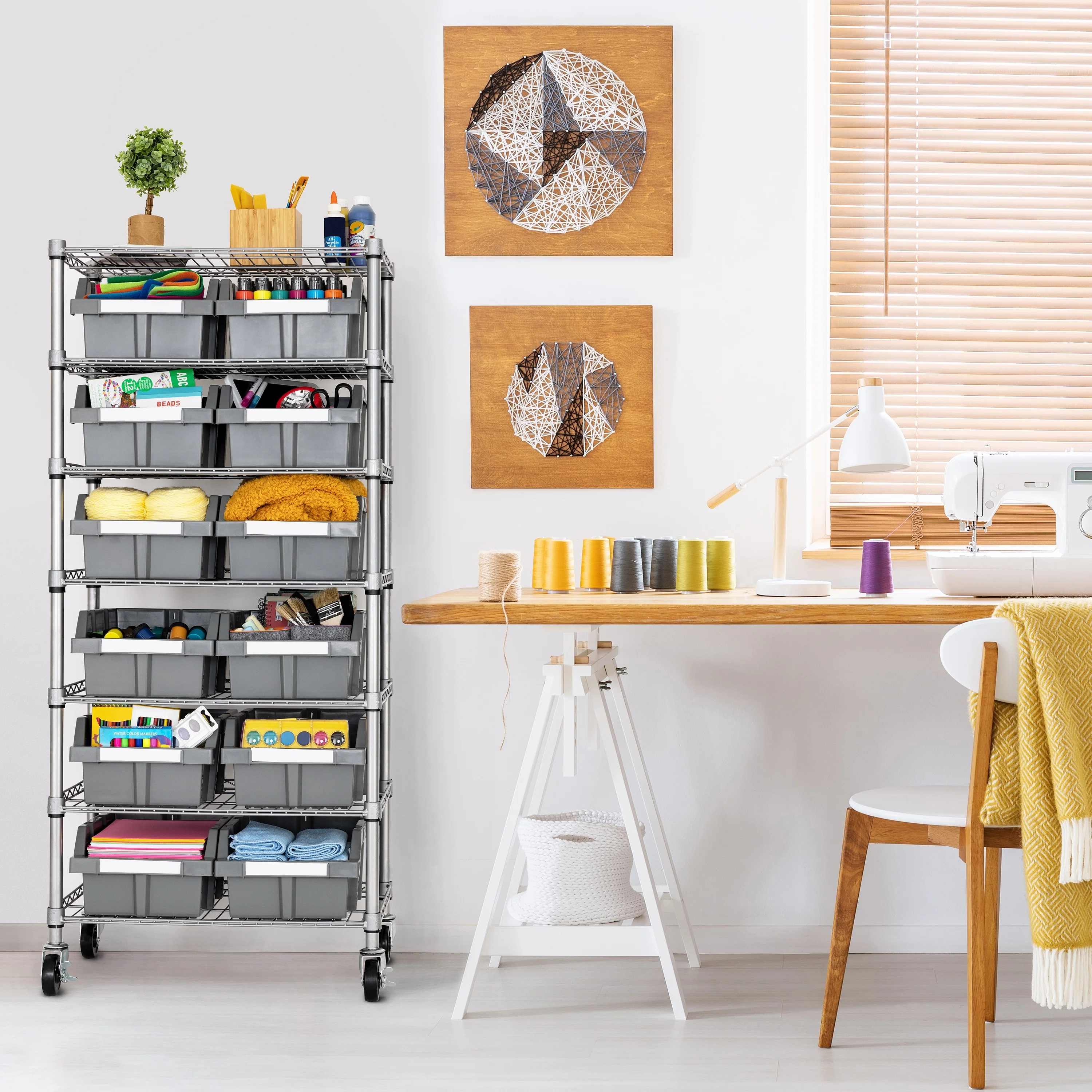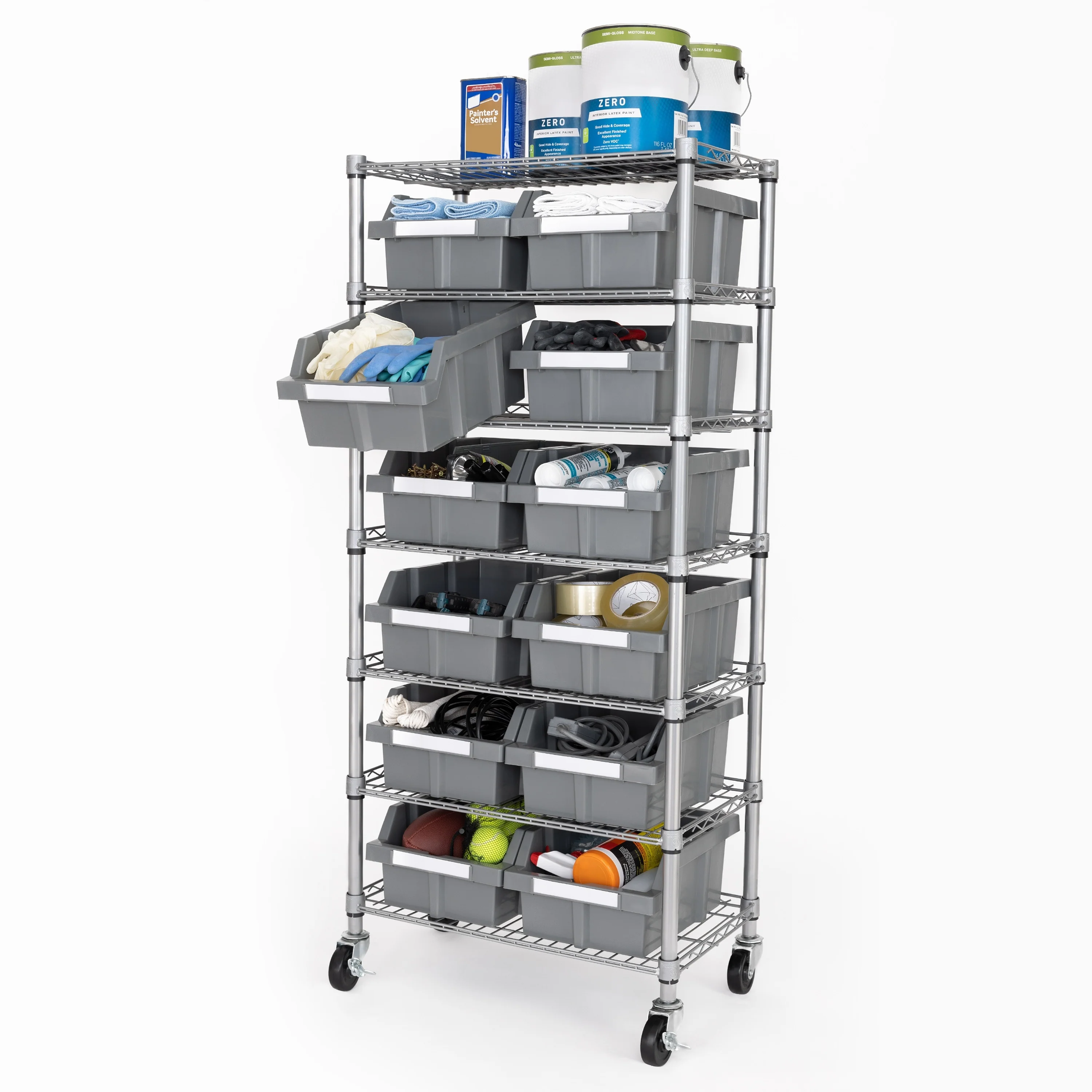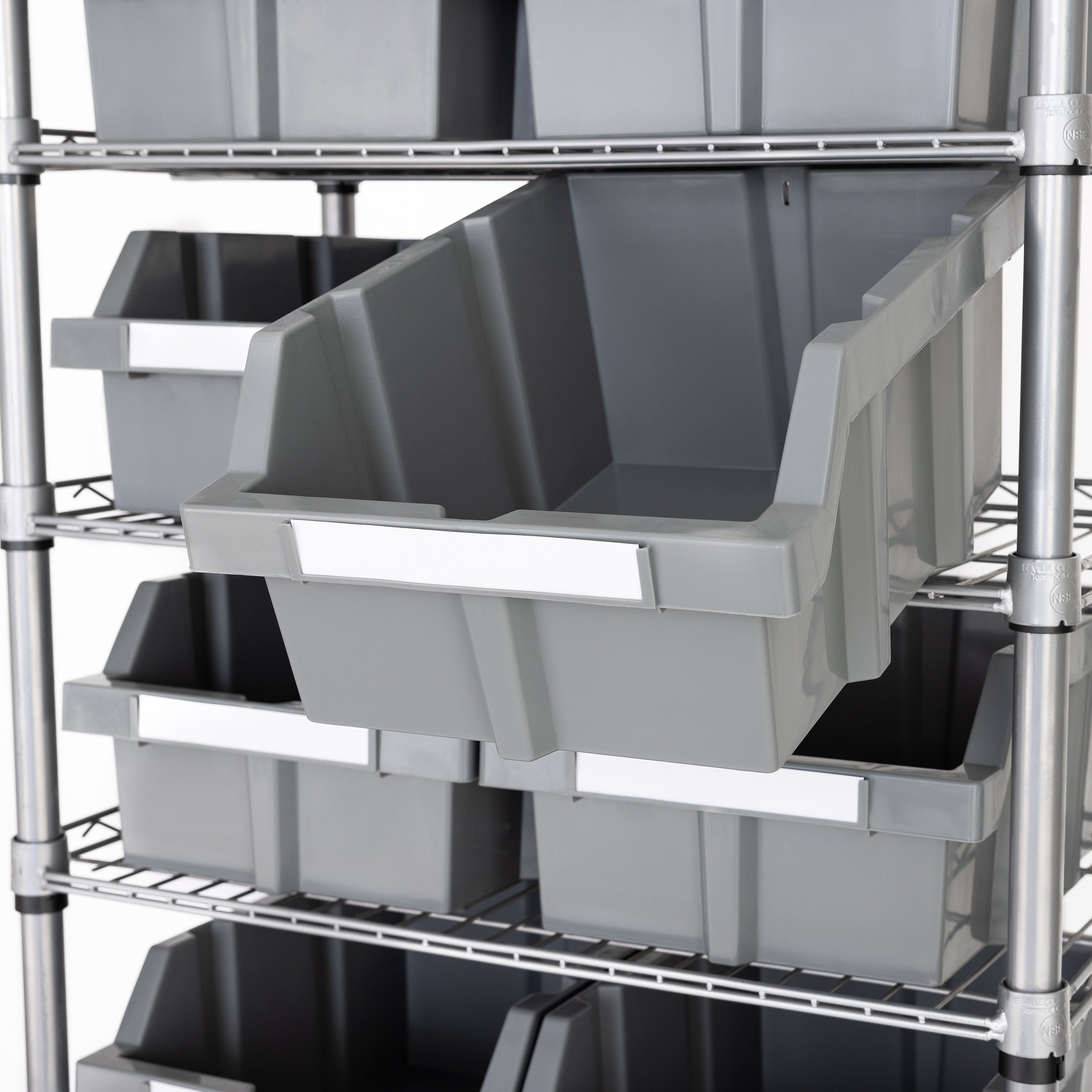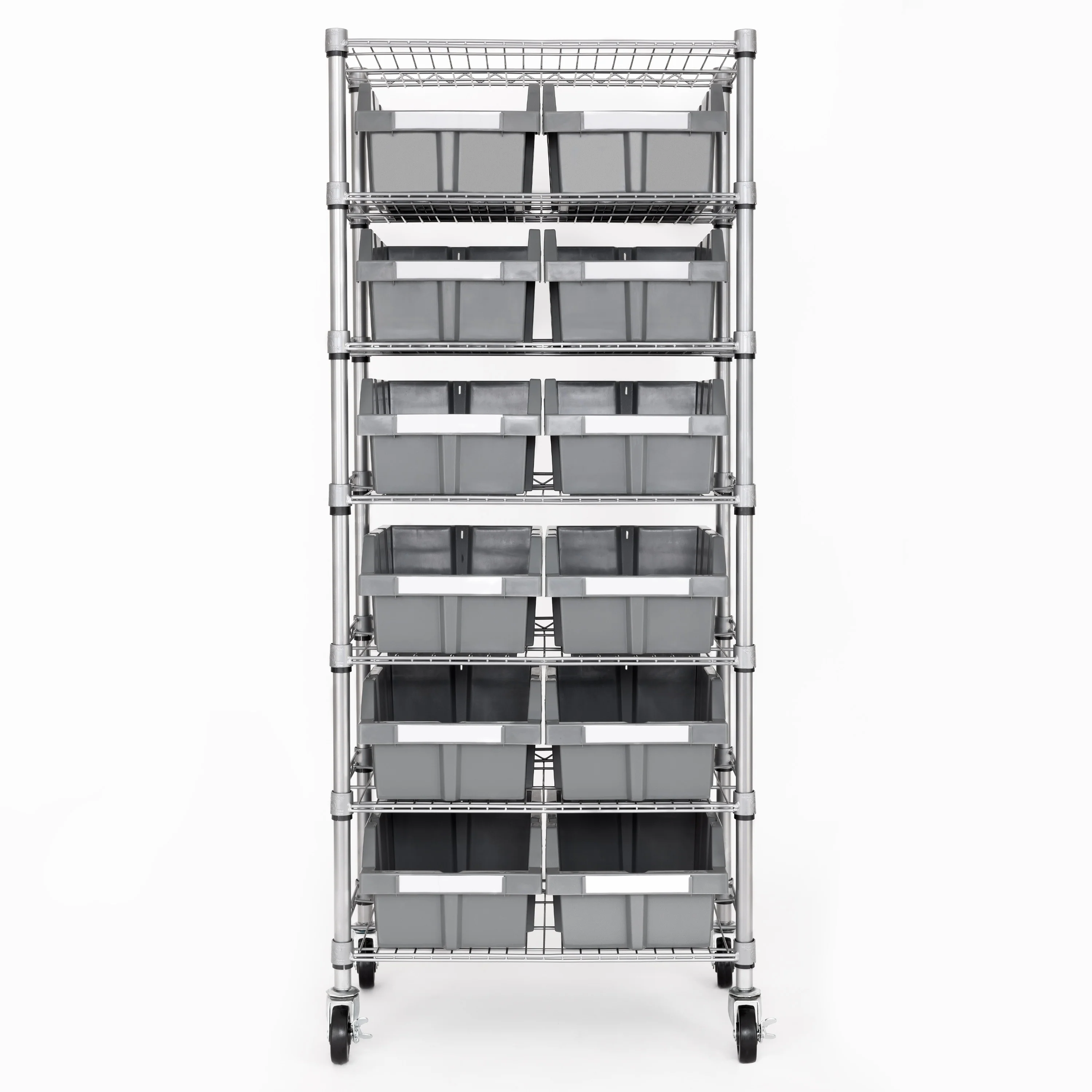 Organize and sort your space with the Seville Classics Commercial 7-Tier 12 Bin Rack Storage System. This rack includes 12 large gray polypropylene (PP) bins that slide out easily and lock onto the ventilated industrial strength steel shelves when tilted. Includes 12 large bins (10.5" W x 14" D x 7" H each), 2 bin dividers, 12 bin labels and 3" wheels (two locking). This convenient storage system can organize a variety of things include tools, hardware, documents, office and school supplies, art supplies, restaurant supplies, medical supplies, cleaning supplies, gardening supplies, and produce. This versatile mobile bin rack system is finished in a durable epoxy powder coat. The rack is certified by the NSF to NSF/ANSI Standard 2 - Food Equipment, for commercial use and measures 24" wide x 14.25" deep x 56" high. Ideal for use in restaurants, garages, warehouse, mail rooms, hospitals, schools, offices, retail, and homes.