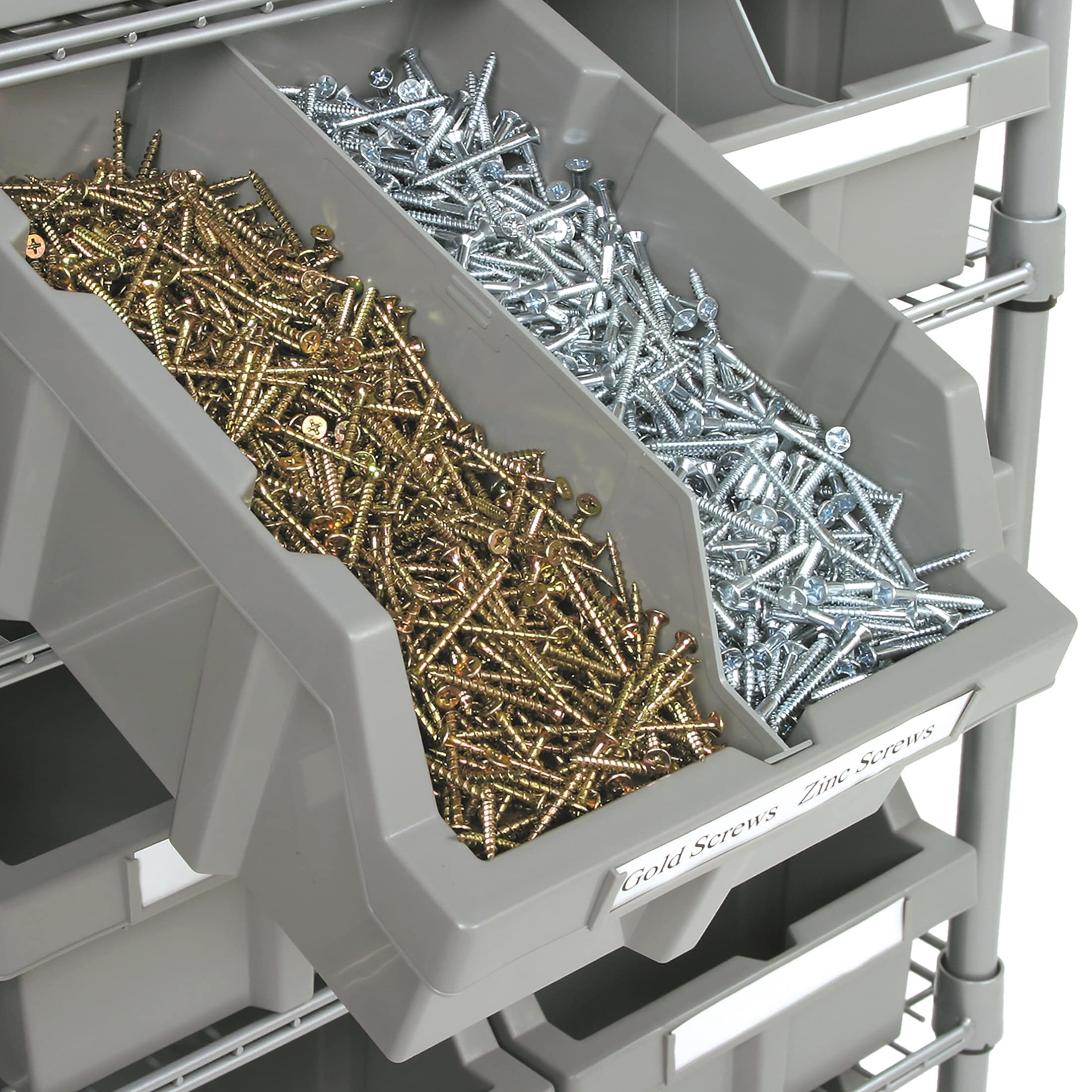 • 12 BINS + 7 TIERS - Shelving rack features durable solid steel wire construction finished in a gray epoxy powder coating and includes 12 large removable polypropylene (PP) bins, 2 bin dividers, and 12 bin labels to help store and organize items.