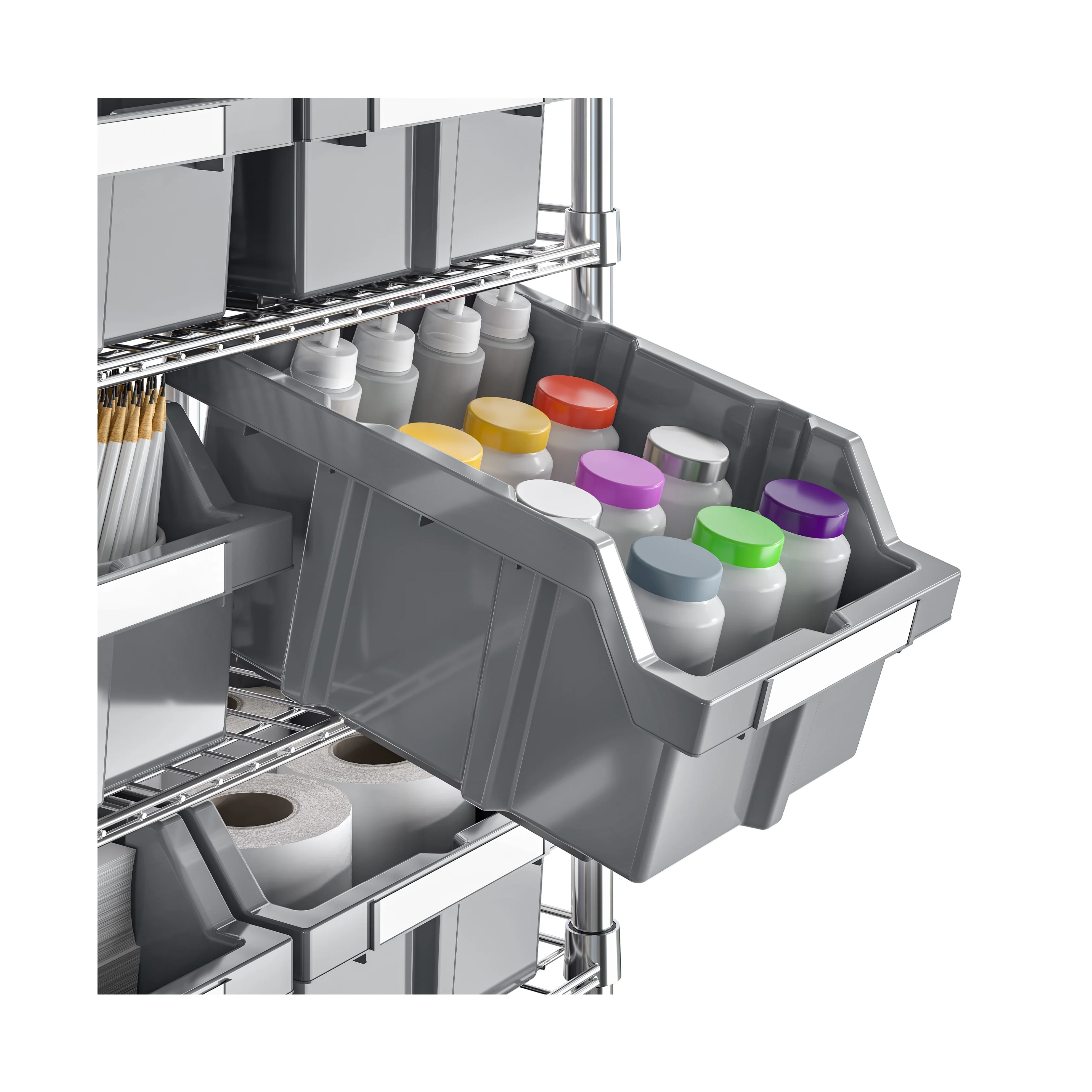 • PATENTED BIN TILT LOCKING DESIGN - The bins feature a patented design which is a custom fit for the rack. The tilt locking feature allows for easy access the bins contents.