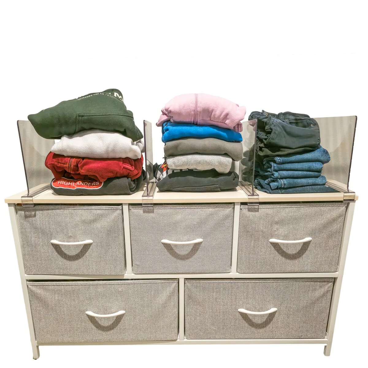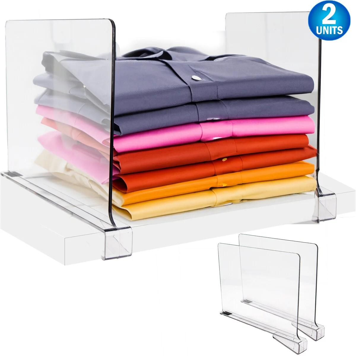 - MAXIMIZE & ORGANIZE YOUR STORAGE SPACE EFFICIENTLY: Wave goodbye to messy piles with the Acrylic Shelf Dividers. Our shelf dividers maintain a seamless look in any closet, helping you easily divide wide shelves and stack items such as clothing, sweaters, towels, purses, blankets, and sheets into neat high piles so you can quickly find what you're looking for.