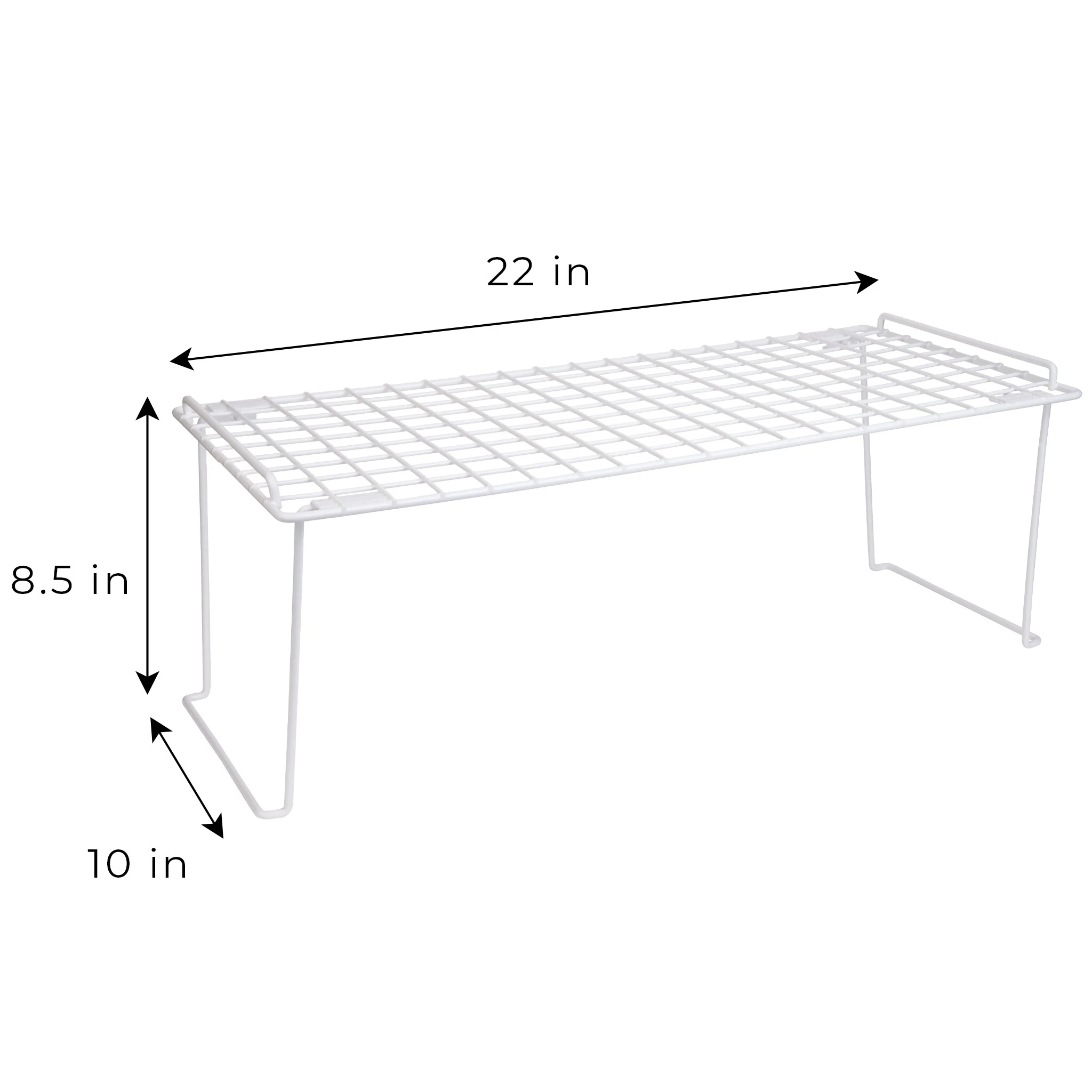 The perfect item to help maximize cabinet space and organize your kitchen. The extra large is small sized w/ a stackable design to store cups, plates, spices, cans, and other cooking ingredients and kitchen items. Package Includes Extra Large Stacking Shelf Rack w/ plastic feet that protect cabinets, countertops, and other surfaces against scratches and nicks. Ideal home storage solution for kitchen cabinets, pantries, craft closets, bathroom cabinets. Features and Benefits Includes pe coat rust resistant finish that keeps the shelf sturdy and protected from rust and other corrosives. Makes use of the wasted space by creating two levels of storage. Product Specifications Dimensions: 22(L) x 10(W) x 8.5(H) inches Color: White Material: Steel Frame w/ Rust Resistant Coating Weight: 1.38 Pounds
