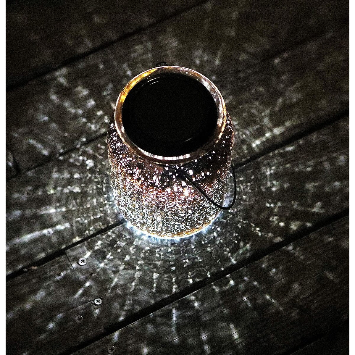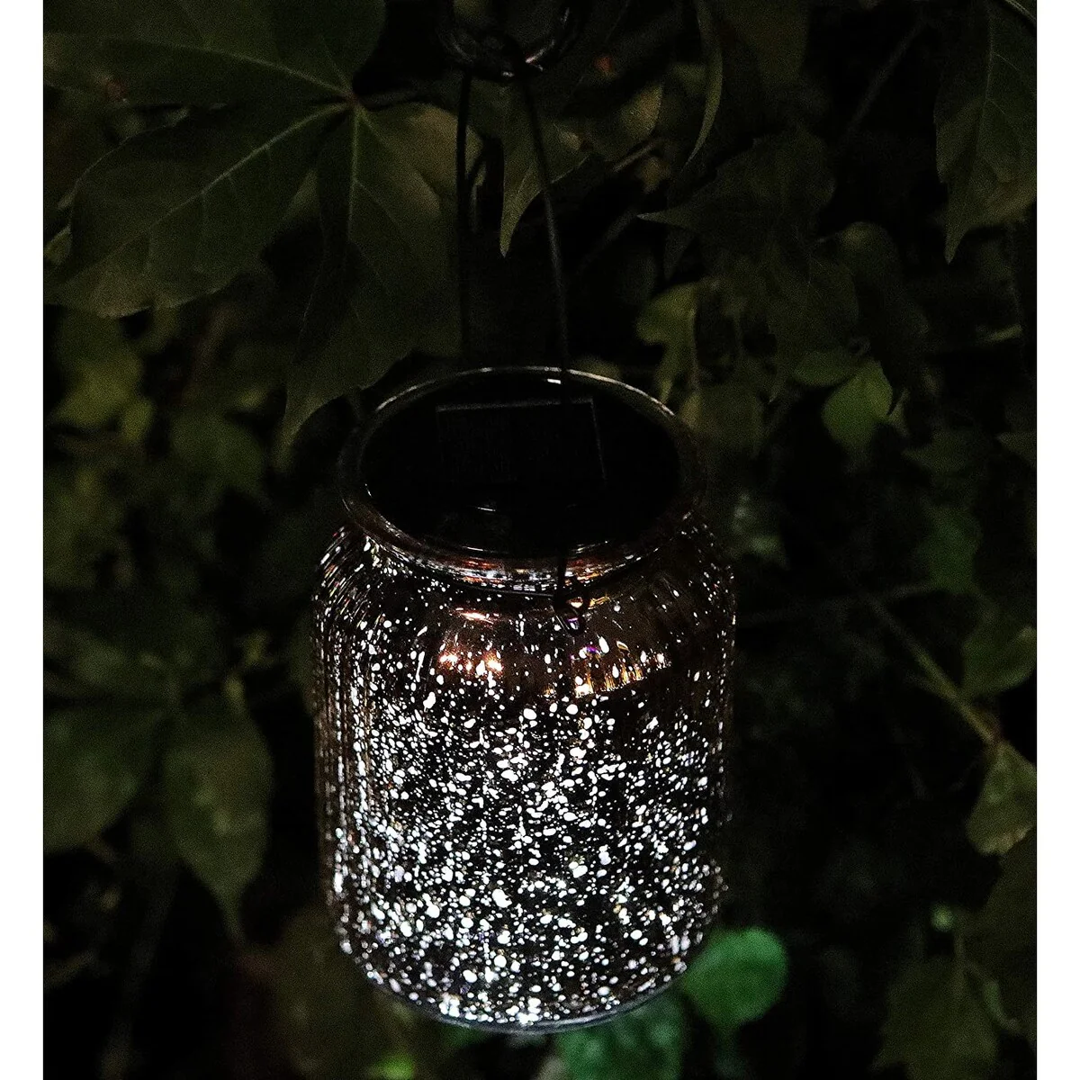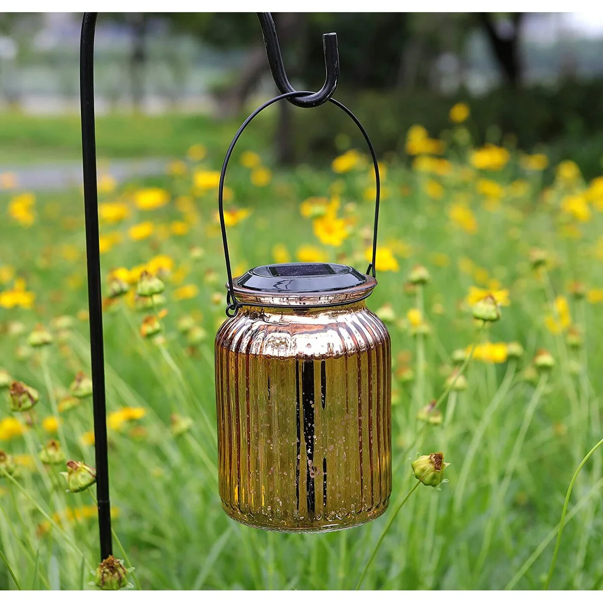 Glass Jar Size: 4.3x4.3x 5.8 / 9.8 inch, weight 1.2 lbs Solar Hanging Lights Material: bronze glass jar + metal handle + electronic parts Solar table lamps power source: solar powered, with 1x Ni-mH AAA 400mAh rechargable battery included. Solar Glass Jar Lights Color: warm wite LED reflects through the bronze glass jar, creating amazing lighting effects. Solar Outdoor Lights Usage: the glass jar, metal handle and solar panel are all waterproof, can be used for outdoor decorations, the jar comes with the metal handle, so it can also be hung on trees and wall.