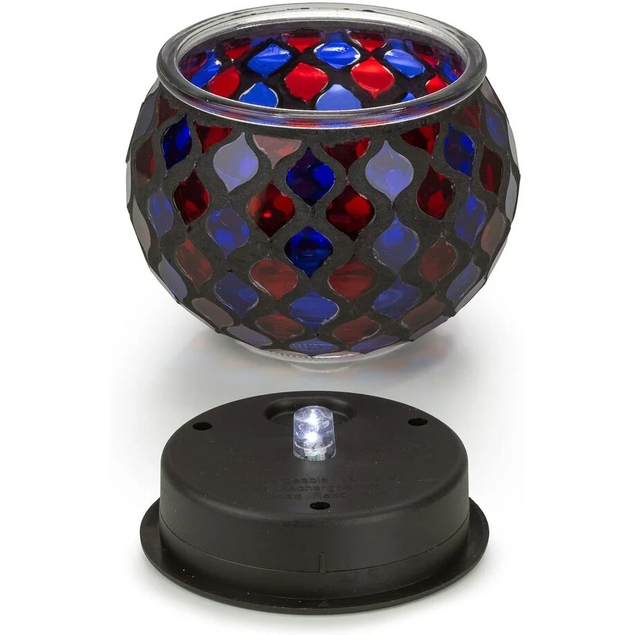 Red & Blue Mosaic Glass LED Table Light makes a beautiful decorative lighting accent for your home. Ideal gift for your families or friends. Perfect for indoor use and provides a decorative touch around windows and any indoor area that receives ample light. Ideal for patios, decks, gardens, poolside and walkways. Bright LED lights casts a beautiful pattern. Solar Powered LED light can also be removed and glass base can be used as a decorative candle holder for tea lights and votives.