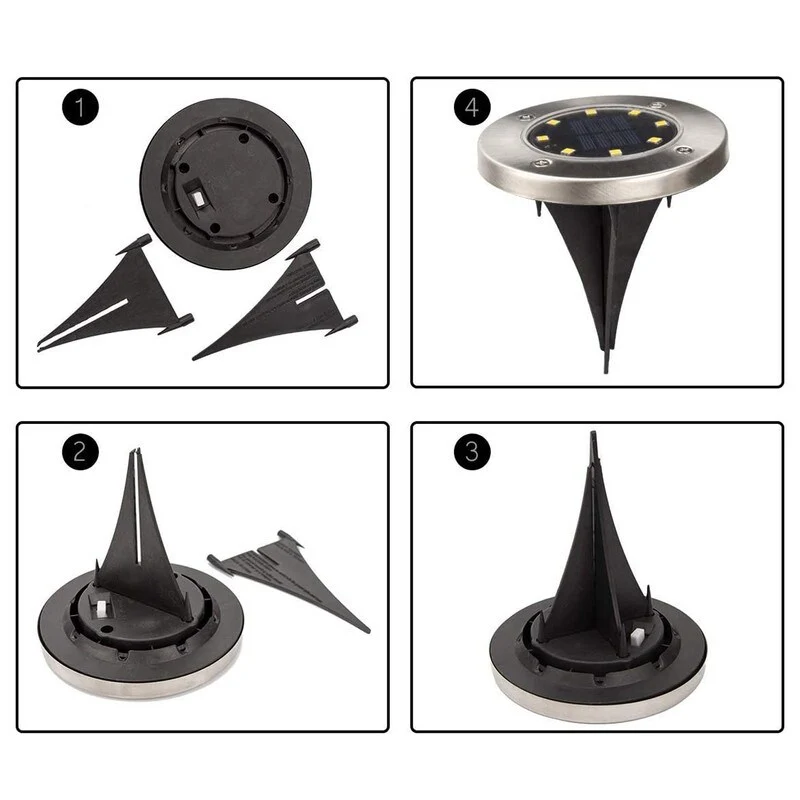 【Solar Charge & Long Working Time 】Unlike other's 4 leds, our solar disk lights consist of 8 LED lights which means producing more light for your path.It can illuminate for 8-10 hours with 4-6 hours of charging.(Charging and working time will change depending on the weather)【 High Level Protection &Advanced lighting】 override material with stainless steel lamp shell, enough strong to withstands inclement weather and 100KG standing body.【Automatic turning on &turning off】The solar ground lights automatically turn on in darkness or at night and turn off in daytime or bright area. Adding perfect lighting for your courtyard,gardens,sidewalks,patio and corridors,pathway.【Easy To Install In-ground&Waterproof】 Turn on the switch under the cap and push the stake into the soil. Adopted IP65 grade waterproof design. No worries about heavy rain, snow, frost, or sleet.【Customer Service】 If you are not satisfied with the Solar Lights, just return them within 90 days for a full refund.