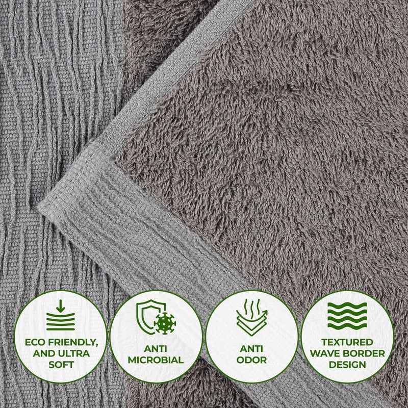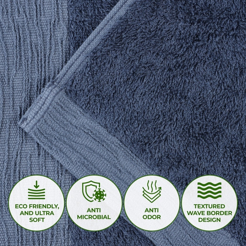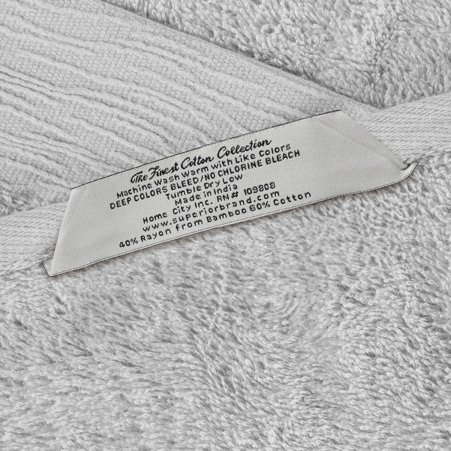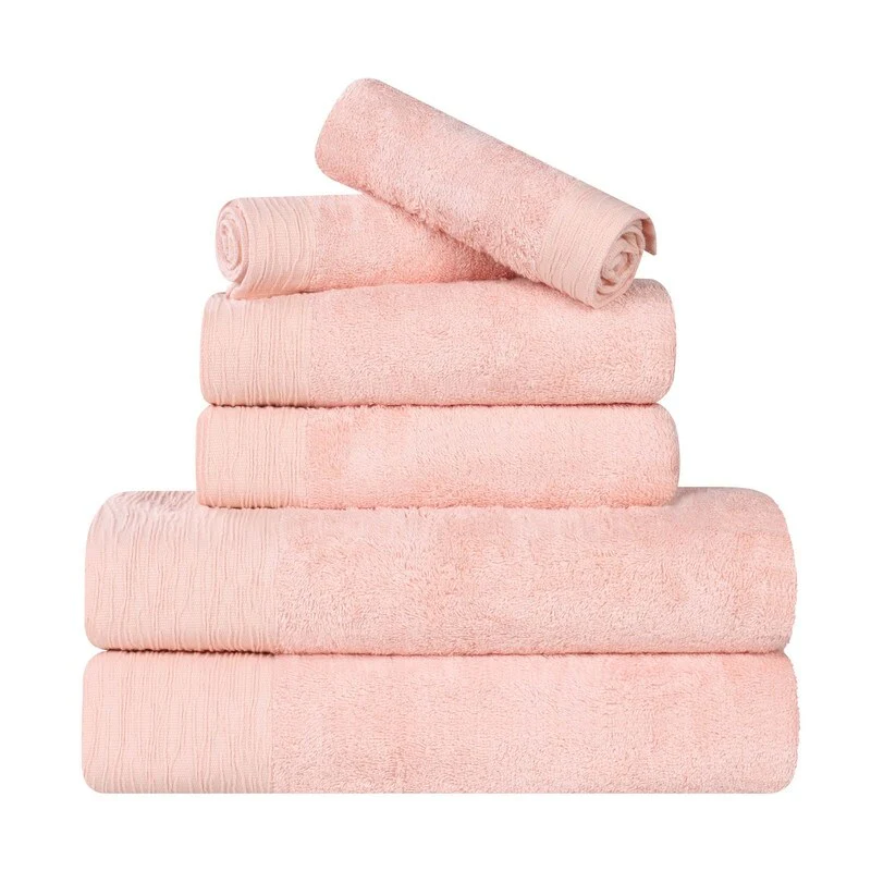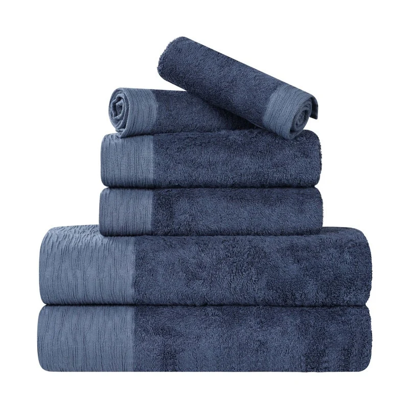 Add eye-catching texture to any bathroom space with the Superior Sierra Rayon From Bamboo Cotton Blend 6 Piece Towel Set. Our fluffy bamboo cotton blend towels have a luxuriously soft feel and are naturally hypoallergenic, ideal for people with allergies or sensitive skin. Featuring an eco-friendly design that stays fresher longer and resists shrinking, wrap yourself in the extra clean feeling of these absorbent towels. Displaying a beautifully textured border, these towels are available in Pink, Navy Blue, Charcoal, Light Blue, White, Ivory, Green, Platinum Grey, and Yellow Gold color options to match your bathroom decor style. This bathroom towel set includes; 2 face towels, 2 hand towels, and 2 bath towels.