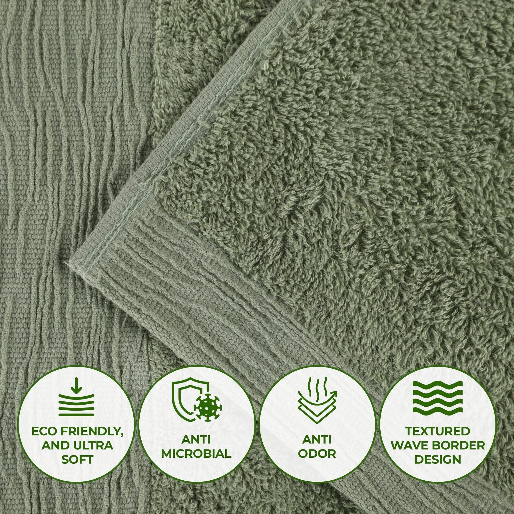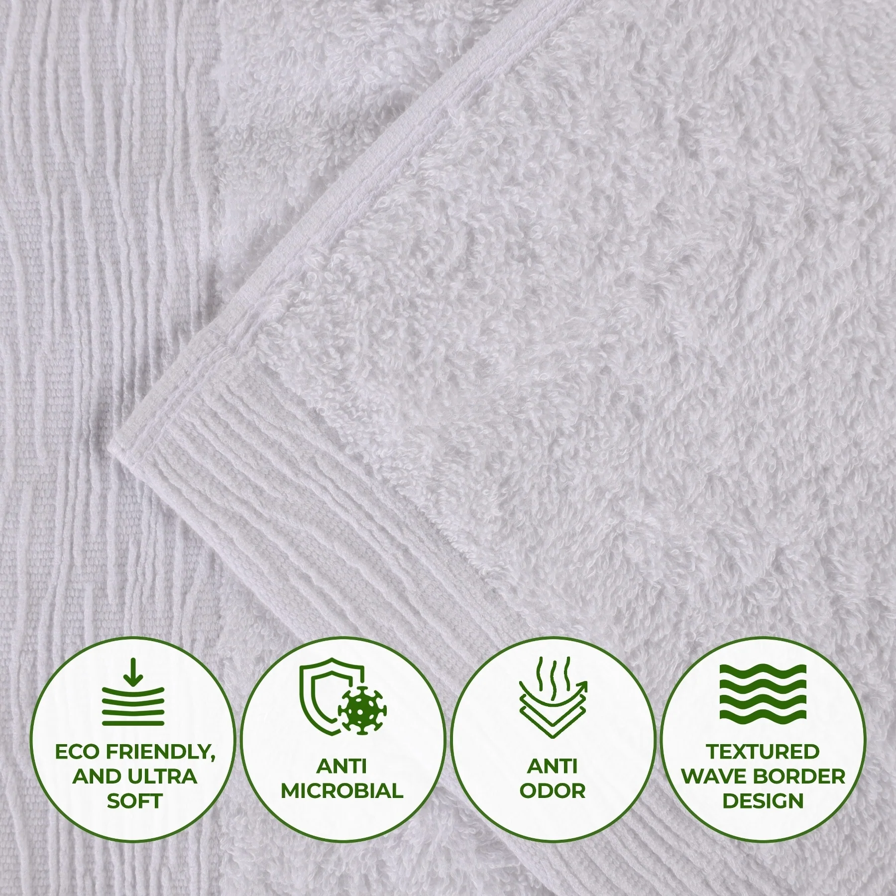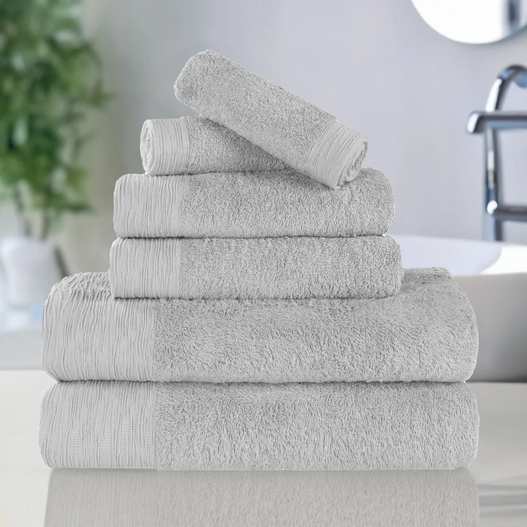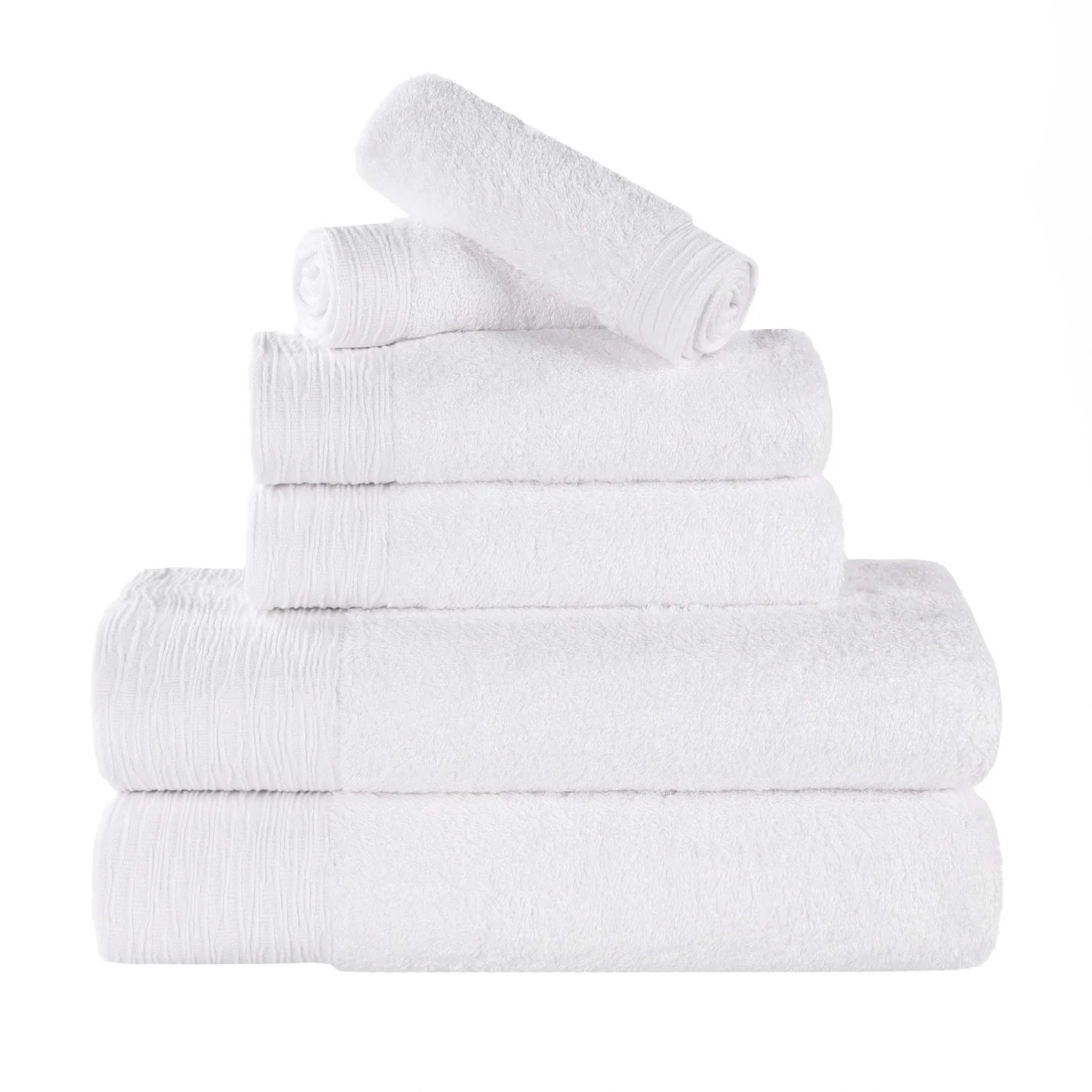 - Set includes: Two (2) Face Towels/ Washcloths, Two (2) Hand Towels, Two (2) Bath Towels
