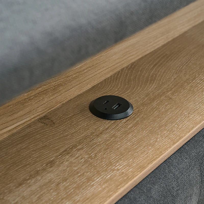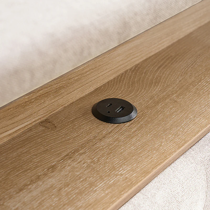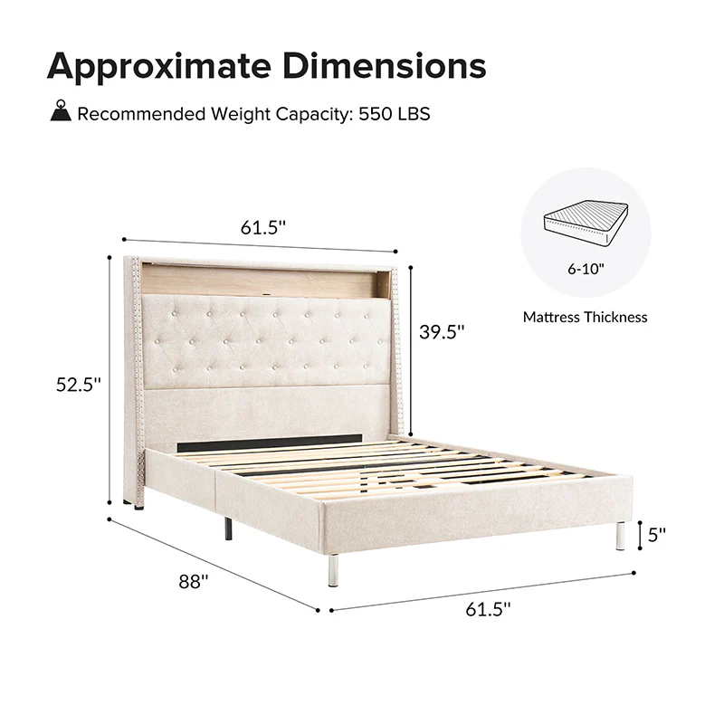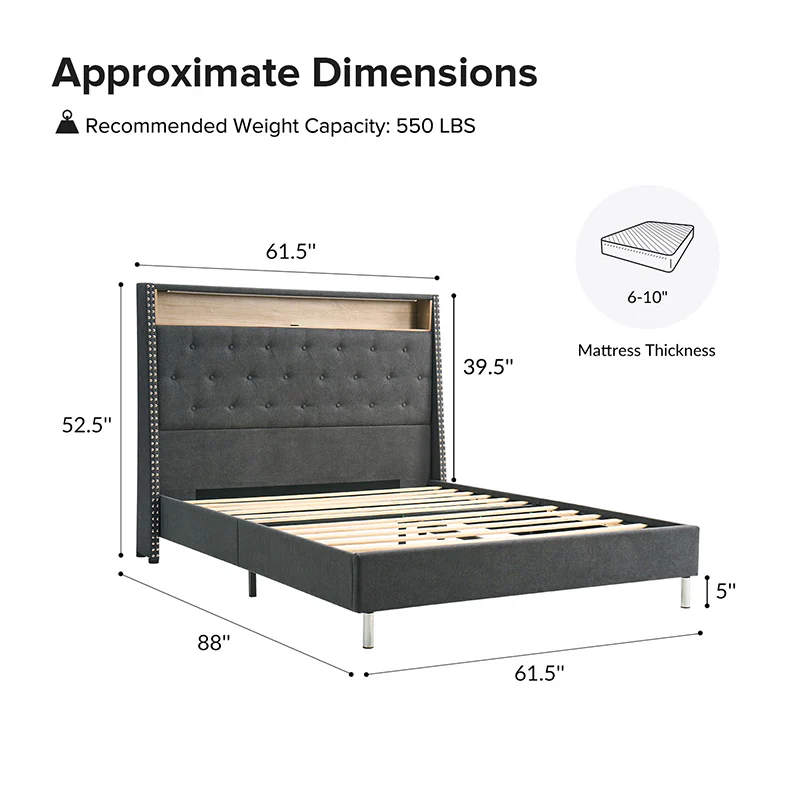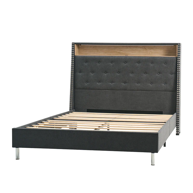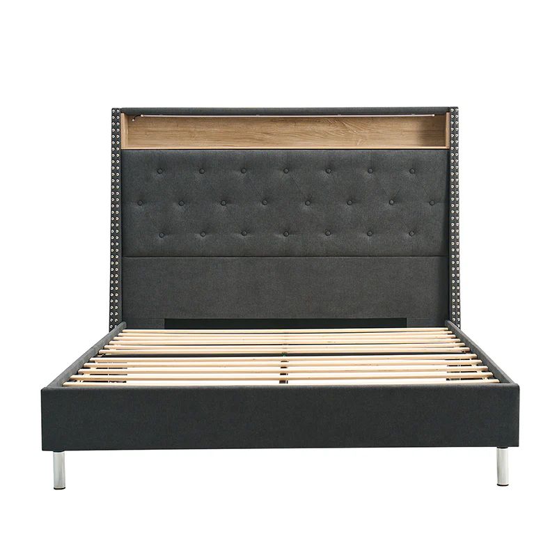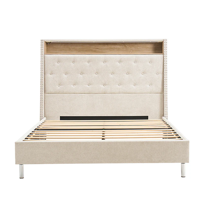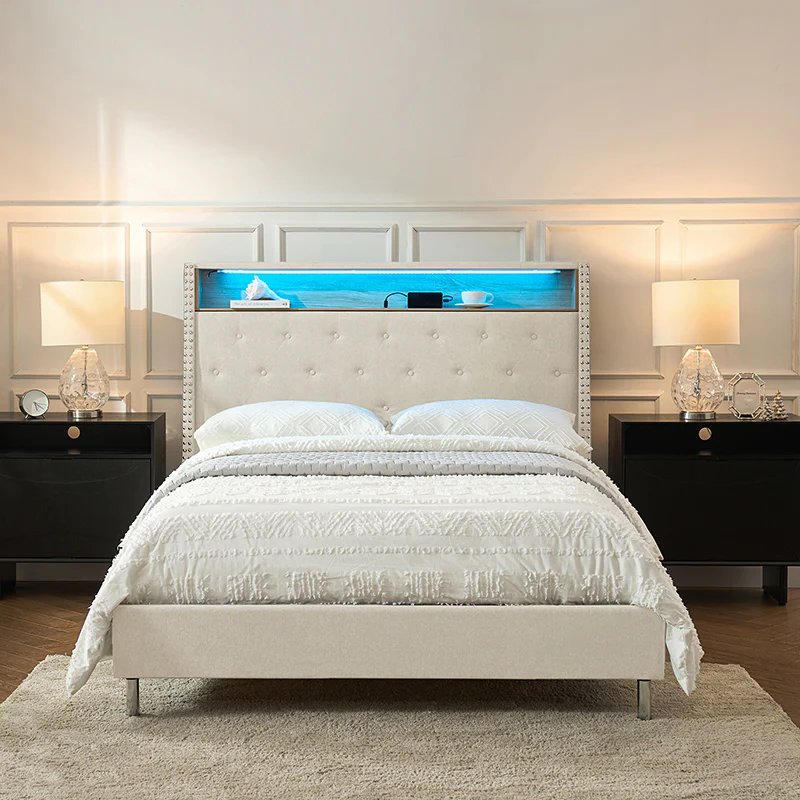 This bed features a warm night light at the headboard, providing gentle illumination for a cozy atmosphere. The headboard also includes convenient storage compartments, suitable for keeping essentials within easy reach. Its design boasts a chic, tufted appearance, adding a touch of elegance to any bedroom decor. The bed is designed with a high headboard, offering added support and a stylish focal point. Additionally, it comes with a built-in power strip, ensuring easy access to power outlets for charging devices or plugging in bedside lamps. Combining functionality with modern design, this bed is both practical and visually appealing, making it an excellent choice for any contemporary living space.