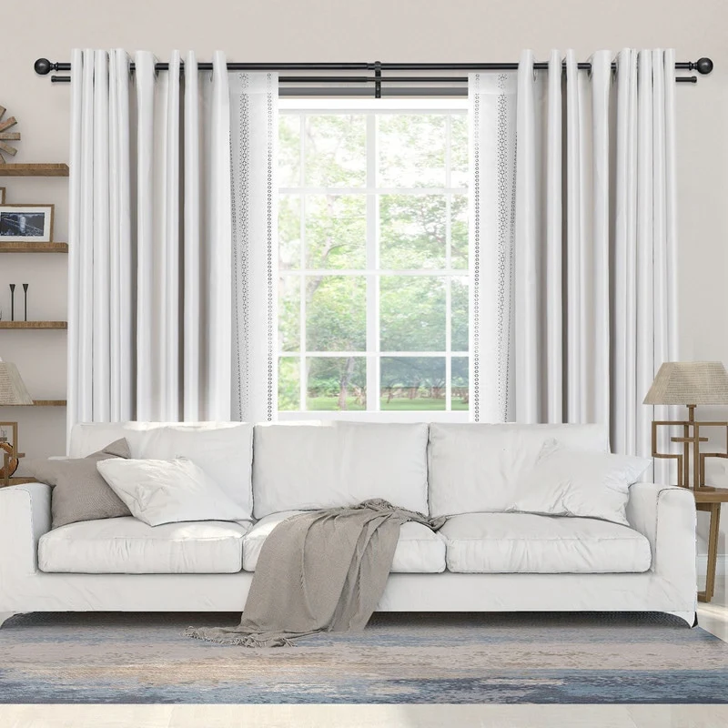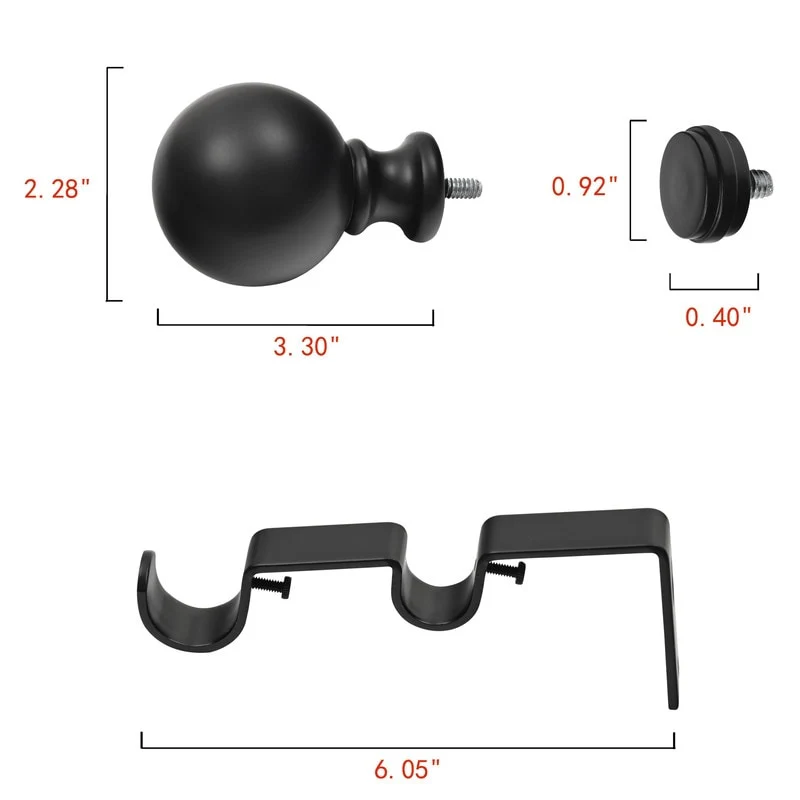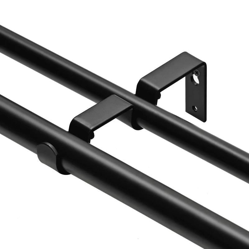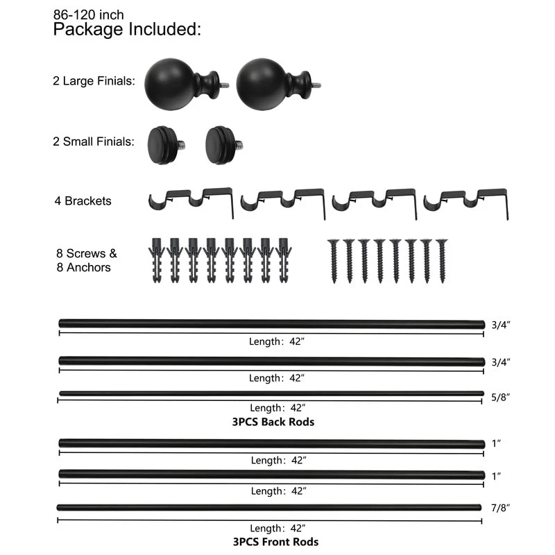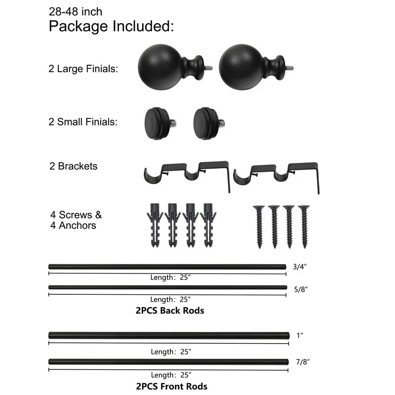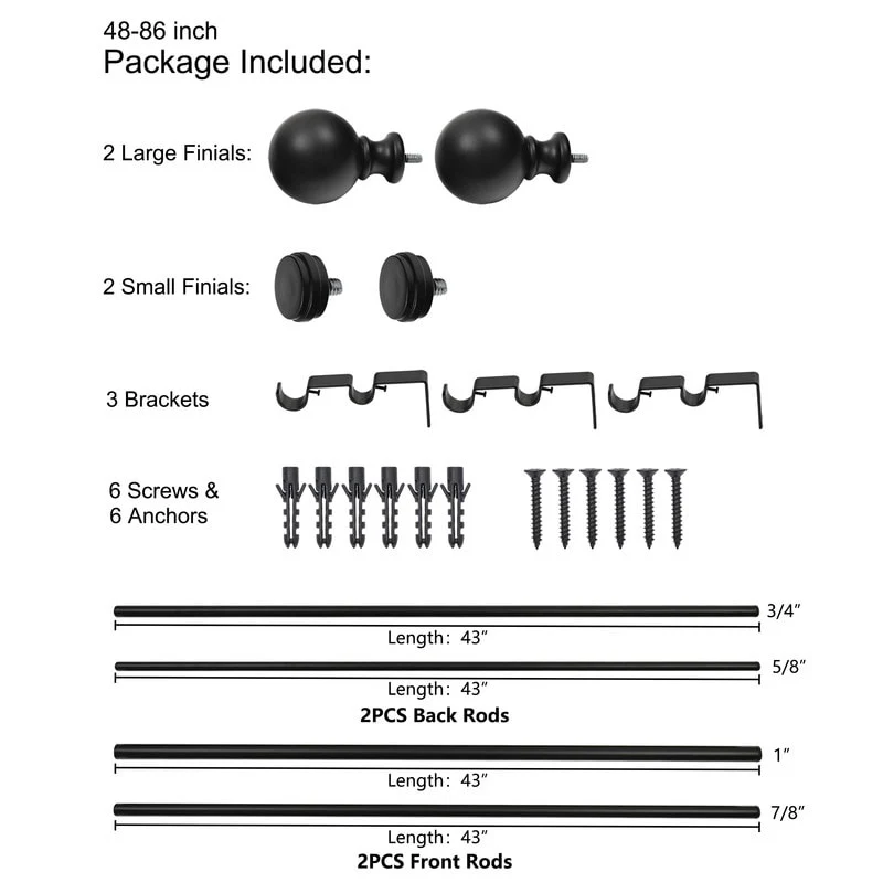 UTOPIA ALLEY Double Curtain Rods are great for any room in the house. Add a touch of elegance to your home with our decorative black curtain rods. This double curtain rod is easy to install and comes with all the necessary hardware to mount it to your wall. These window rods for curtains provide a stylish backdrop for your drapes, which will help set the tone for your decorating scheme.ADJUSTABLE LENGTH:28-48": includes 2 finials, 2 brackets, 2 inner rods, 2 outer rods, 4 screws & 4 anchors.48-86": includes 2 finials, 3 brackets, 2 inner rods, 2 outer rods, 6 screws & 6 anchors.86-120": includes 2 finials, 4 brackets, 2 inner rod, 4 outer rods, 8 screws & 8 anchors.STURDY DURABLE: Crafted from high quality of metal, classic and long lasting, matte finishing, add elegant and new look to your window. Double rods constructions can provide a visually balanced appearance.PERFECT FOR: Front rod for the main thick panels and a back rod for sheer panels. Perfect for creating a layered look. Best choices for light and medium or heavy weight curtains, great for back tab, rod pocket and tab top curtains.ABOUT US: UTOPIA ALLEY is a woman-owned and operated business. Our goal is to provide our customers with furniture, home decor, essentials, and accessories made with durable products and exceptional craftsmanship. We believe in creating a stylish, comfortable space where you can relax, recharge, and feel inspired.