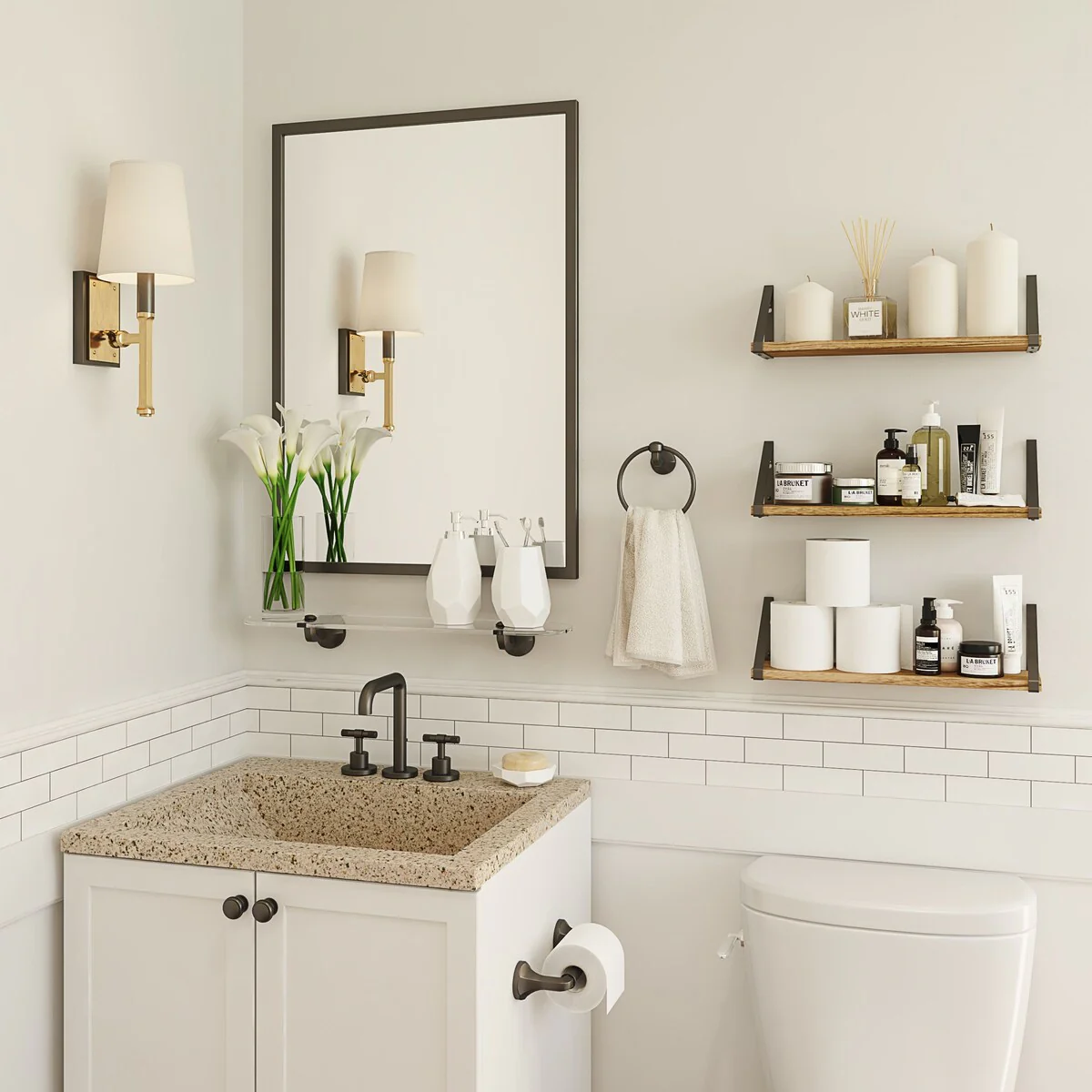 - Rustic Wall Decor: Elevate the look of your bathroom with these chic floating shelves