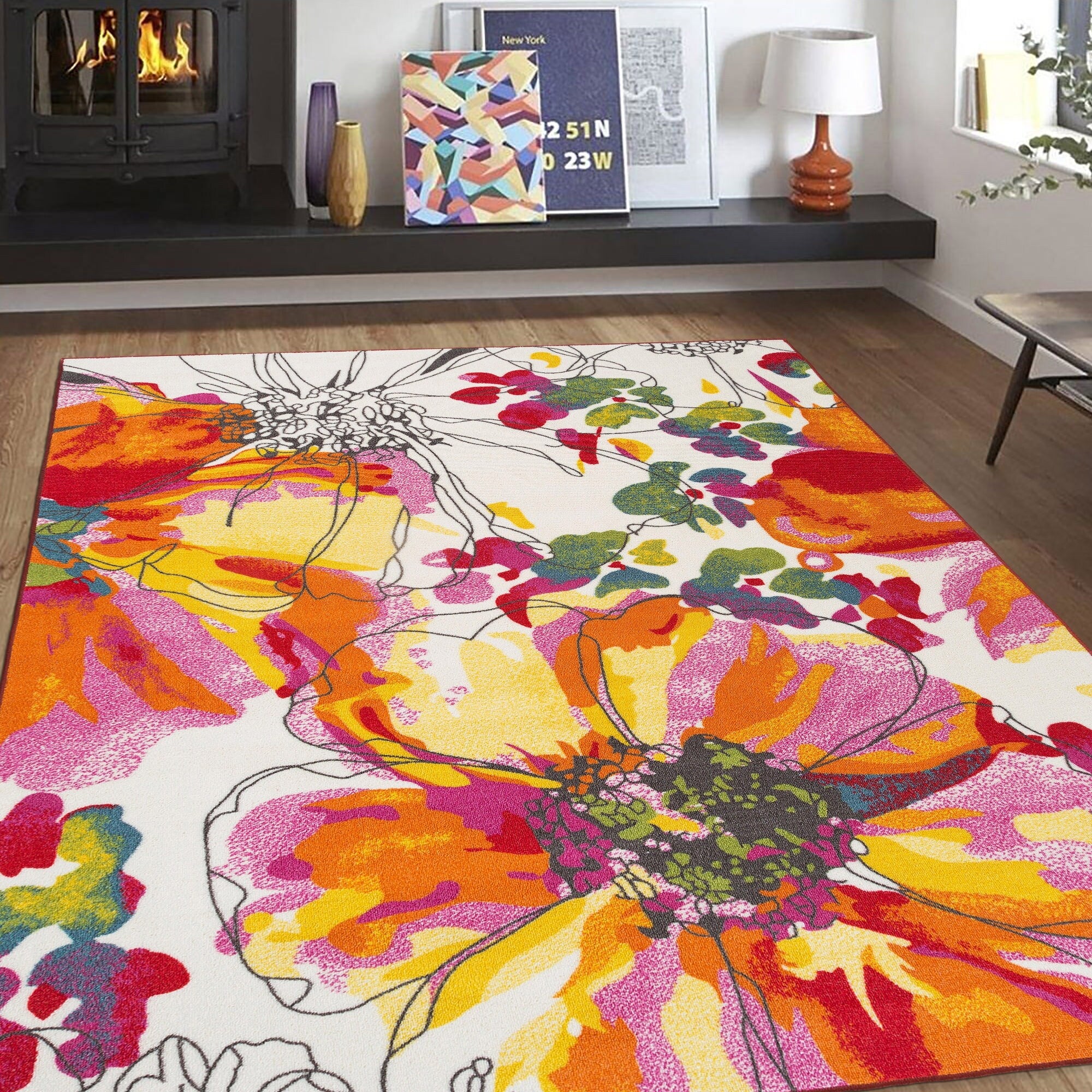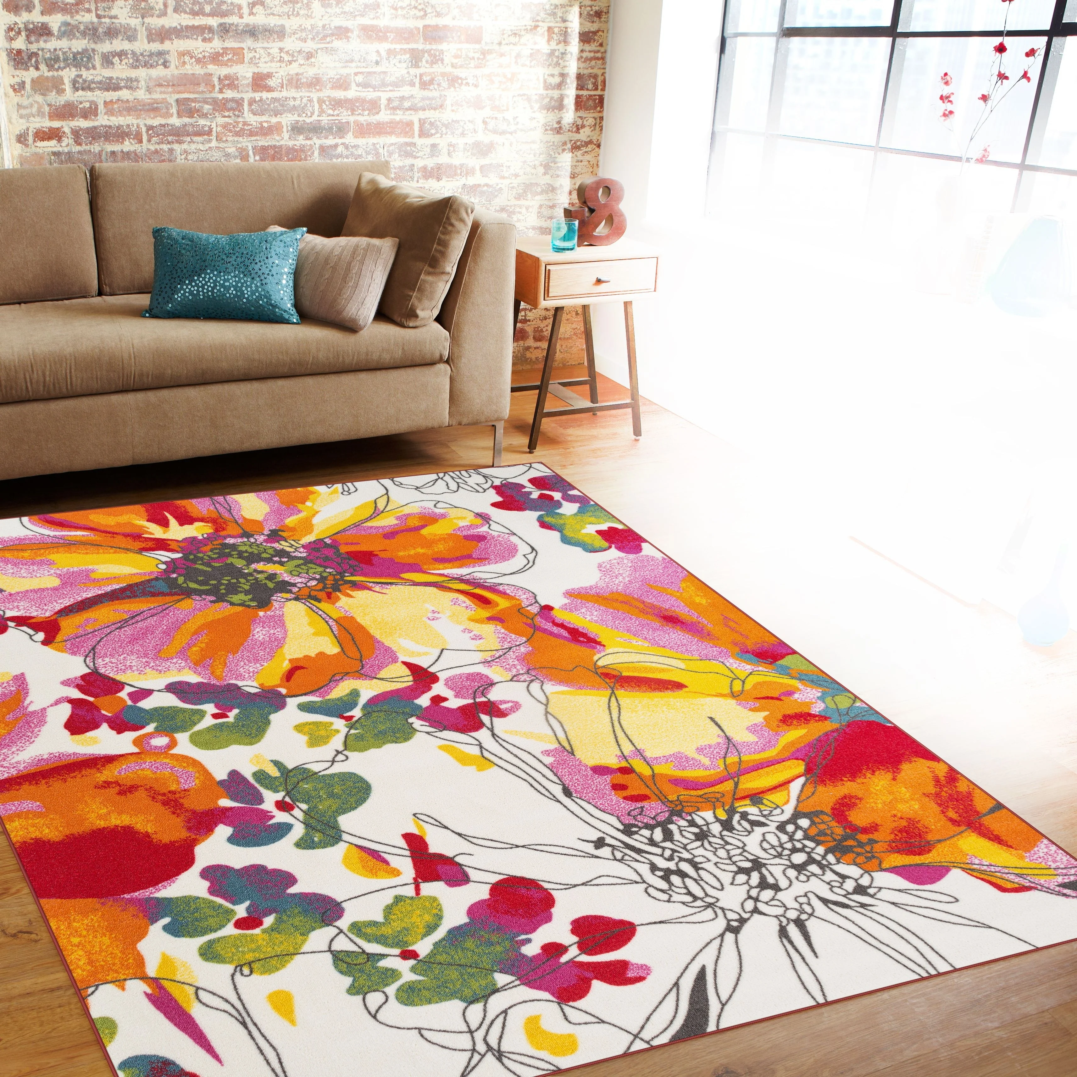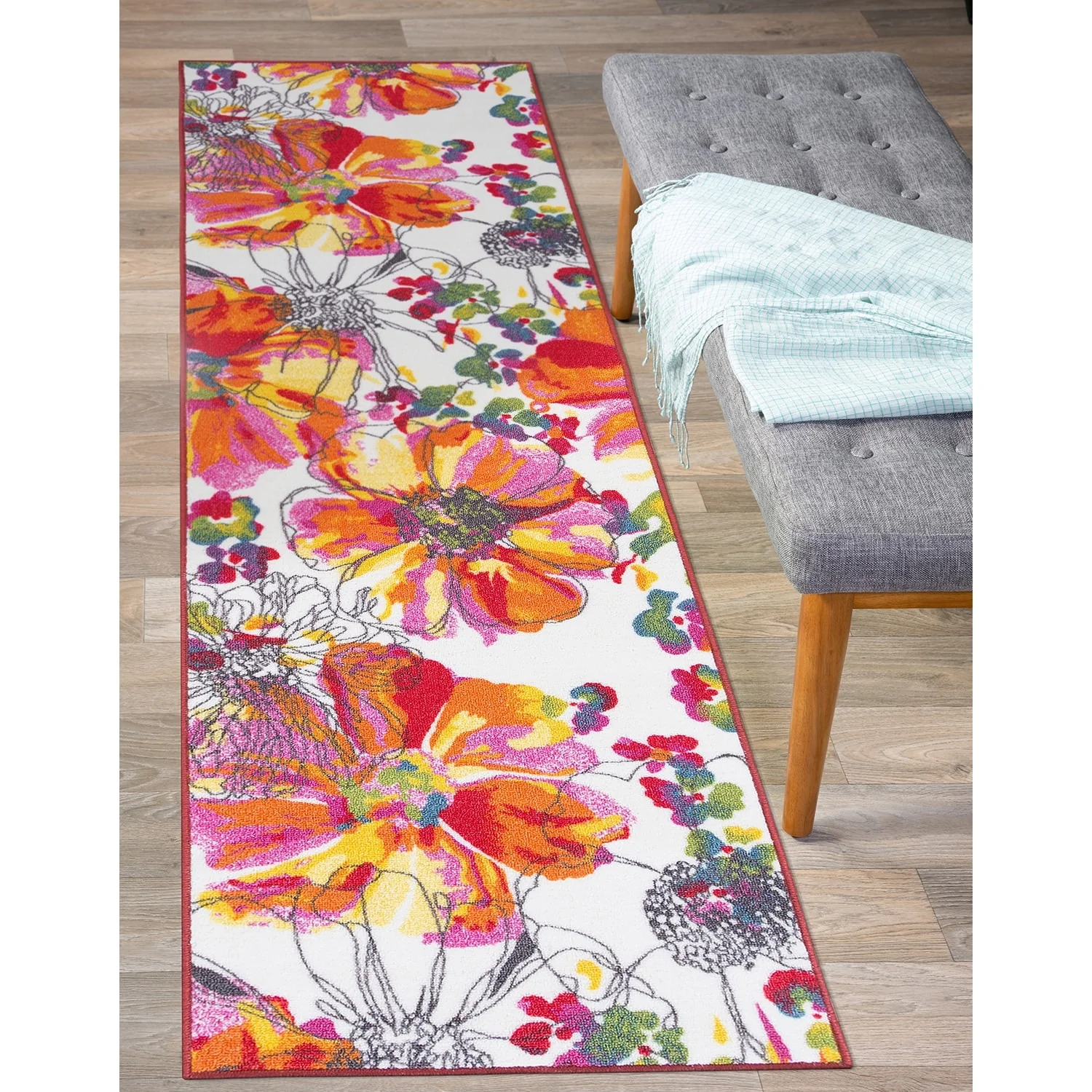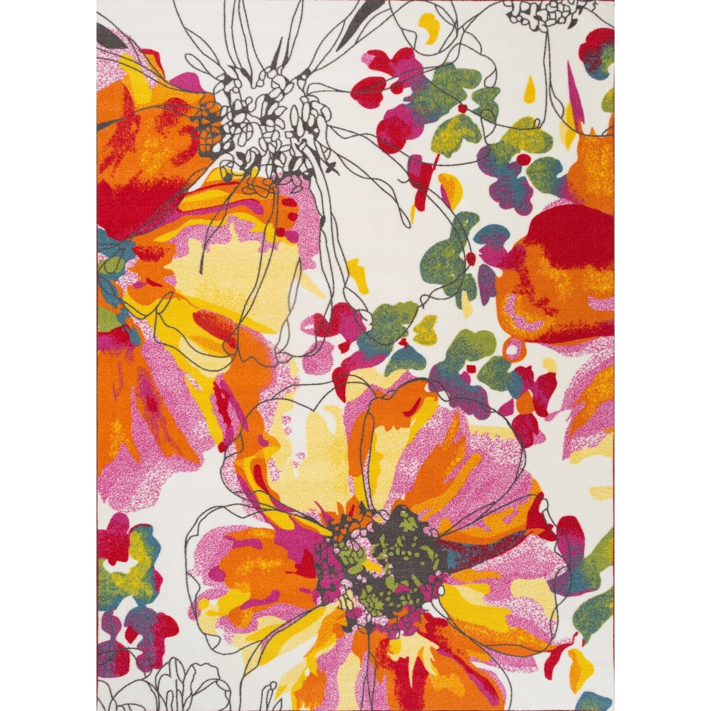 Awaken a sense of fun and vivacity in your home with this OSTI abstract floral area rug woven from stain-resistant nylon. A plethora of bright, warm colors grace a white background, enriching your decor with a dose of flower power. The latex, nonslip backing helps prevent this rug from sliding, providing soft, secure floor coverage underfoot.