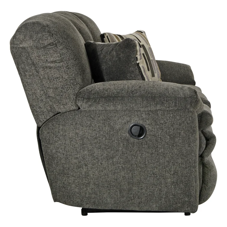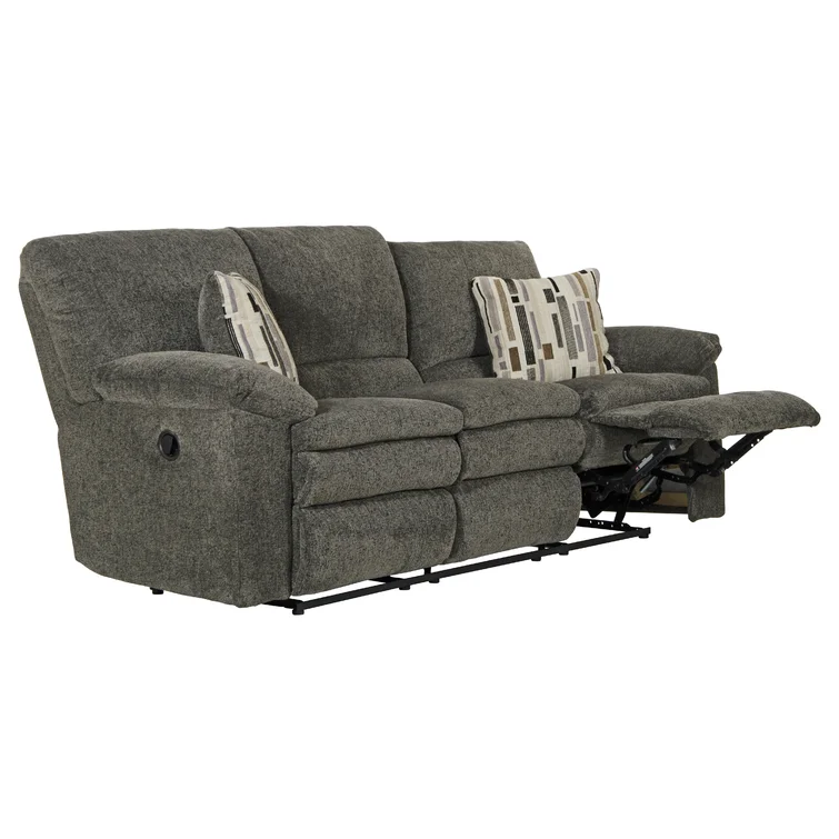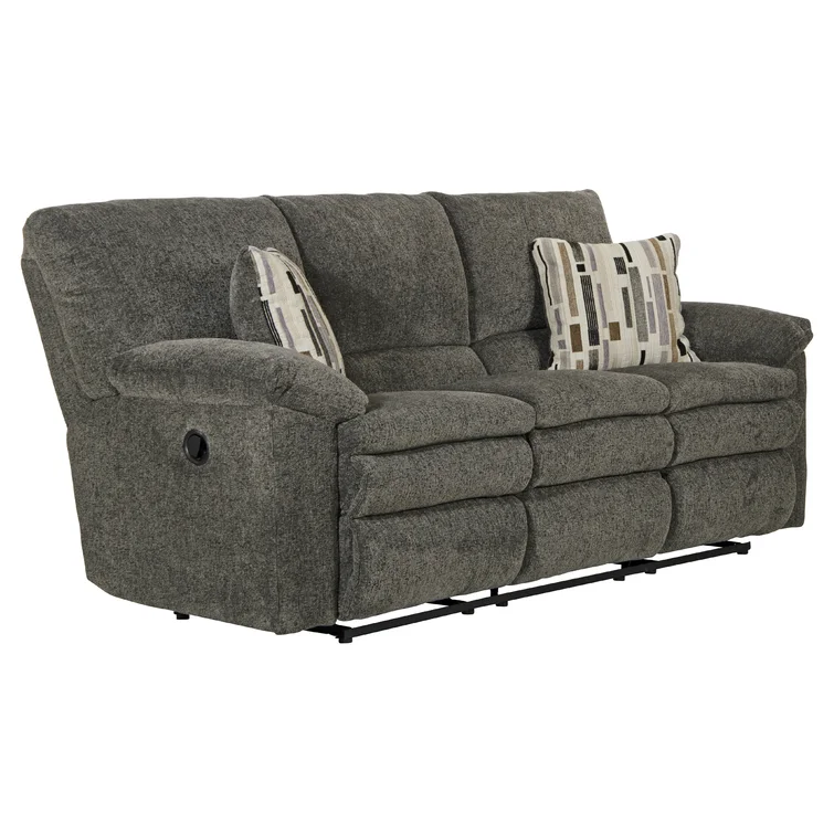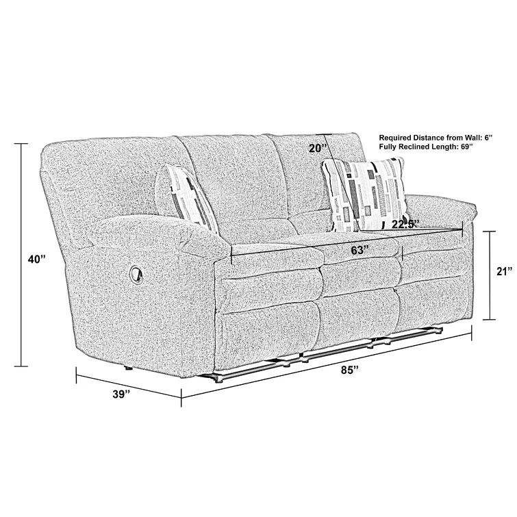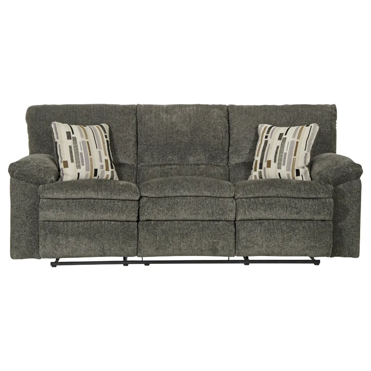 This reclining sofa brings versatile seating to your living space. Made in the USA from metal and a blend of solid and engineered wood, it stands on a plastic base in a black finish. This couch features three reclining seats with split backs and pop-out footrests, each one controlled manually with included levers. Wrapped in 100% polyester upholstery, its foam- and synthetic fiber-filled cushions support you as you sit up or lay down. This sofa's high backs and pillow-top arms create an inviting look. Best of all, no assembly is required: All you need to do is relax.