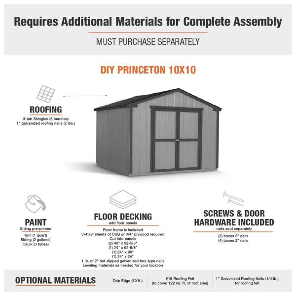 The Handy Home Products Princeton 10 ft. x 10 ft. Storage Shed allows you to customize your shed with paint and shingles (not included) to match your home. The 64 in. W double doors feature full-length hinges and swivel hasps for easy access to large lawn and garden equipment. The sturdy 2 x 3 construction helps to meet the demands of inclement weather. The free treated wood floor frame is ready for plywood or OSB decking (not included) while the patented EZ frame design reduces installation time. Customer is responsible for purchasing additional required materials; shingles, hardware, and floor panels. TO VALIDATE YOUR WARRANTY YOU MUST USE THE FOLLOWING ITEMS.