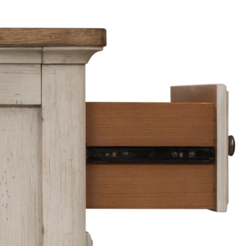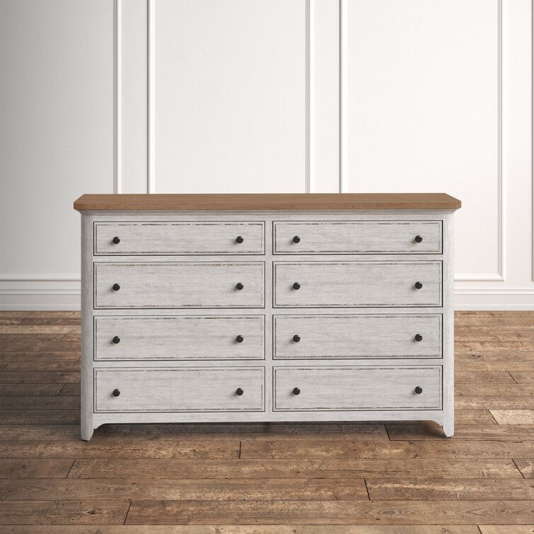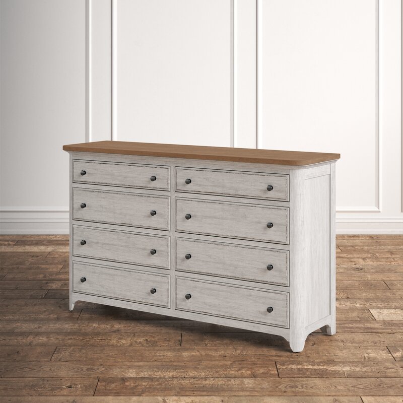 At 66" wide, this 8-drawer double-dresser is just the piece to store clothes, blankets, and other linens in your bedroom. Crafted of pine solids with hickory and pine veneers, featuring distressed panel details on each drawer and both sides for a vintage look. This dresser is finished in an antique white hue, with a contrasting chestnut panel up top that nods to a French country-inspired design. Each drawer has dovetail construction and sits on ball bearing glides, and the top drawers are lined with felt for delicate items. Plus, a wall anchor is included for added safety. Hand-curated by Kelly Clarkson.Not Included:Dresser Mirror