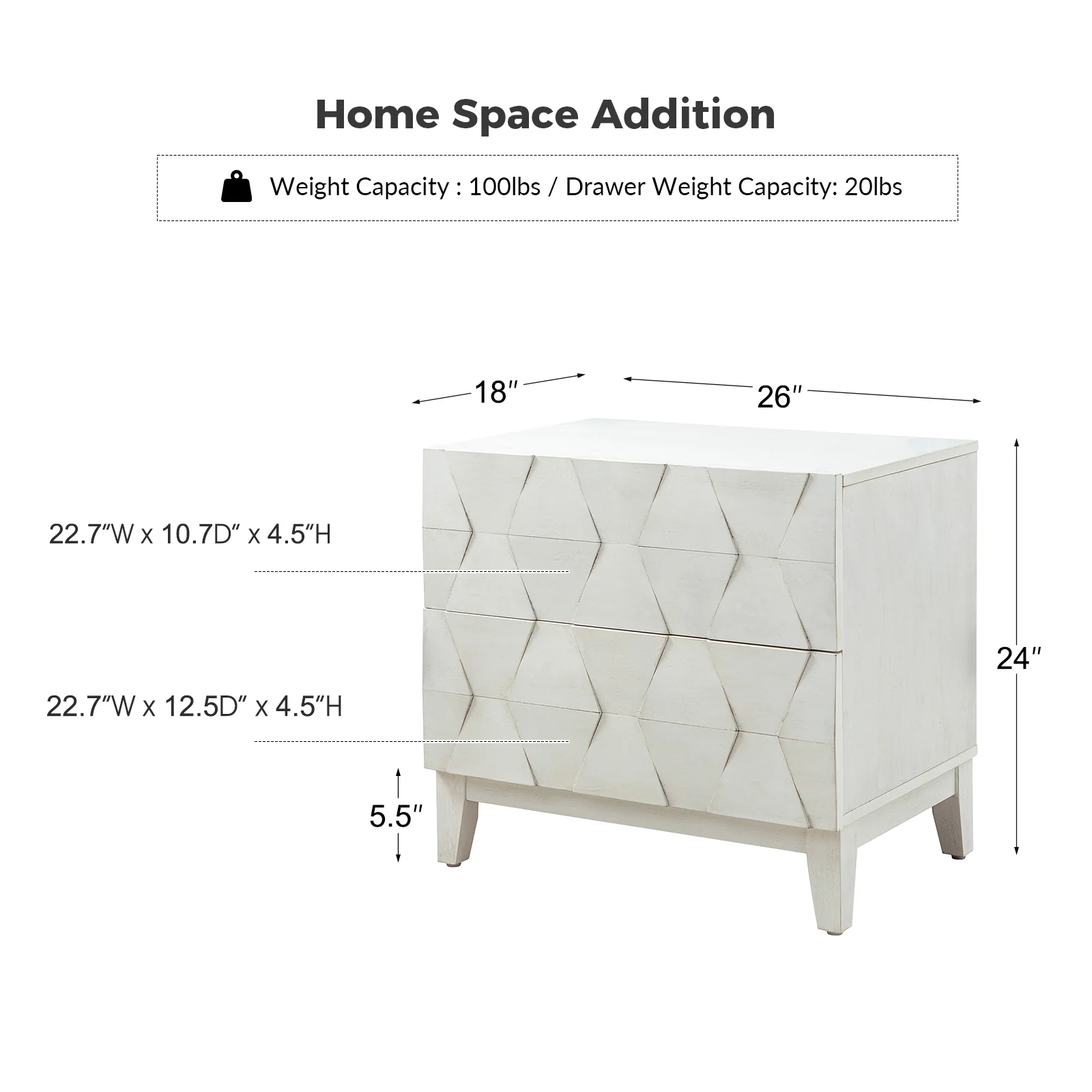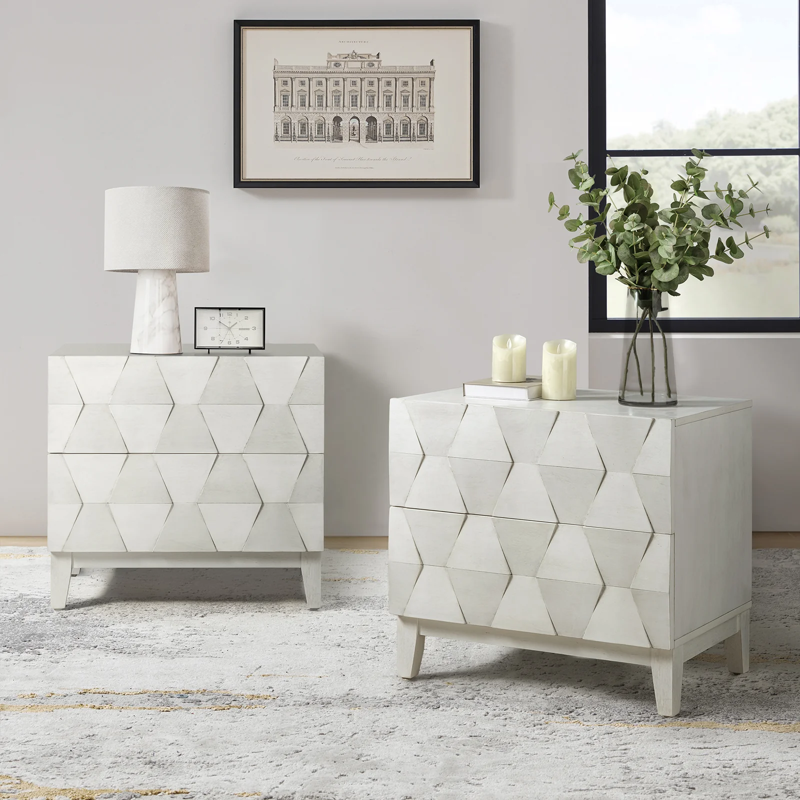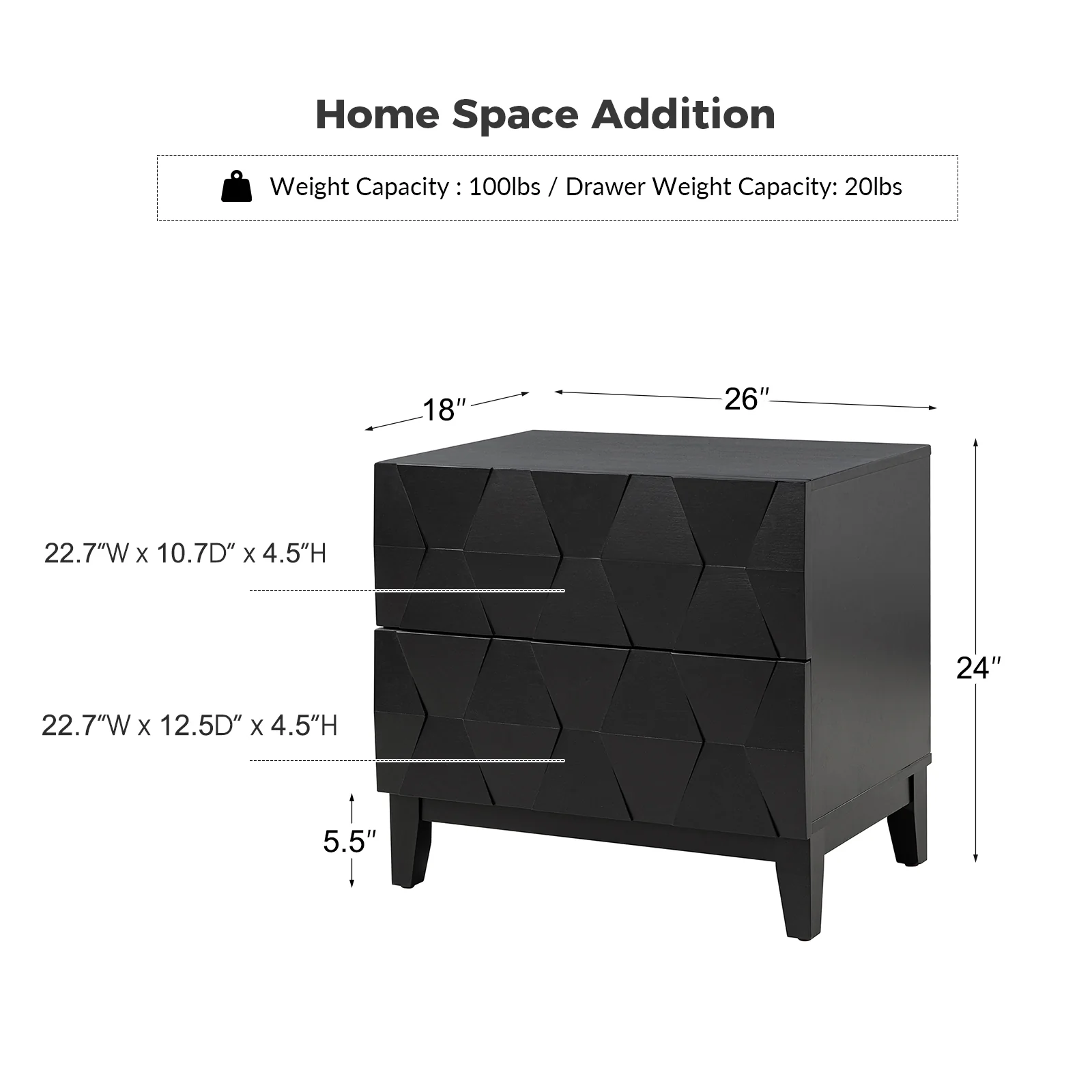 Introducing the sleek and highly functional contemporary nightstand with a built-in charging station. Crafted from solid and engineered wood, this exquisite piece stands gracefully on tapered legs. Its door fronts feature captivating hexagonal embellishments, adding a subtle visual texture and dimension to its design. Furthermore, the nightstand boasts a thoughtfully designed back panel equipped with an outlet and discreet wire hiding space, enabling effortless connectivity to power for charging your smartphones, tablets, or smartwatches as you rest. This mid-century modern and modern nightstand effortlessly integrates into your bedroom, living room, study, or even office, seamlessly harmonizing with your interior style for a truly refined aesthetic.